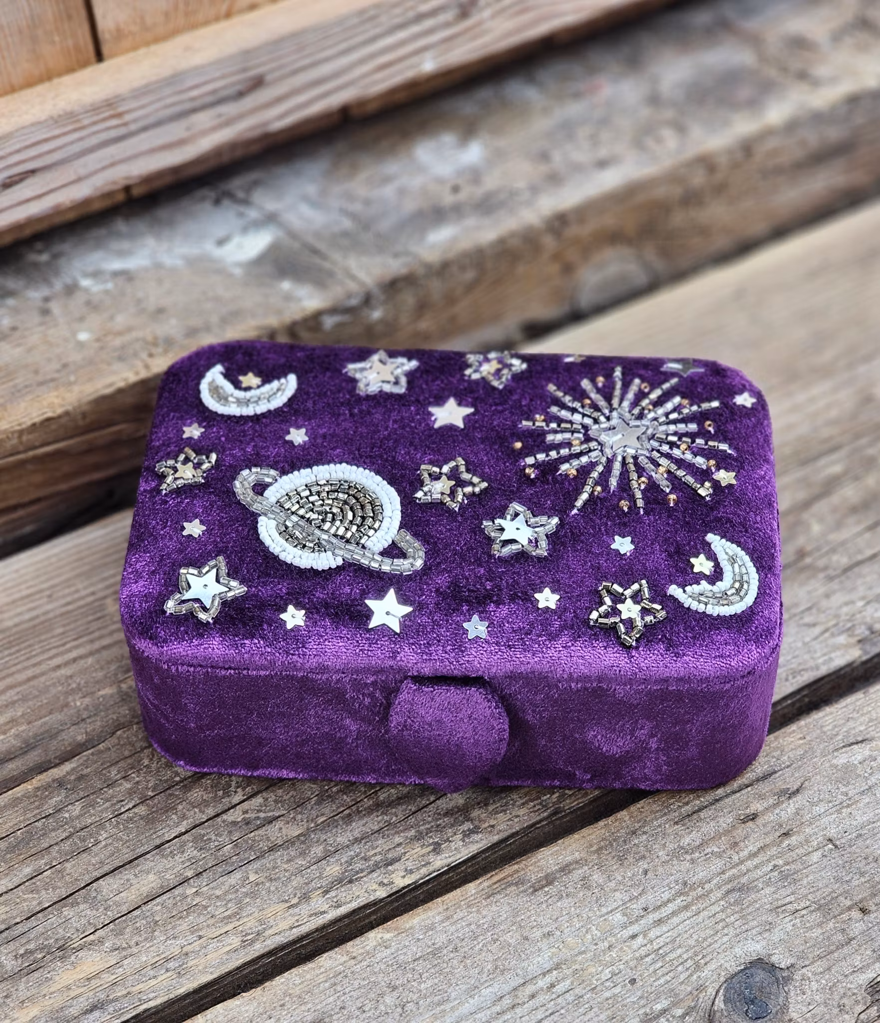 Vacker förvaringsask i sammet med fina broderier och pärlor. Mörklila med stjärnor & planeter, som en vacker galax. En vacker förvaring till små skatter. De läckra färgerna och detaljerna ger denna ask en unik närvaro i ditt hem. Idealisk för smycken, tarotkort, kristaller och andra vackra små ting. Ett litet band med en knapp håller dina tillhörigheter säkra. Säljes styckvis, smycken/kristaller/tarotkort ingår ej. Du köper en slumpvis liknande produkt enligt text & bild ovan. Tänk på att små avvikelser i utseende kan förekomma. Färger kan skilja sig beroende på hur ljuset faller ner på produkten samt även mellan olika bildskärmar m.m.
