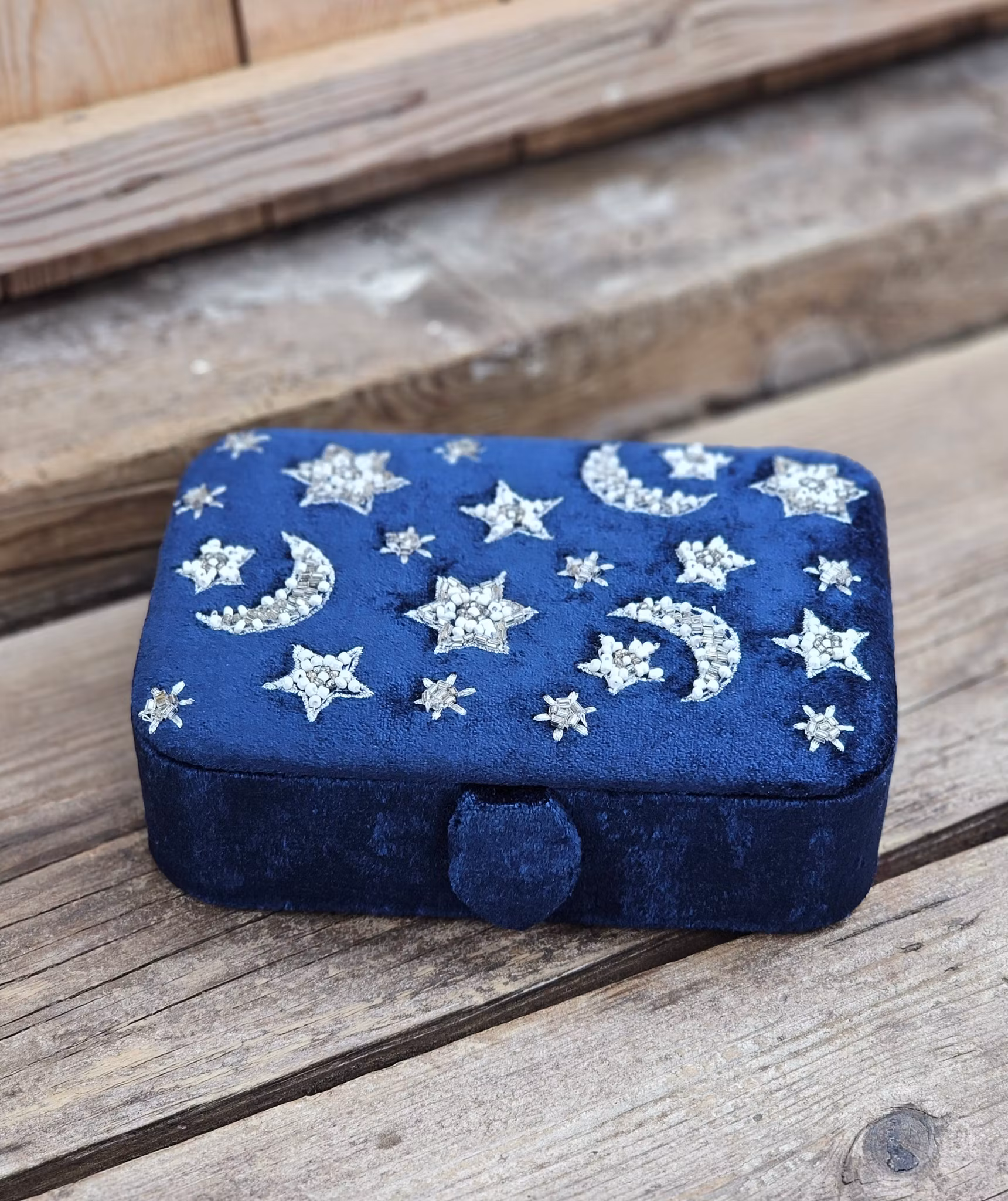 Vacker förvaringsask i sammet med fina broderier och pärlor. Djupblå med stjärnor och månar, som en natthimmel. En vacker förvaring till små skatter. De läckra färgerna och detaljerna ger denna ask en unik närvaro i ditt hem. Idealisk för smycken, tarotkort, kristaller och andra vackra små ting. Ett litet band med en knapp håller dina tillhörigheter säkra. Säljes styckvis, smycken/kristaller/tarotkort ingår ej. Du köper en slumpvis liknande produkt enligt text & bild ovan. Tänk på att små avvikelser i utseende kan förekomma. Färger kan skilja sig beroende på hur ljuset faller ner på produkten samt även mellan olika bildskärmar m.m.