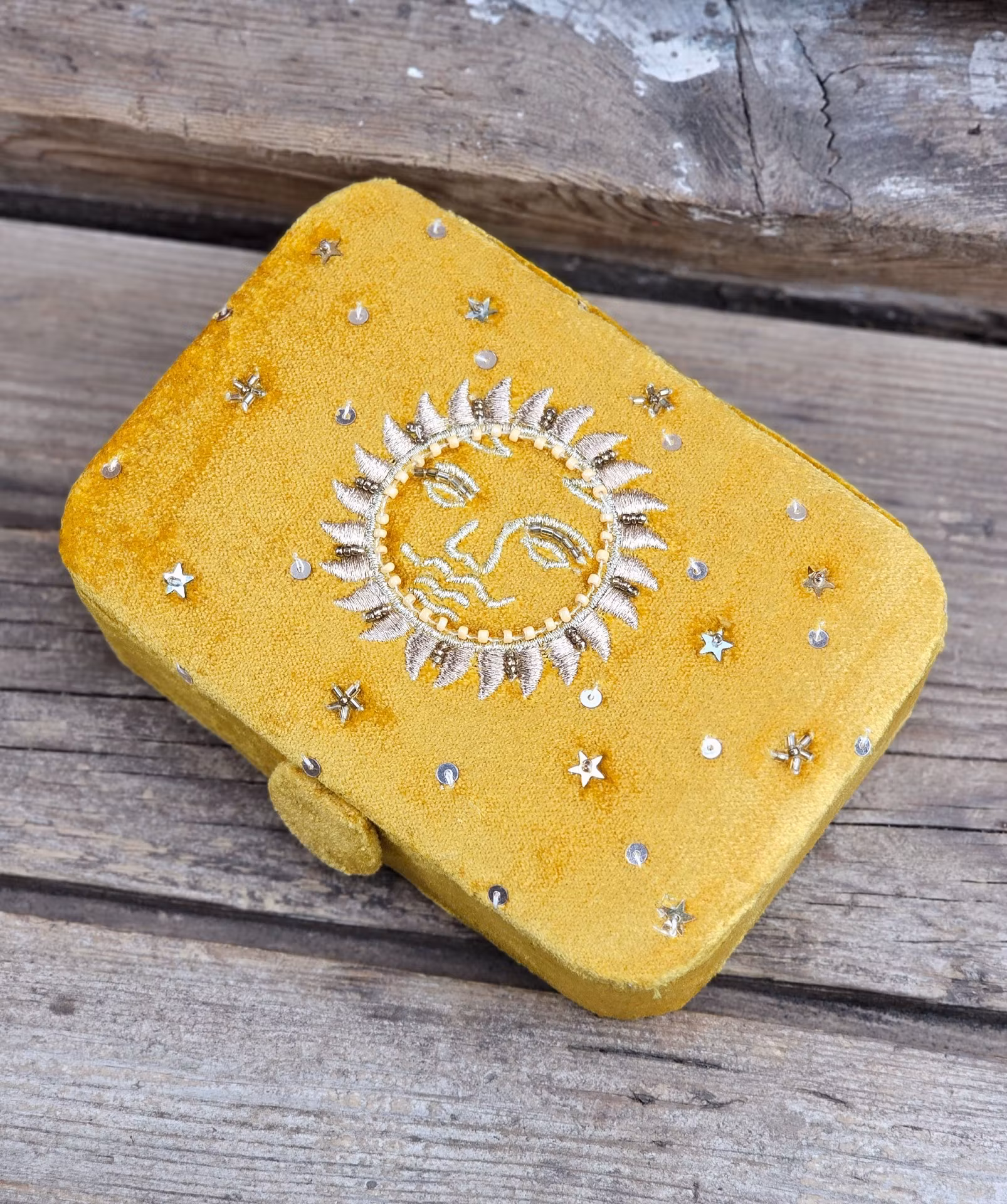 Vacker förvaringsask med fina broderier och pärlor. Med en solsymbol på. Genom historien har solsymbolen förblivit en kraftfull representation av liv, energi & andlighet. Solens närvaro i olika kulturer och trossystem visar upp dess bestående betydelse som en symbol för hopp, förnyelse och gudomlighet. En vacker förvaring till små skatter. De läckra färgerna och detaljerna ger denna ask en unik närvaro i ditt hem. Idealisk för smycken, tarotkort, kristaller och andra vackra små ting. Ett litet band med en knapp håller dina tillhörigheter säkra. Säljes styckvis, smycken/kristaller/tarotkort ingår ej. Du köper en slumpvis liknande produkt enligt text & bild ovan. Tänk på att små avvikelser i utseende kan förekomma. Färger kan skilja sig beroende på hur ljuset faller ner på produkten samt även mellan olika bildskärmar m.m.
