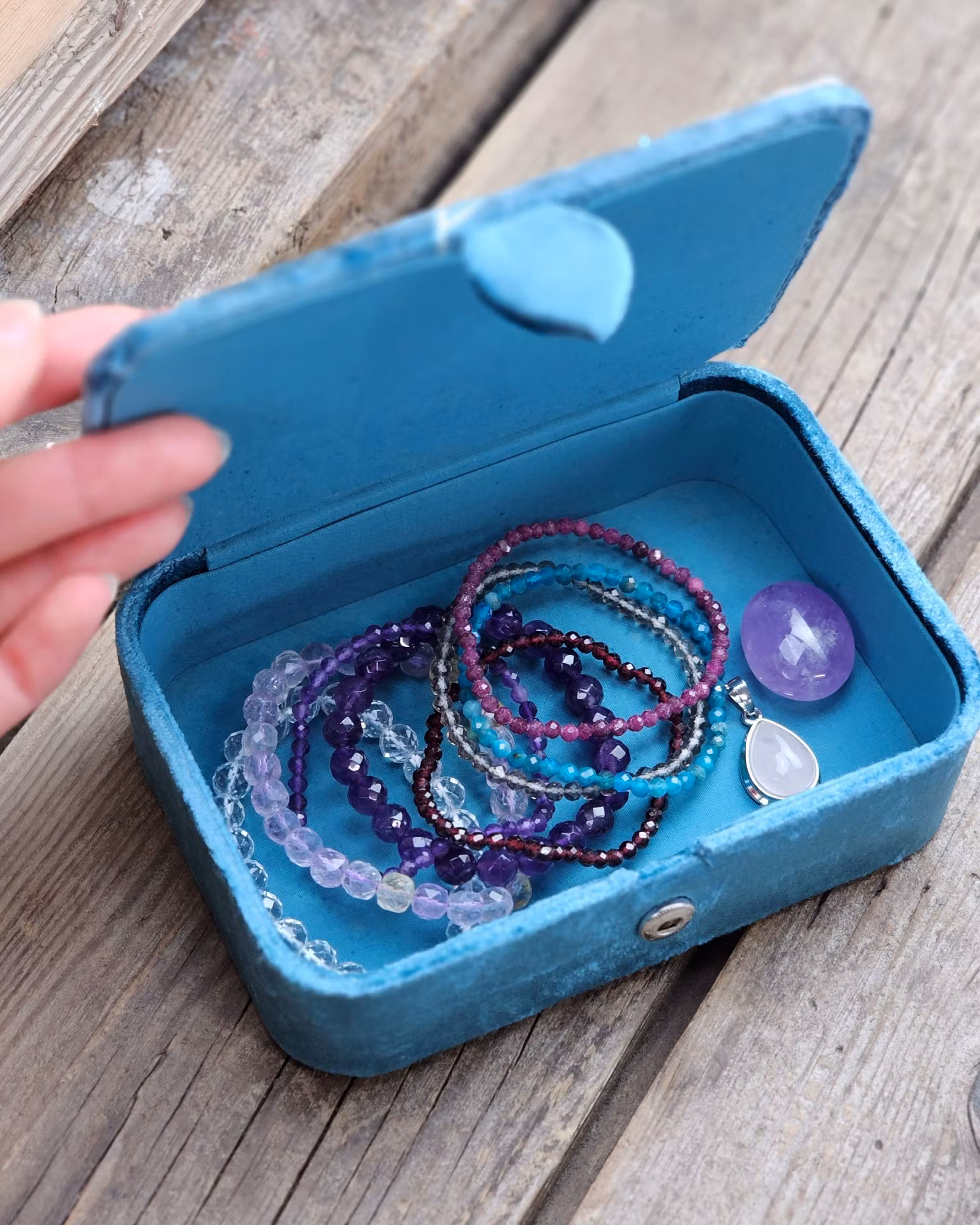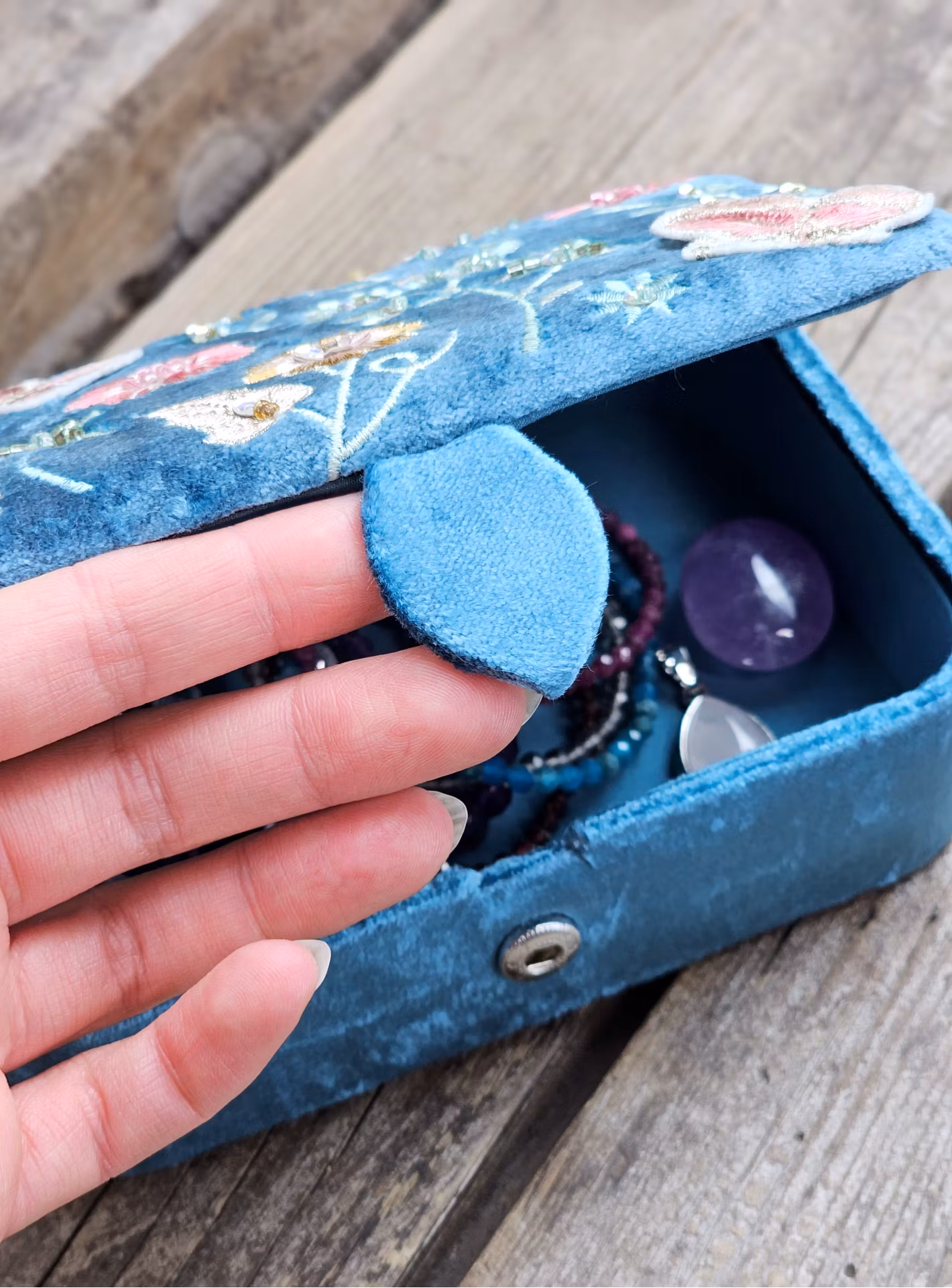 Vacker förvaringsask i sammet med fina broderier och pärlor. En vacker förvaring till små skatter. De läckra färgerna och detaljerna ger denna ask en unik närvaro i ditt hem. Idealisk för smycken, tarotkort, kristaller och andra vackra små ting. Ett litet band med en knapp håller dina tillhörigheter säkra. Säljes styckvis, smycken/kristaller/tarotkort ingår ej. Du köper en slumpvis liknande produkt enligt text & bild ovan. Tänk på att små avvikelser i utseende kan förekomma. Färger kan skilja sig beroende på hur ljuset faller ner på produkten samt även mellan olika bildskärmar m.m.