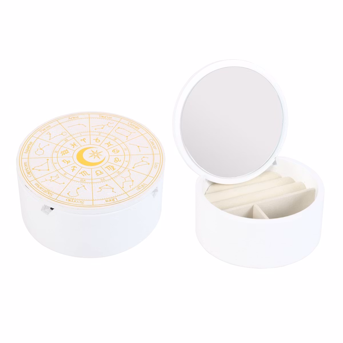 Elegant vit smyckesask med astrologihjul och noggranna detaljer, prydd med guldfolie. Perfekt för säker förvaring av halsband, ringar och armband. Locket har spegel för enkel påtagning. Säljs styckvis; smycken/kristaller ingår ej. Färger kan upplevas olika beroende på ljus och skärm.