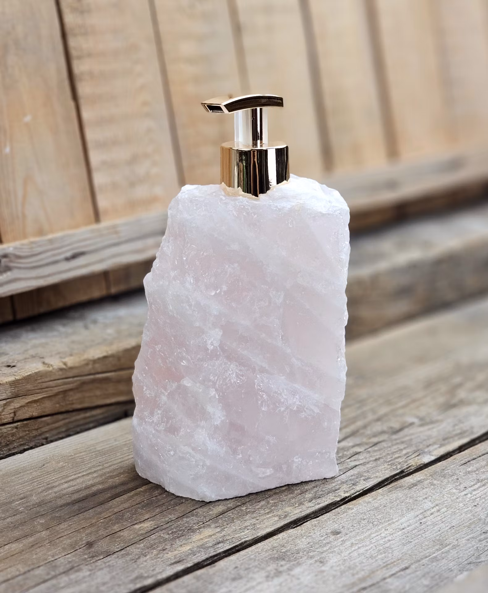 Vacker pump i rå Rosenkvarts, helt fantastisk detalj i hemmet till t.ex. handkräm eller tvål. Pump i guldfärg. Kristallen på bilderna är den du köper. Tänk på att kristaller kommer från naturen, små skillnader kan därför förekomma i produktens utseende på grund av dess naturmaterial. Färger kan skilja sig beroende på hur ljuset faller ner på kristallen samt även mellan olika bildskärmar m.m.
