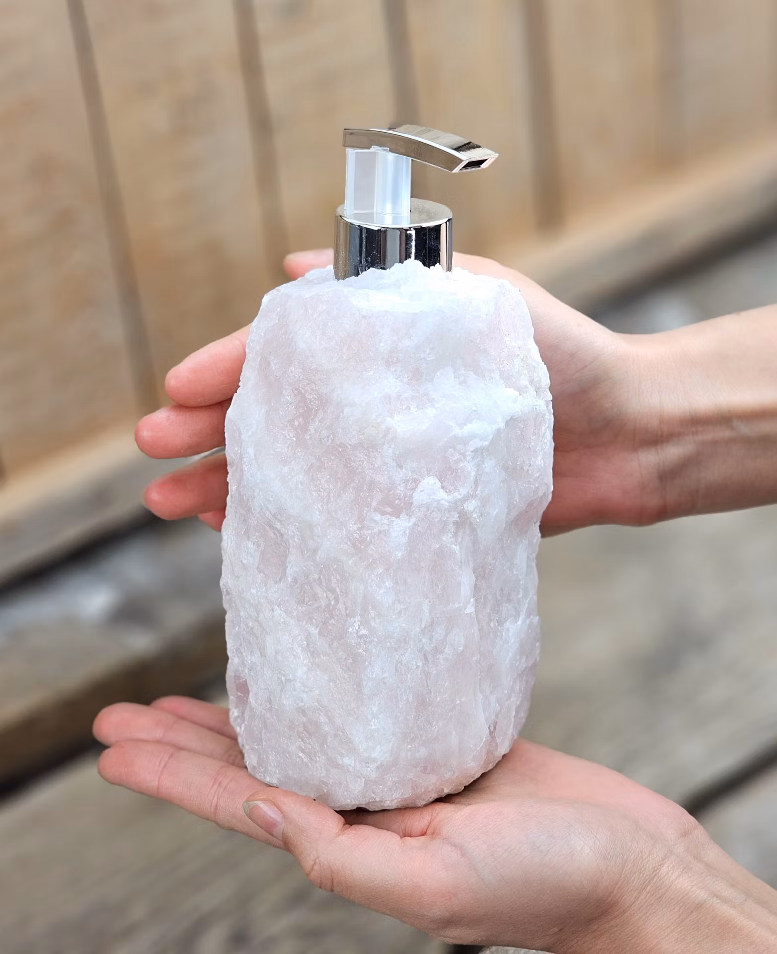 Vacker pump i rå Rosenkvarts, helt fantastisk detalj i hemmet till t.ex. handkräm eller tvål. Pump i silverfärg. Kristallen på bilderna är den du köper. Tänk på att kristaller kommer från naturen, små skillnader kan därför förekomma i produktens utseende på grund av dess naturmaterial. Färger kan skilja sig beroende på hur ljuset faller ner på kristallen samt även mellan olika bildskärmar m.m.