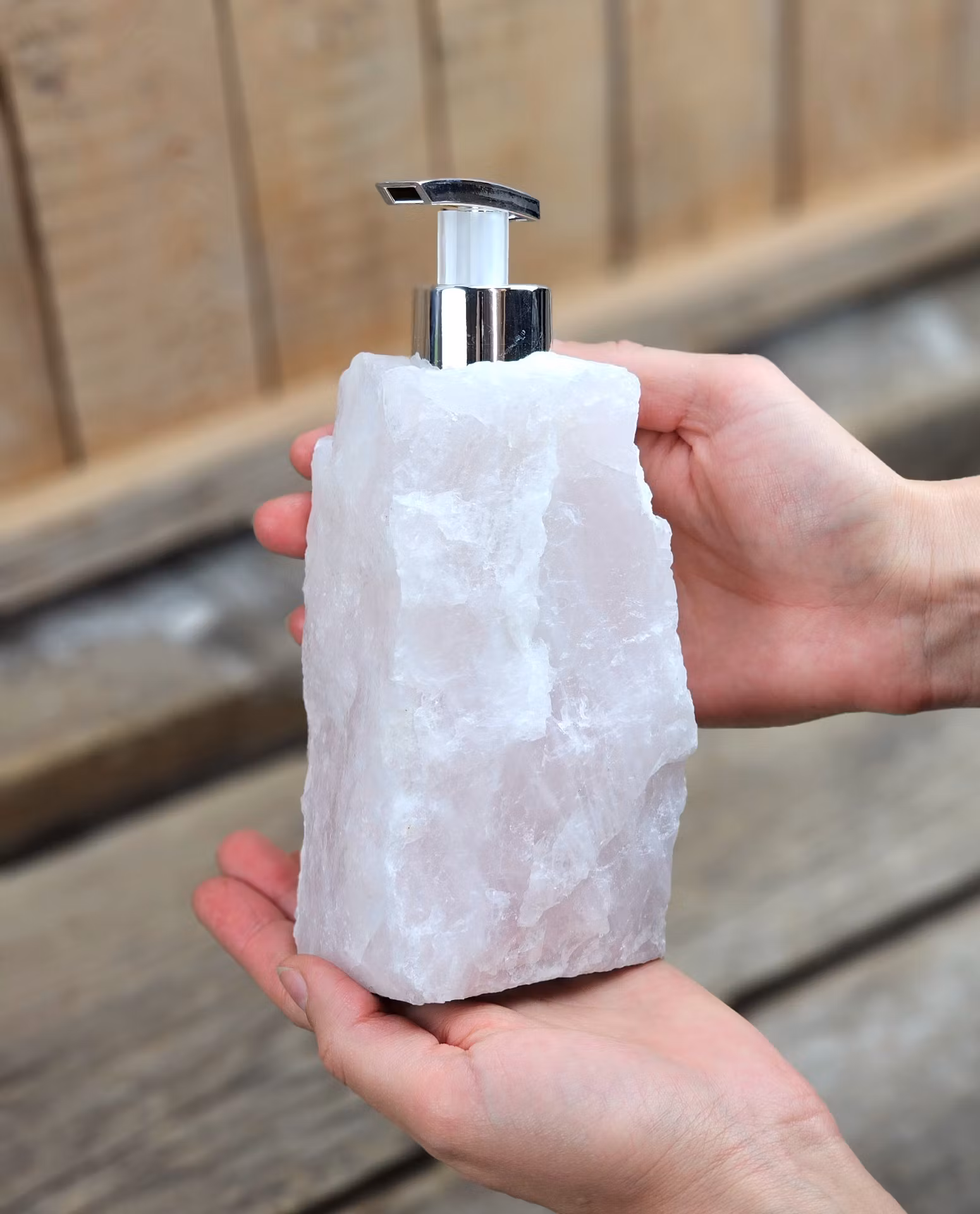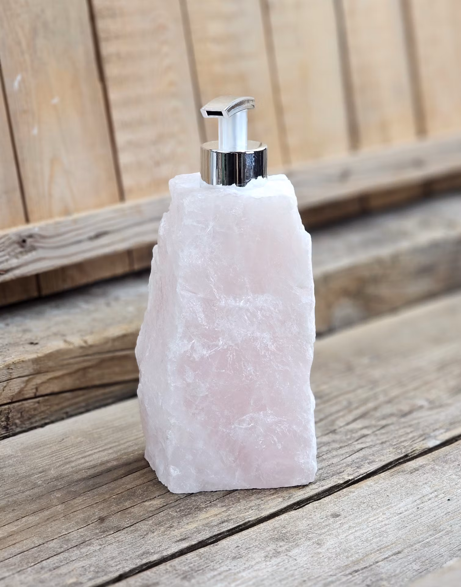 Vacker pump i rå Rosenkvarts, helt fantastisk detalj i hemmet till t.ex. handkräm eller tvål. Pump i silverfärg. Kristallen på bilderna är den du köper. Tänk på att kristaller kommer från naturen, små skillnader kan därför förekomma i produktens utseende på grund av dess naturmaterial. Färger kan skilja sig beroende på hur ljuset faller ner på kristallen samt även mellan olika bildskärmar m.m.
