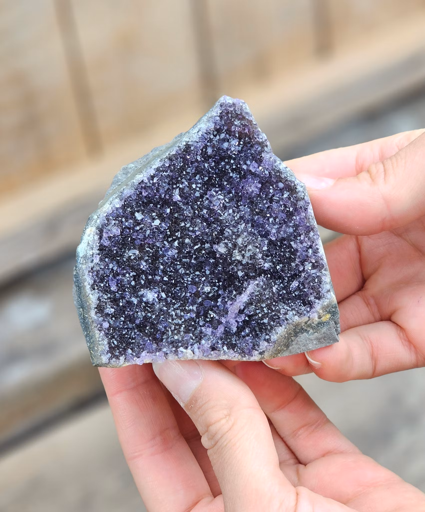 Fantastiskt vackert naturligt Ametistkluster i härlig stående modell. Dessa Ametist har en helt naturlig baksida/grund av Basalt, endast botten som är sågad för att den skall stå. Kristallen på bilderna är den du köper. Tänk på att kristaller kommer från naturen, små skillnader kan därför förekomma i produktens utseende på grund av dess naturmaterial. Färger kan skilja sig beroende på hur ljuset faller ner på kristallen samt även mellan olika bildskärmar m.m.