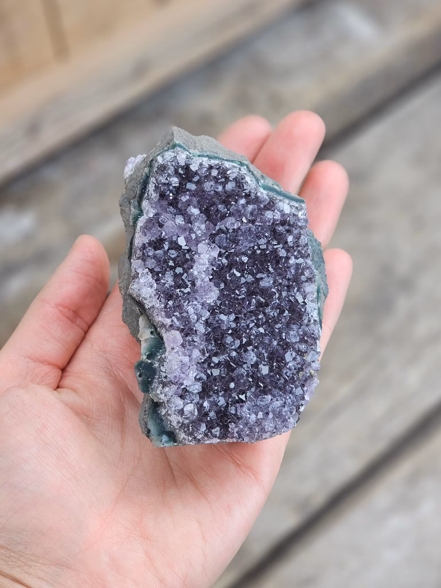 Mycket vackert naturligt Ametistkluster i hög kvalité. Tänk på att kristaller kommer från naturen, små skillnader kan därför förekomma i produktens utseende på grund av dess naturmaterial. Färger kan skilja sig beroende på hur ljuset faller ner på kristallen samt även mellan olika bildskärmar m.m.