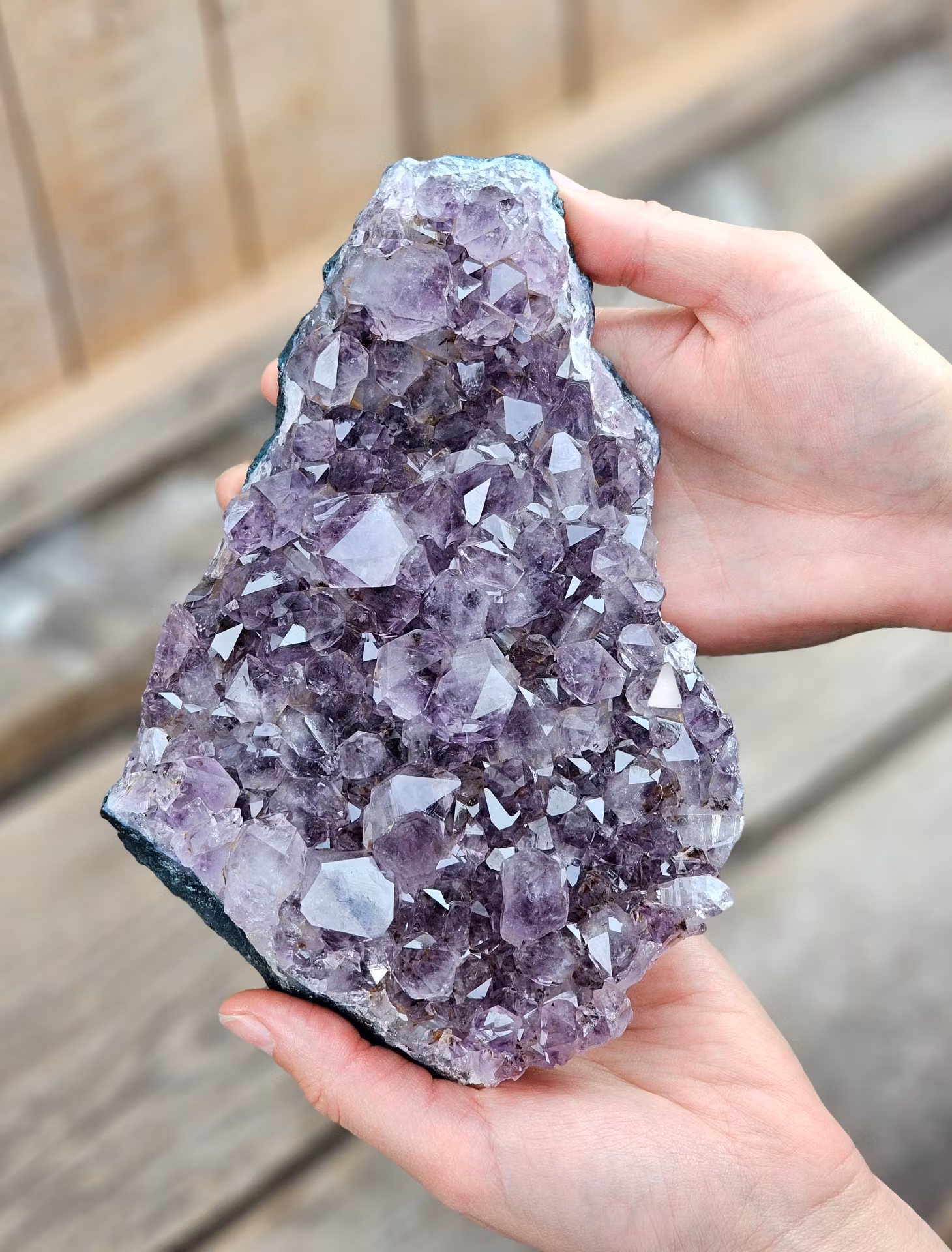 Riktigt stort vackert naturligt Ametistkluster i superfin kvalité. Maffig storlek, ett riktigt härligt kluster. Tänk på att kristaller kommer från naturen & naturliga sprickor & ojämnhet kan förekomma. Färger kan skilja sig beroende på hur ljuset faller ner på kristallen samt även mellan olika bildskärmar m.m.
