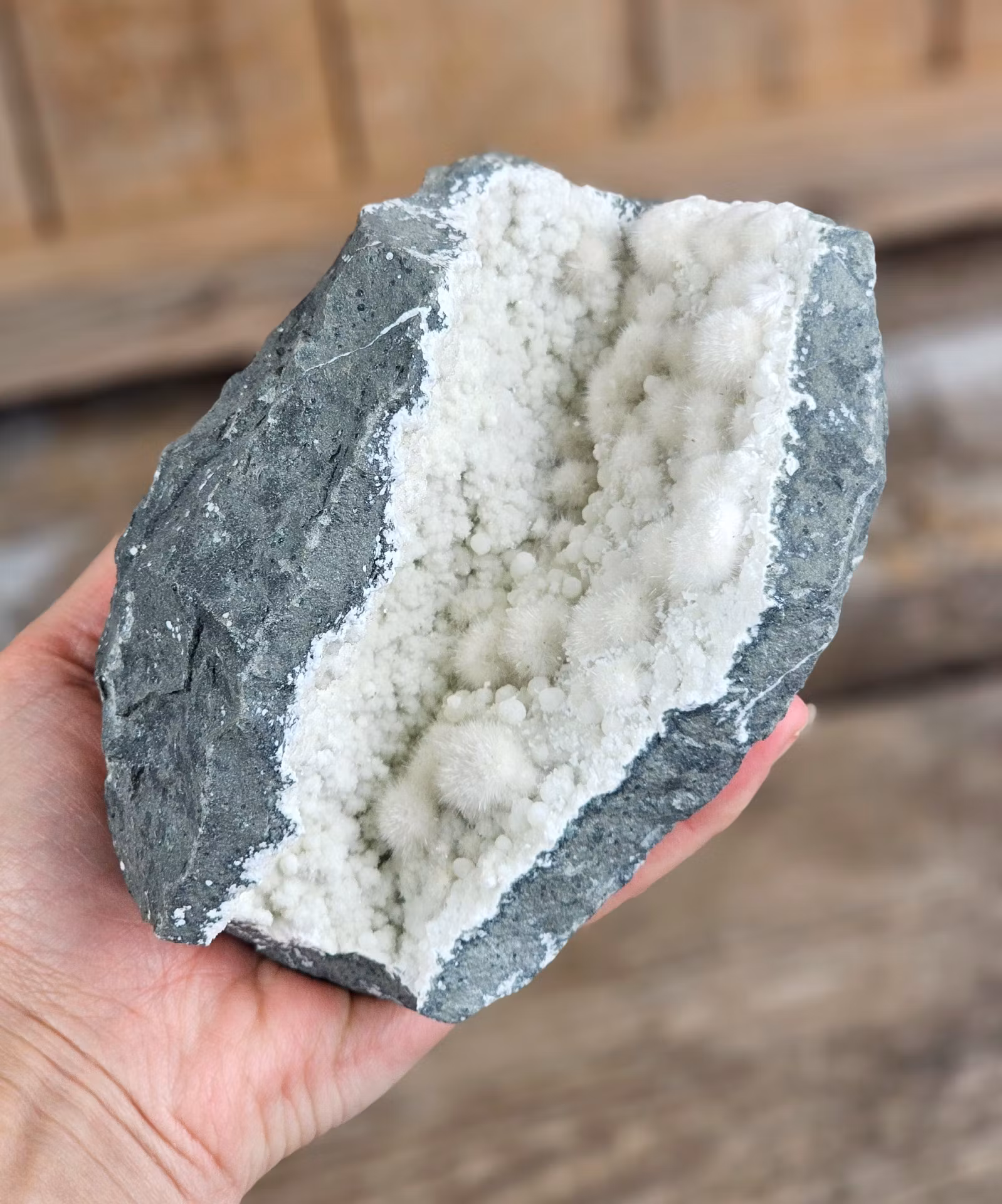 Helt otroligt läcker stor geod med Okenit. Det här exemplaret är riktigt vackert och glittrar massor. Okenit är ett fantastiskt mineral som bildas tillsammans med andra kristaller ur Zeolitfamiljen. Basen (det grå) av detta mineral är Basalt, medan de små vita bollarna är det som kallas Okenit. De är mjuka och känns som fluffig bomull. Ett riktigt häftigt objekt till samlingen. Tänk på att kristaller kommer från naturen & naturliga sprickor & ojämnheter kan förekomma. Färger kan skilja sig beroende på hur ljuset faller ner på kristallen samt även mellan olika bildskärmar m.m.