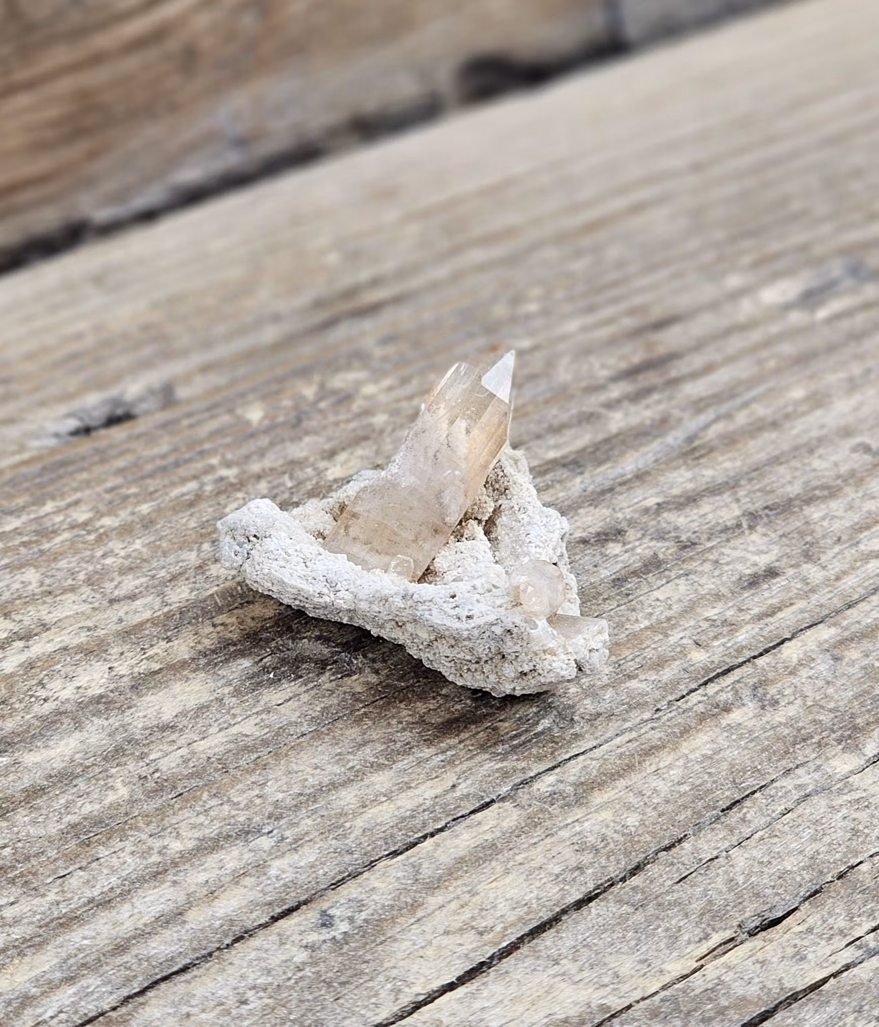 Ett fantastiskt vackert exemplar av den eftertraktade och exklusiva Champagne Topas i matrix! Mycket hög kvalité. Kristallen på bilderna är den du köper. Tänk på att kristaller kommer från naturen, små skillnader kan därför förekomma i produktens utseende på grund av dess naturmaterial. Färger kan skilja sig beroende på hur ljuset faller ner på kristallen samt även mellan olika bildskärmar m.m.