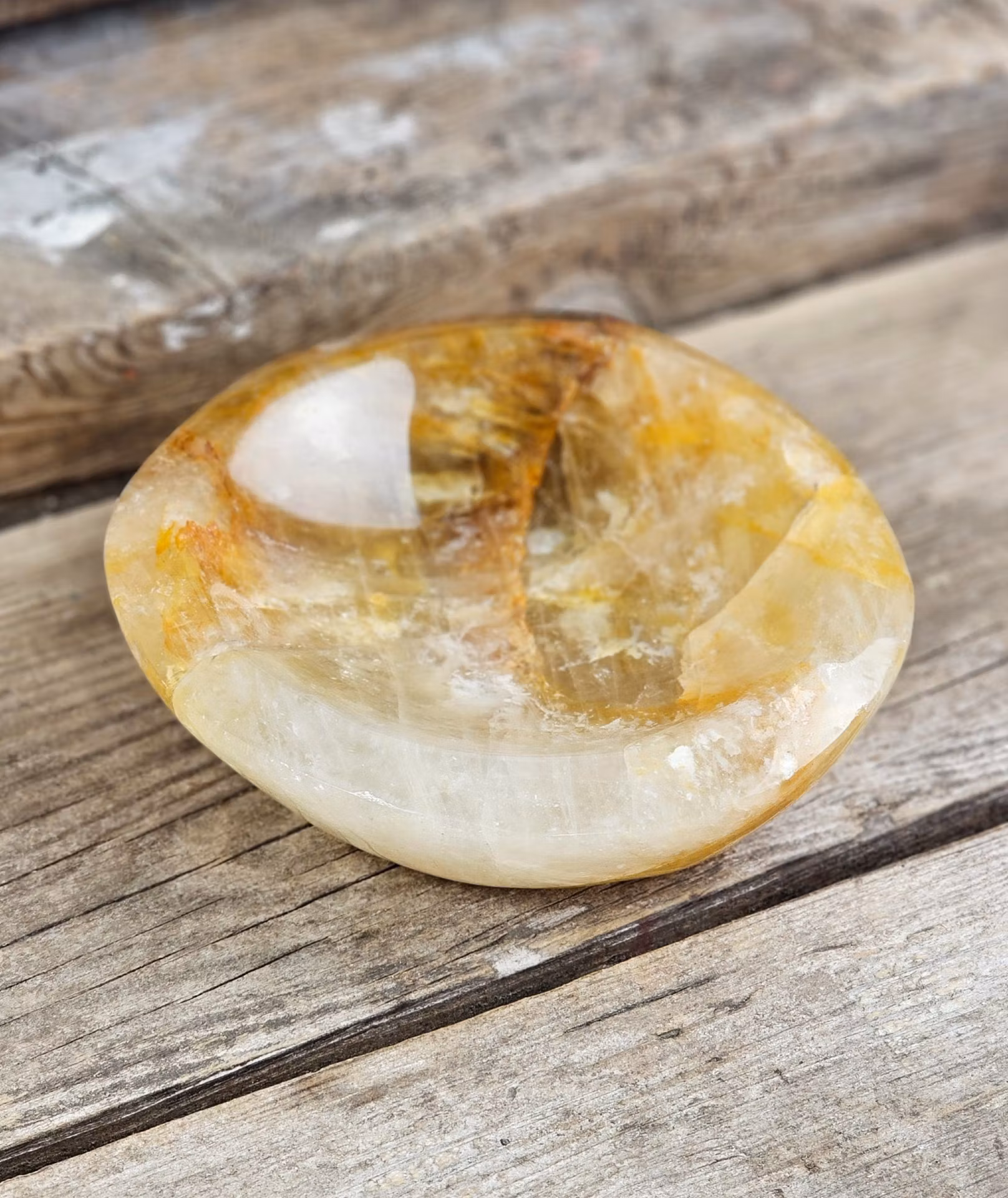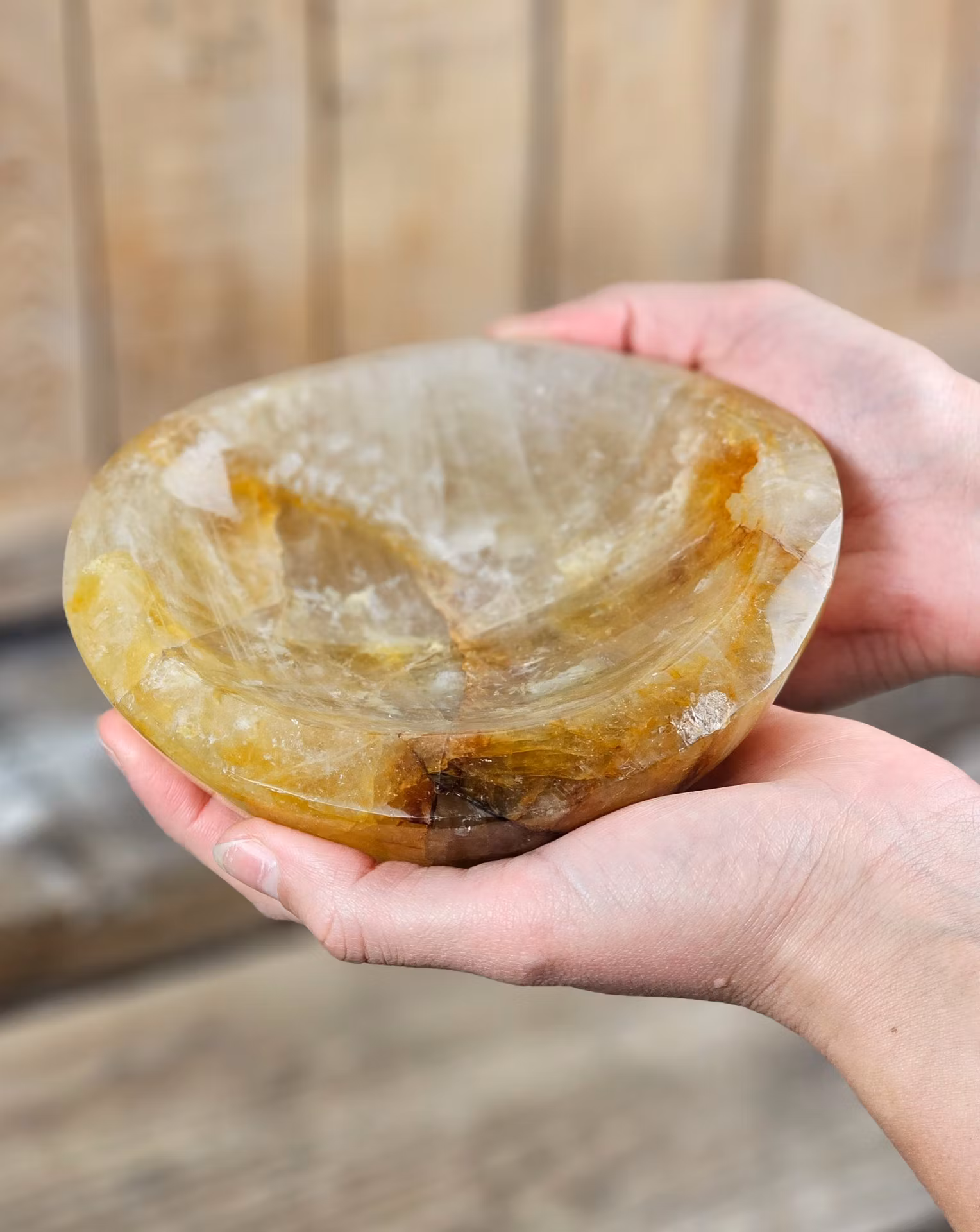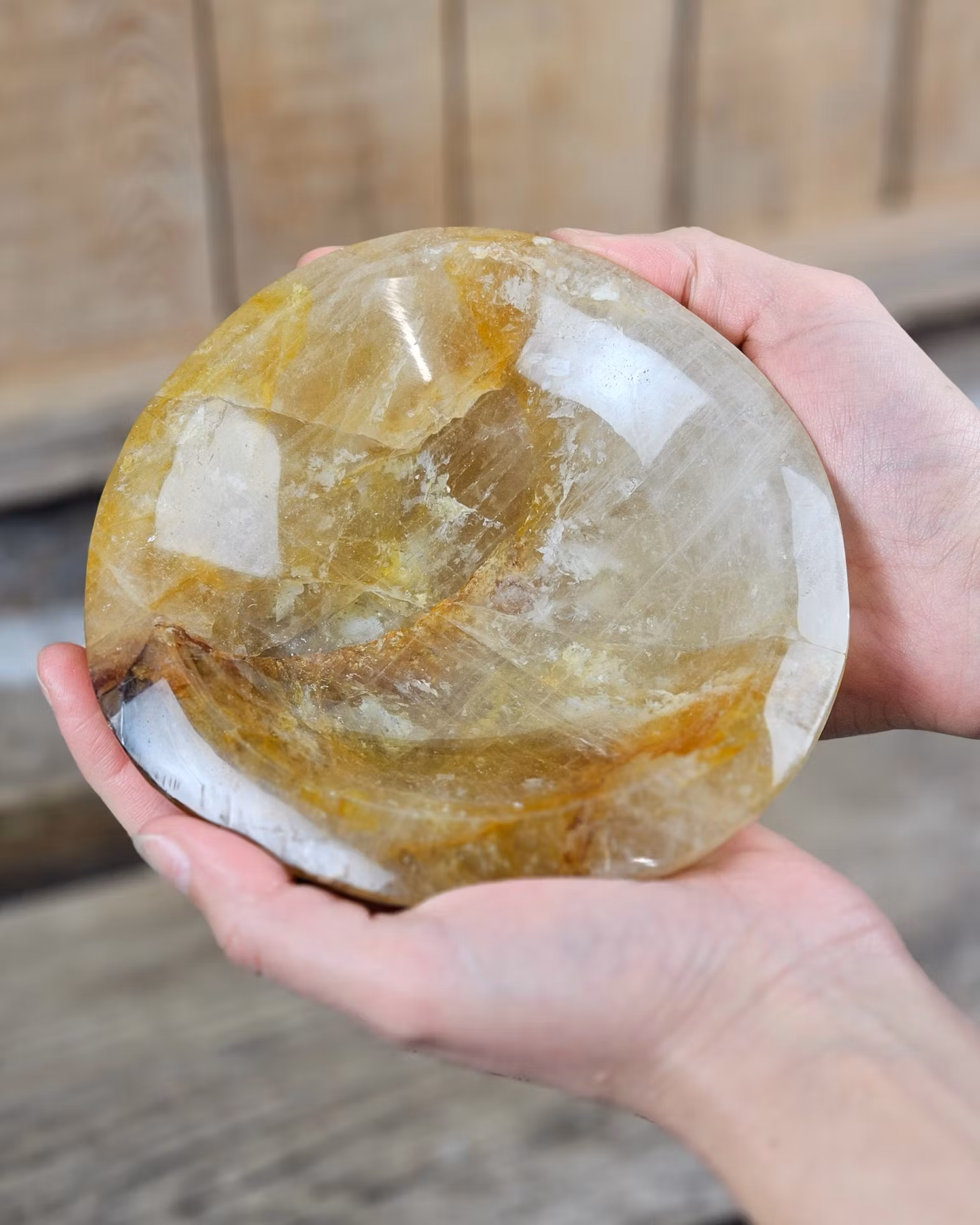 Otroligt vacker stor skål i Golden Healer. Golden Healer är Kvarts med inneslutningar av järn. Mycket fin förvaring till t.ex. dina smycken och trumlade stenar. Helt fantastisk! Observera att smycken/kristaller i skålen inte ingår, dessa köpes separat i vår butik. Tänk på att kristaller kommer från naturen & naturliga sprickor samt ojämnhet kan förekomma. Färger kan skilja sig beroende på hur ljuset faller ner på kristallen samt även mellan olika bildskärmar m.m.