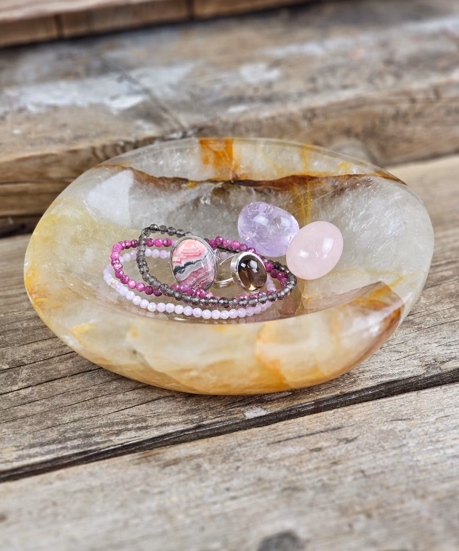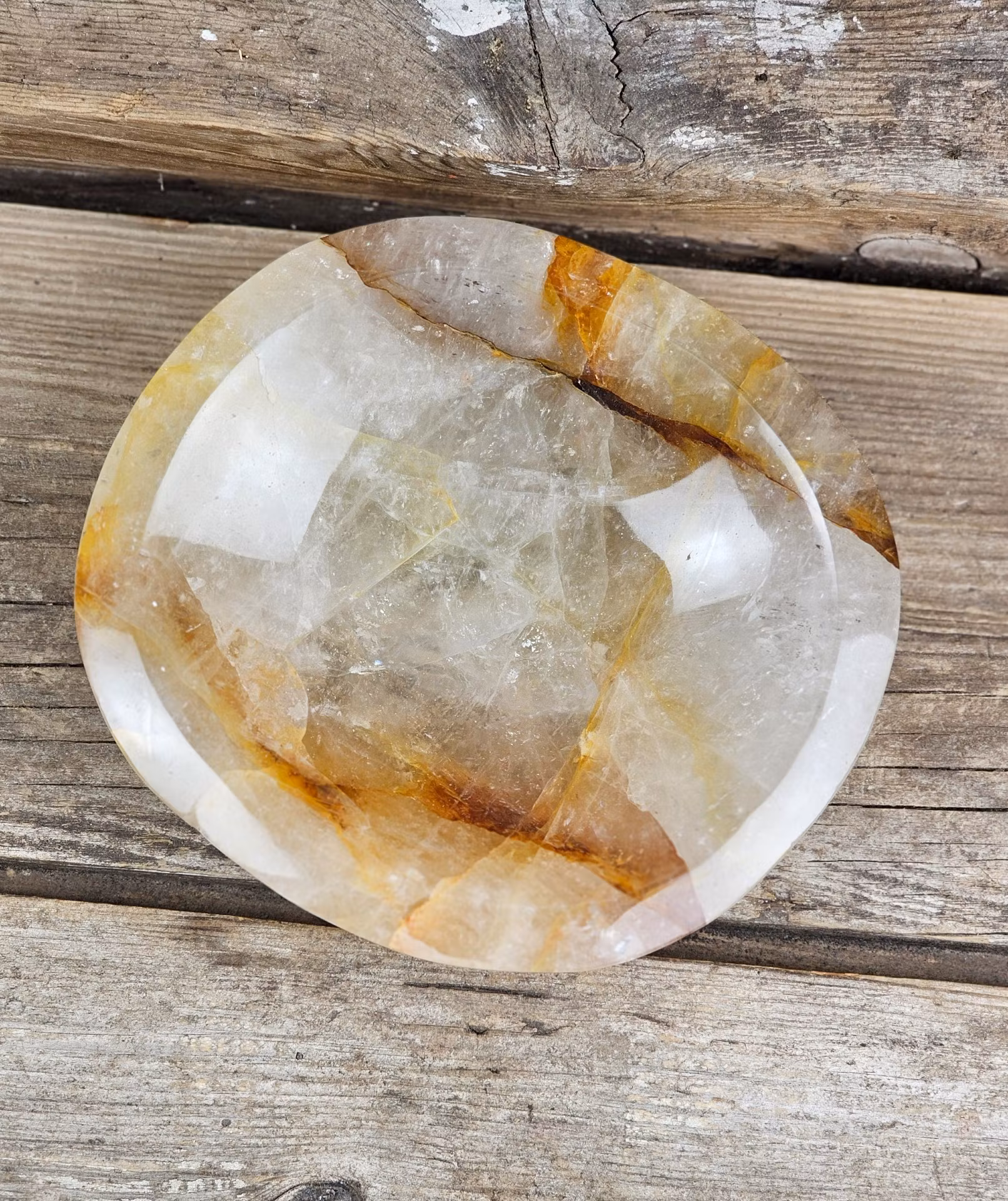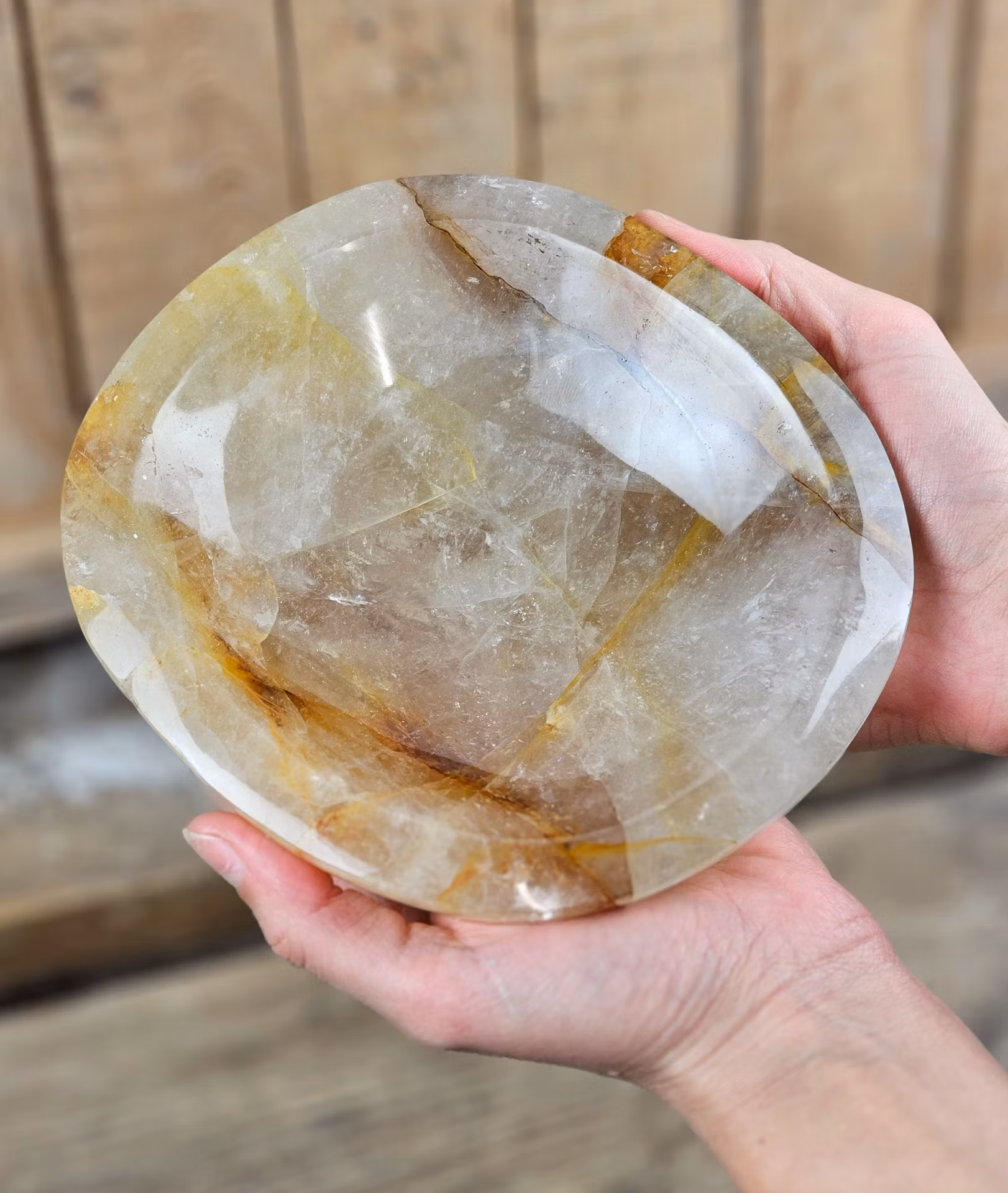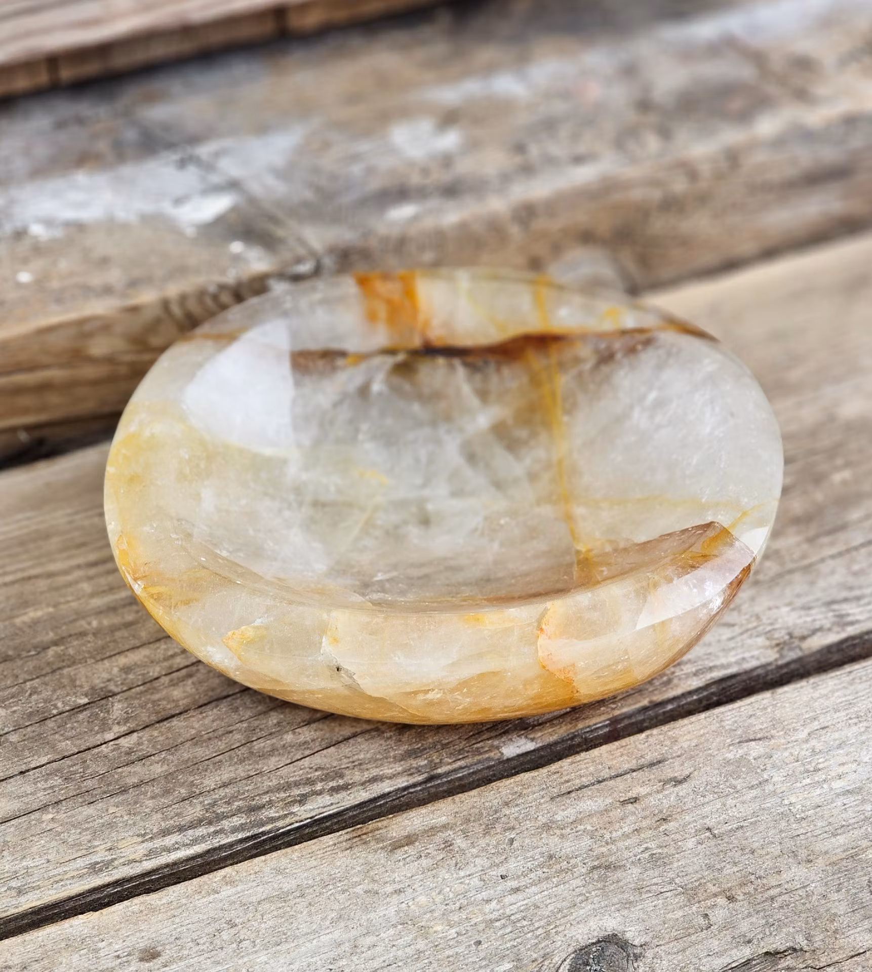 Otroligt vacker stor skål i Golden Healer. Golden Healer är Kvarts med inneslutningar av järn. Mycket fin förvaring till t.ex. dina smycken och trumlade stenar. Helt fantastisk! Observera att smycken/kristaller i skålen inte ingår, dessa köpes separat i vår butik. Tänk på att kristaller kommer från naturen & naturliga sprickor samt ojämnhet kan förekomma. Färger kan skilja sig beroende på hur ljuset faller ner på kristallen samt även mellan olika bildskärmar m.m.