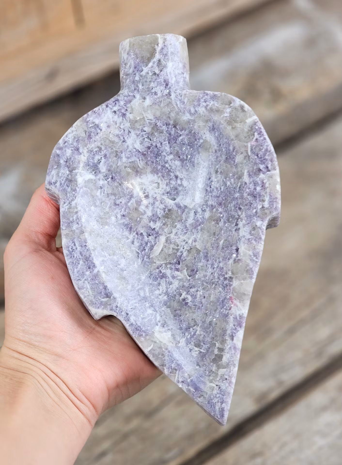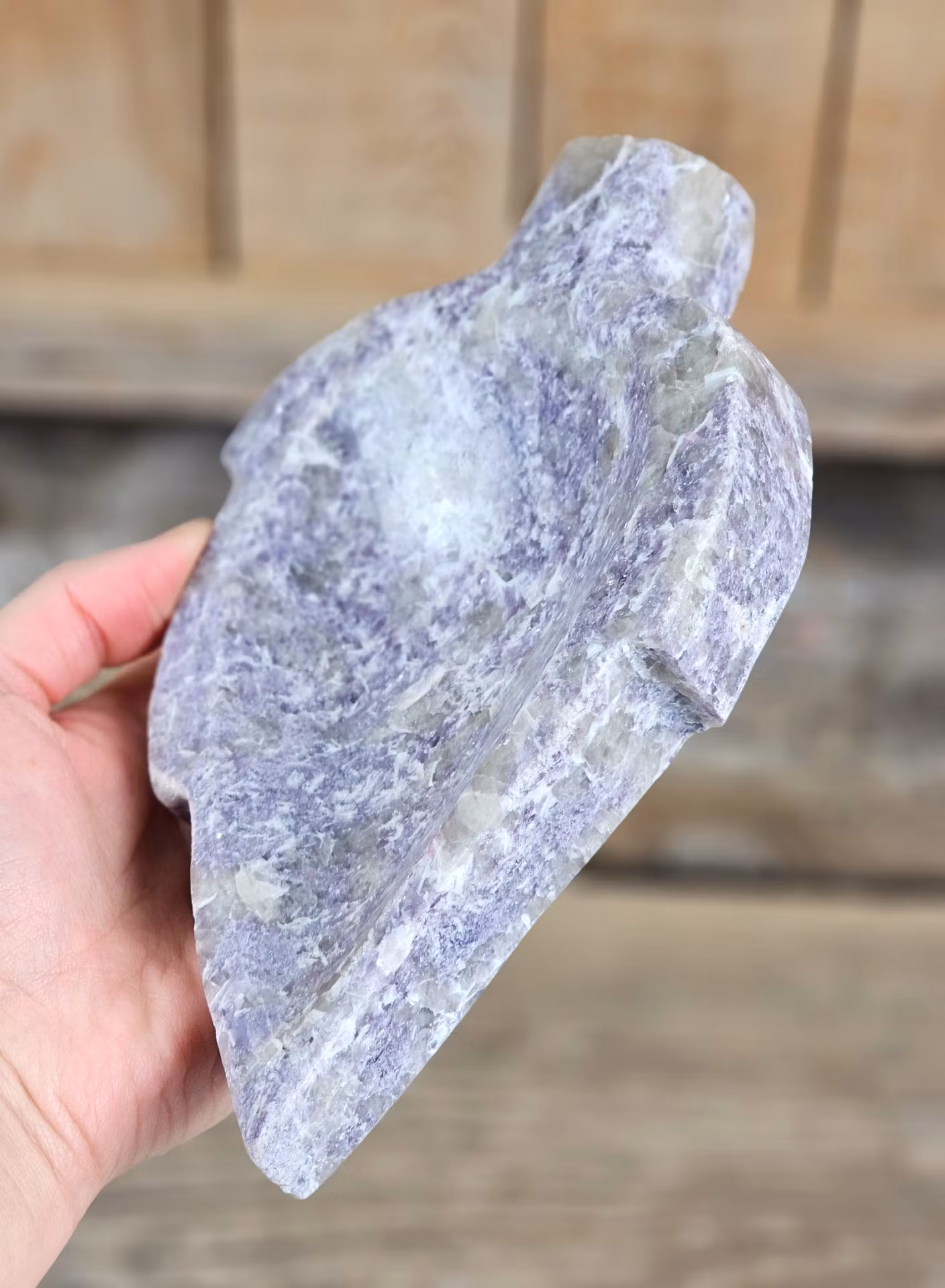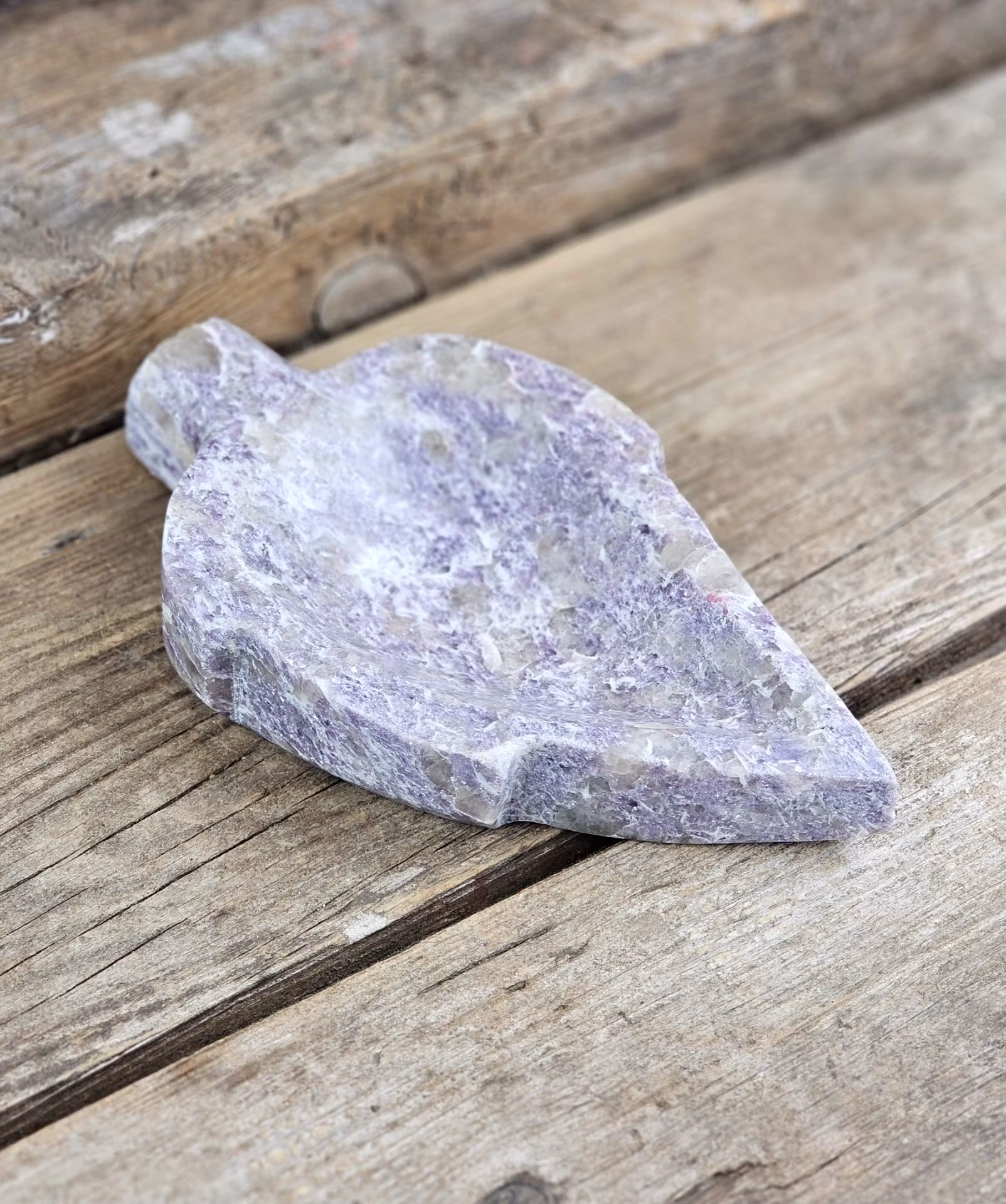 Otroligt vacker skål i Lepidolit med lite inslag av Rosa Turmalin. Mycket fin förvaring till t.ex. dina trumlade stenar och smycken. Helt fantastisk! Tänk på att kristaller kommer från naturen & naturliga sprickor & ojämnhet kan förekomma. Färger kan skilja sig beroende på hur ljuset faller ner på kristallen samt även mellan olika bildskärmar m.m.
