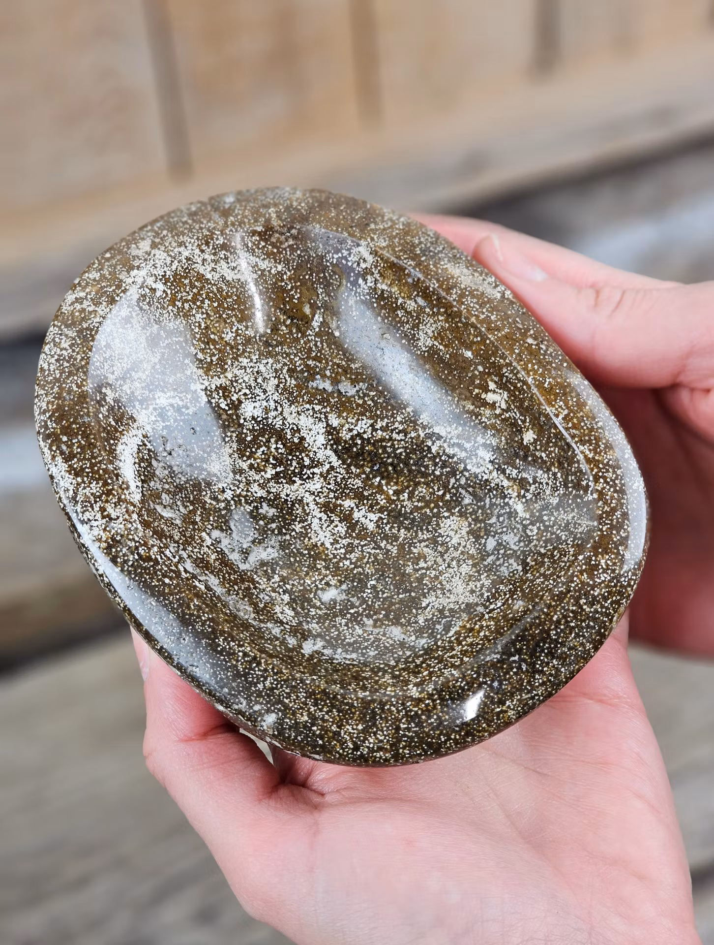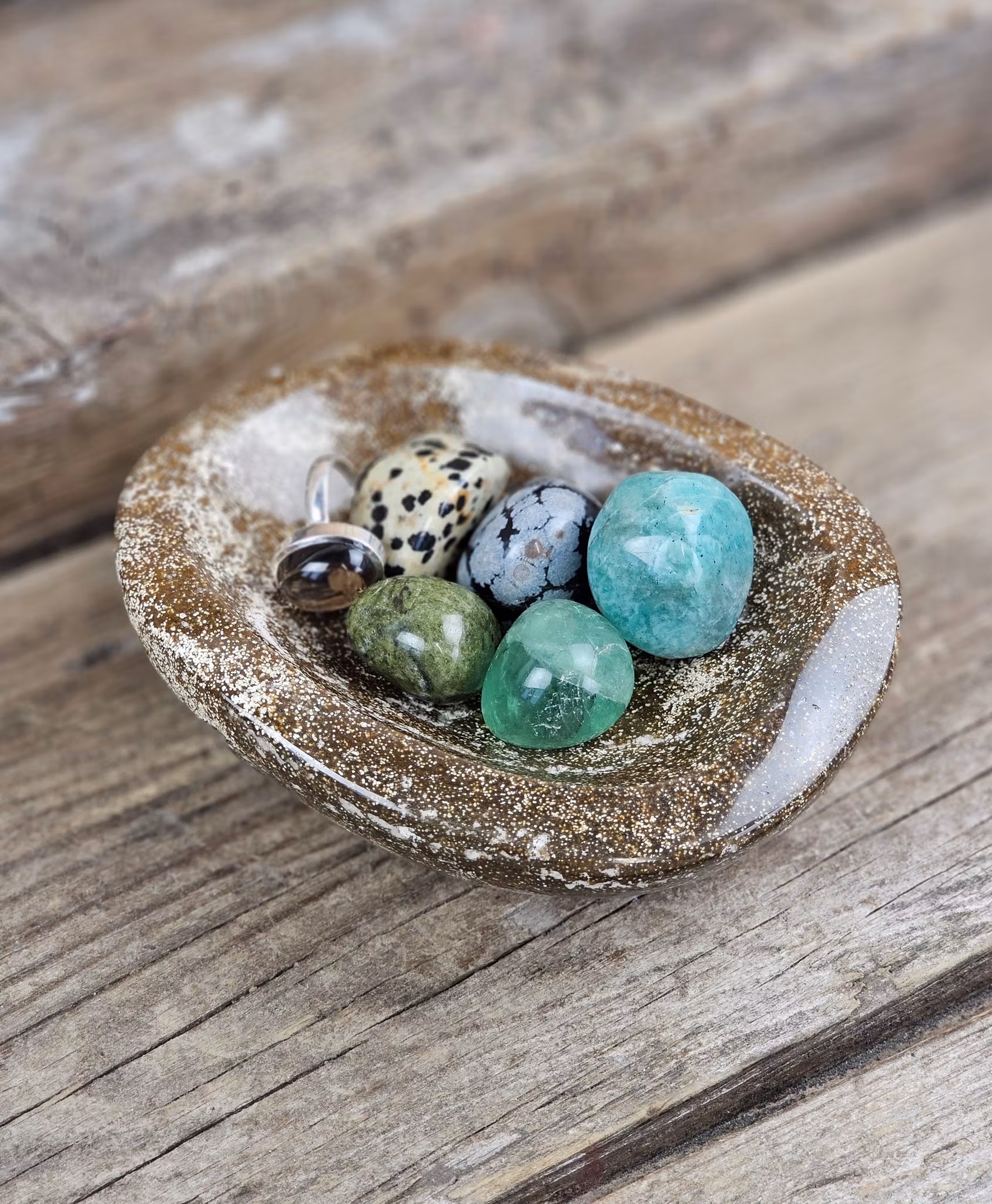 Helt fantastisk skål i Oceanjaspis. Mycket fin förvaring till t.ex. dina smycken och trumlade stenar. Underbar! Observera att smycken/kristaller i skålen inte ingår, dessa köpes separat i vår butik. Tänk på att kristaller kommer från naturen & naturliga sprickor samt ojämnhet kan förekomma. Färger kan skilja sig beroende på hur ljuset faller ner på kristallen samt även mellan olika bildskärmar m.m.