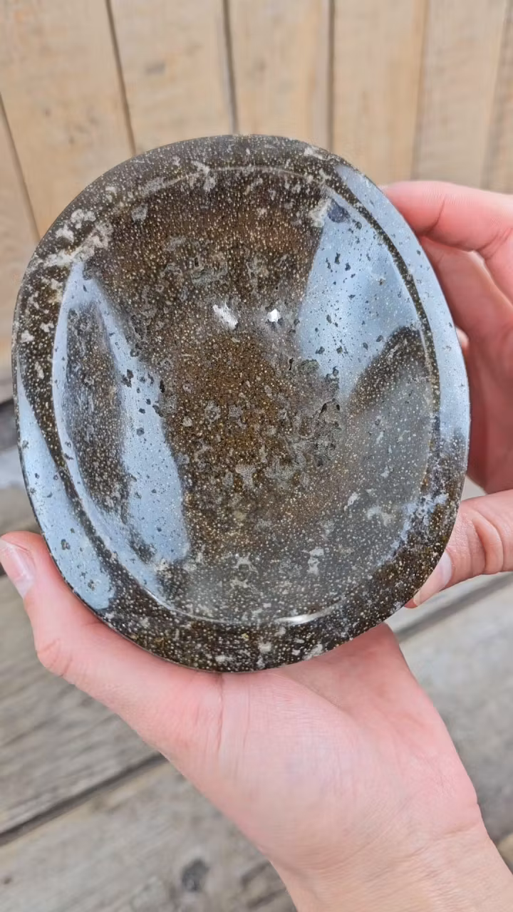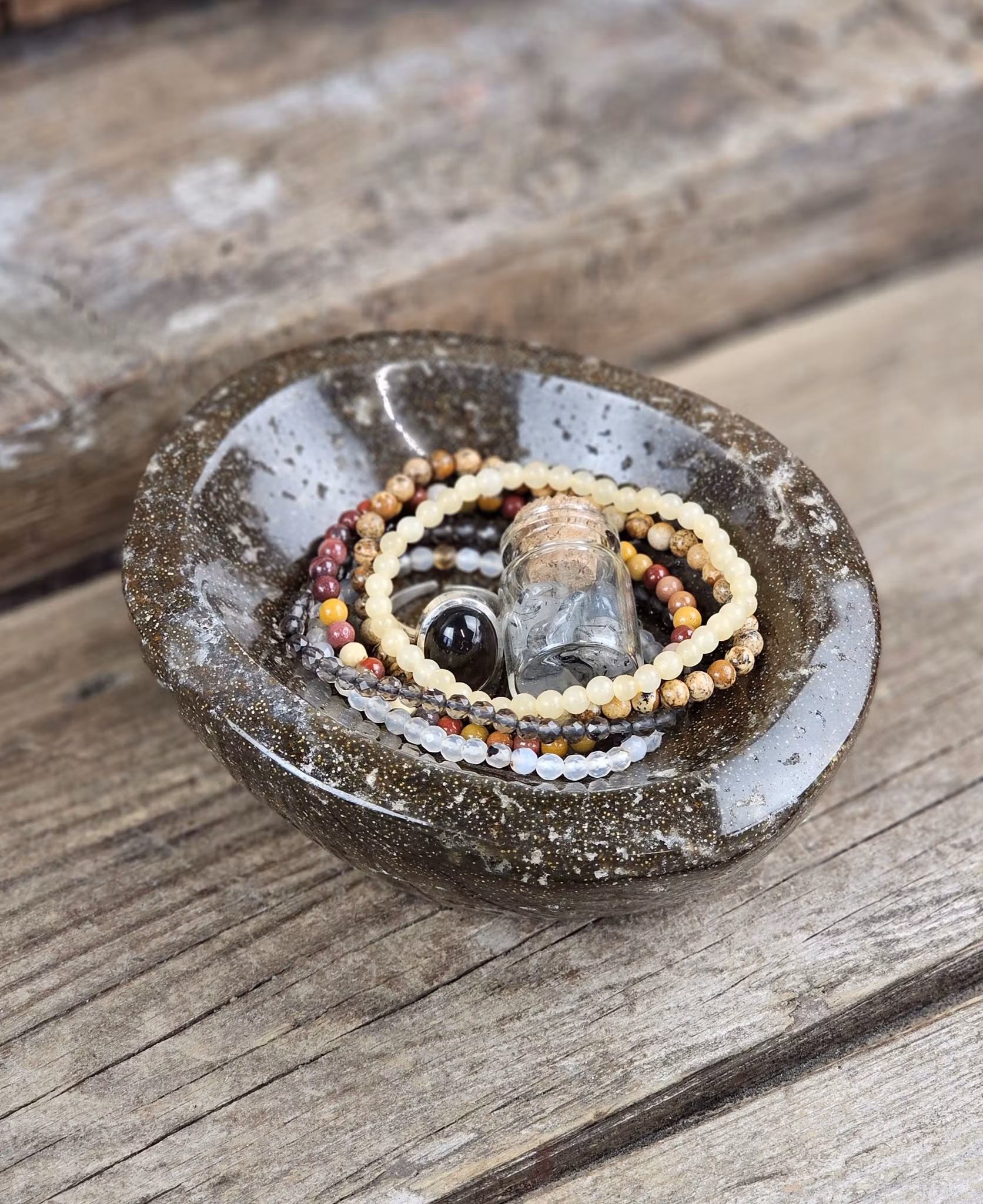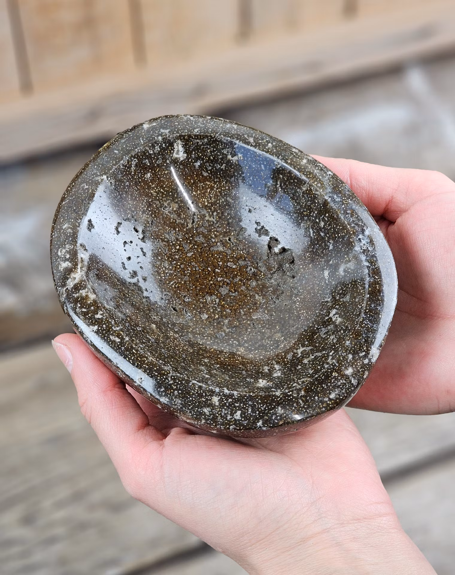 Helt fantastisk skål i Oceanjaspis. Mycket fin förvaring till t.ex. dina smycken och trumlade stenar. Underbar! Observera att smycken/kristaller i skålen inte ingår, dessa köpes separat i vår butik. Tänk på att kristaller kommer från naturen & naturliga sprickor samt ojämnhet kan förekomma. Färger kan skilja sig beroende på hur ljuset faller ner på kristallen samt även mellan olika bildskärmar m.m.