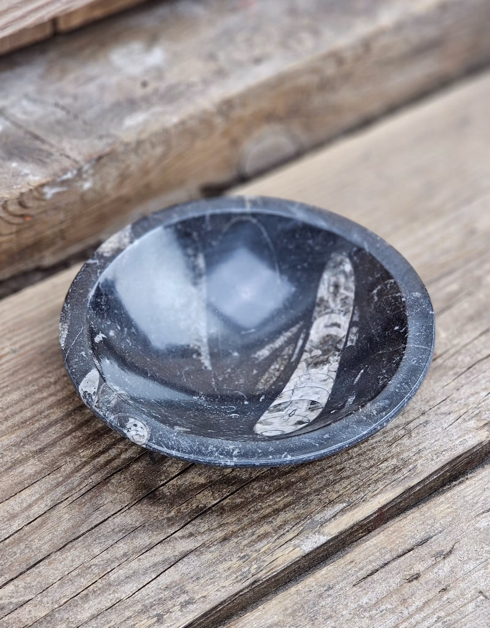En underbar polerad skål i Ortoceratit fossil med fantastiska fossila mönster. Fin förvaring till t.ex. dina trumlade stenar. Ortoceratit var en typ av bläckfisk som levde under tidig krita, för omkring 400 miljoner år sedan i Paleozoikum. Det är en utdöd art där dess fossil som hittas ligger inbäddade i kalksten (Orthocerida; av grekiskans ortho, 'rak', och keras ; 'horn') Ortoceratiterna hade ett rakt eller svagt svängt, spetsigt skal. Vissa arter kunde nå en längd på upp till 10 meter. Ortoceratiterna antas ha varit snabbsimmande rovdjur som simmade bäst med spetsen framåt, men kunde även simma bakåt.