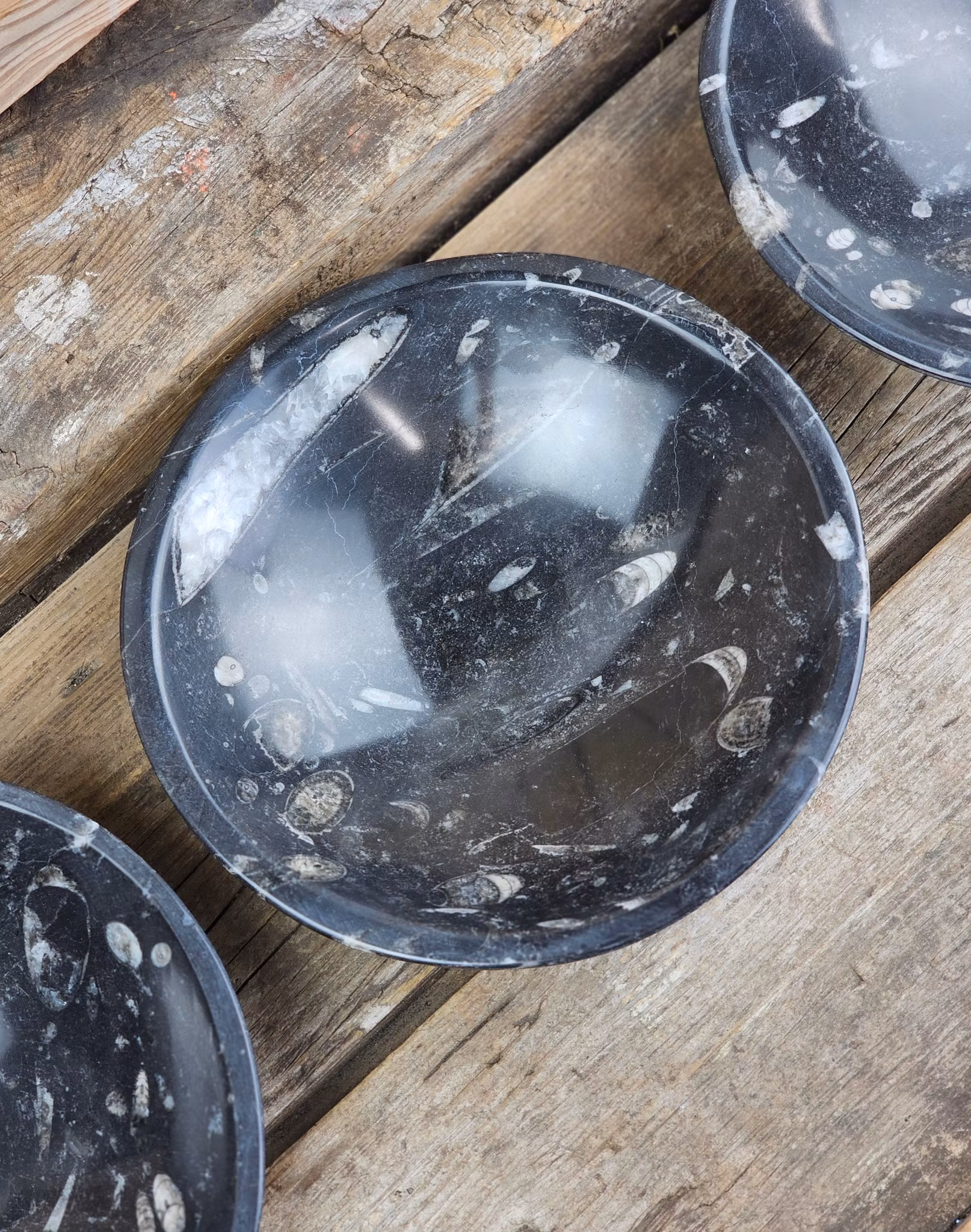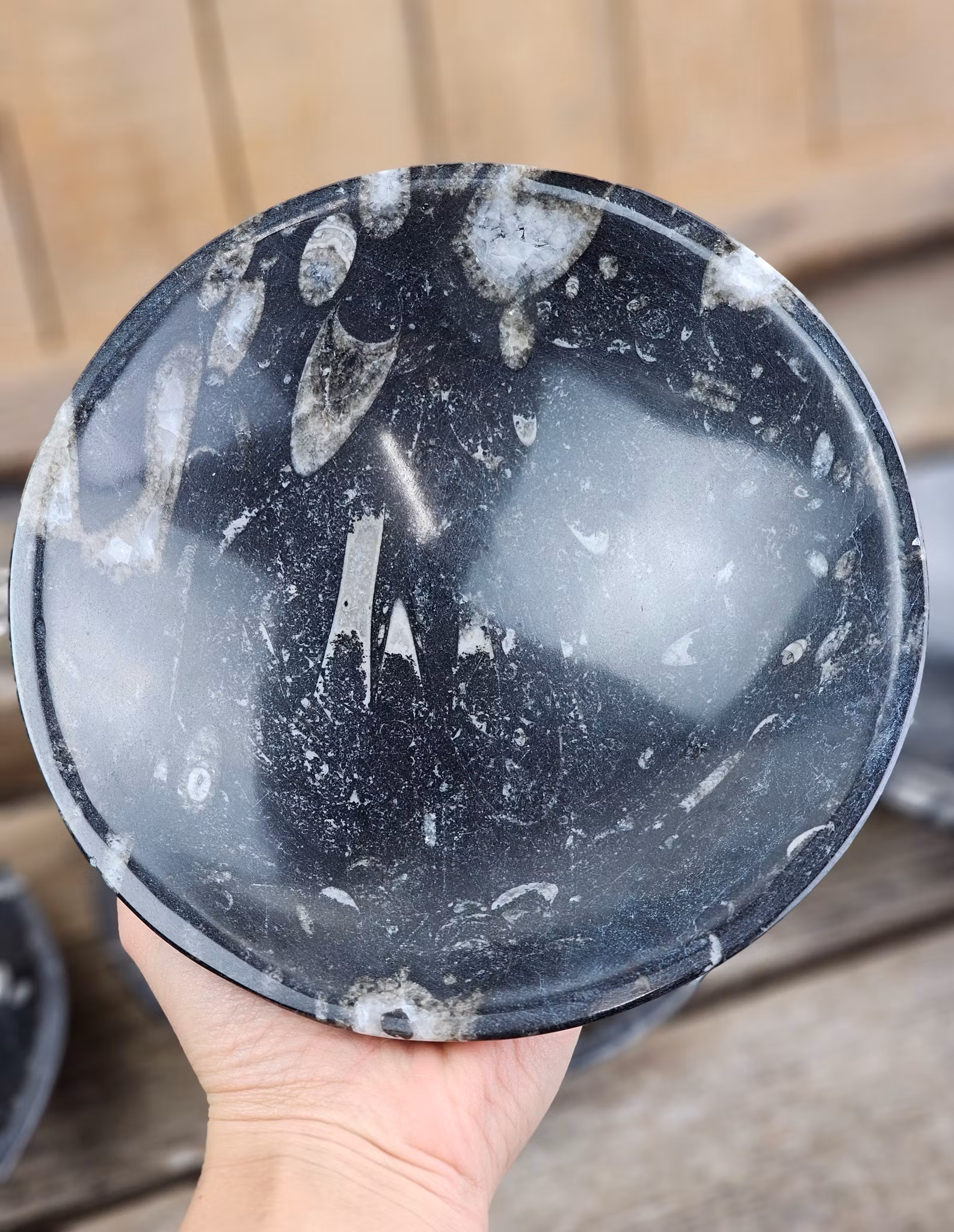 Underbar stor polerad skål i Ortoceratit fossil. Fin förvaring till t.ex. dina touchstones och trumlade stenar. Ortoceratit var en typ av bläckfisk som levde under tidig krita, för omkring 400 miljoner år sedan i Paleozoikum. Det är en utdöd art där dess fossil som hittas ligger inbäddade i kalksten (Orthocerida; av grekiskans ortho, 'rak', och keras ; 'horn') Ortoceratiterna hade ett rakt eller svagt svängt, spetsigt skal. Vissa arter kunde nå en längd på upp till 10 meter. Ortoceratiterna antas ha varit snabbsimmande rovdjur som simmade bäst med spetsen framåt, men kunde även simma bakåt.
