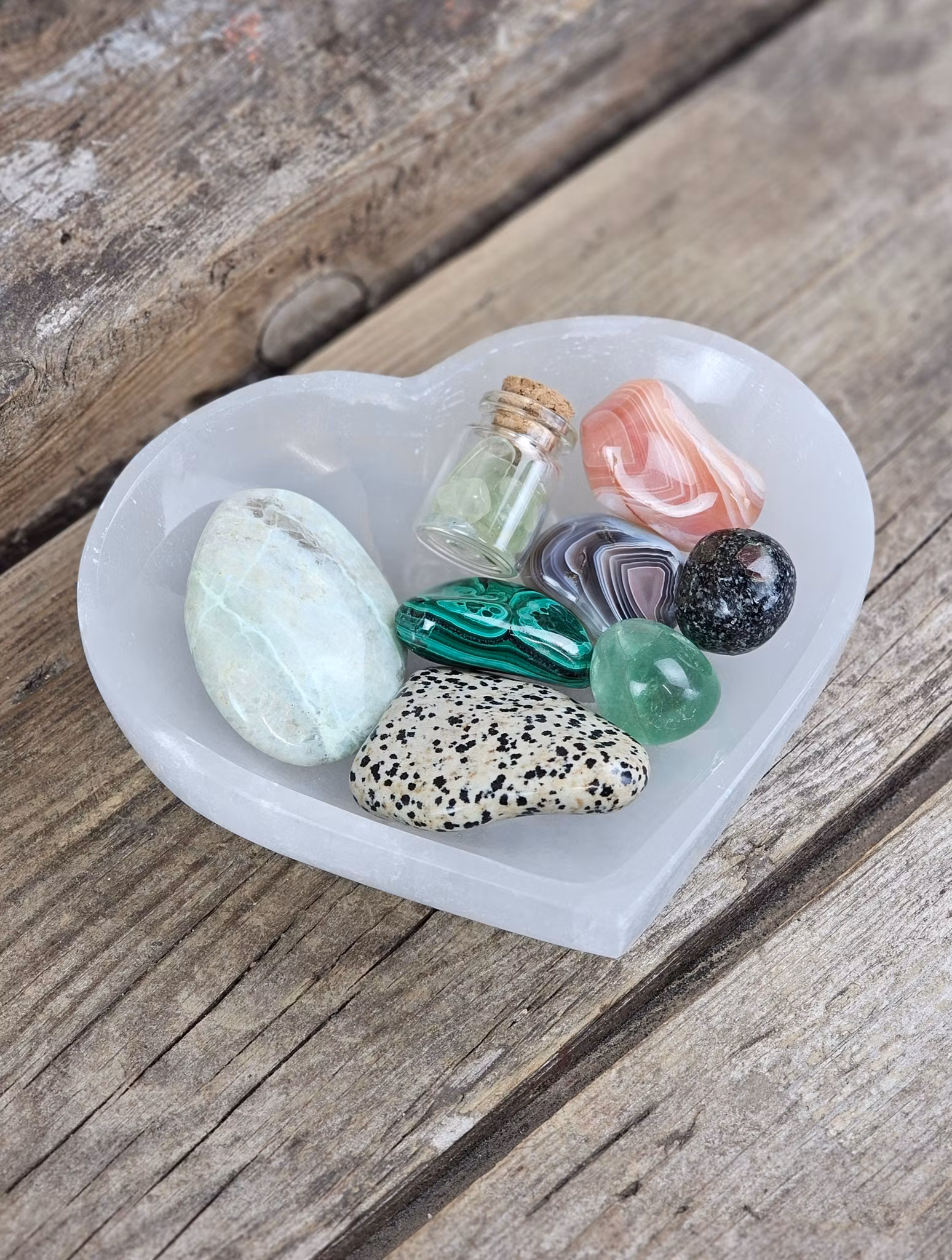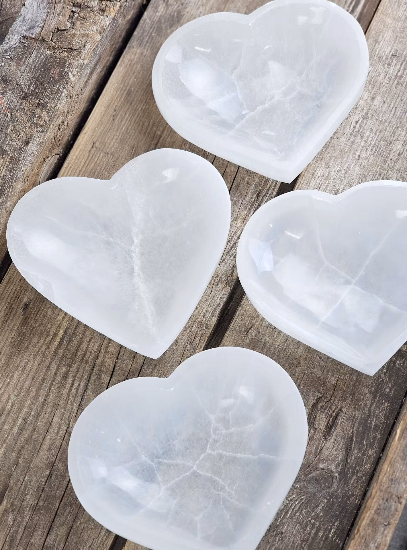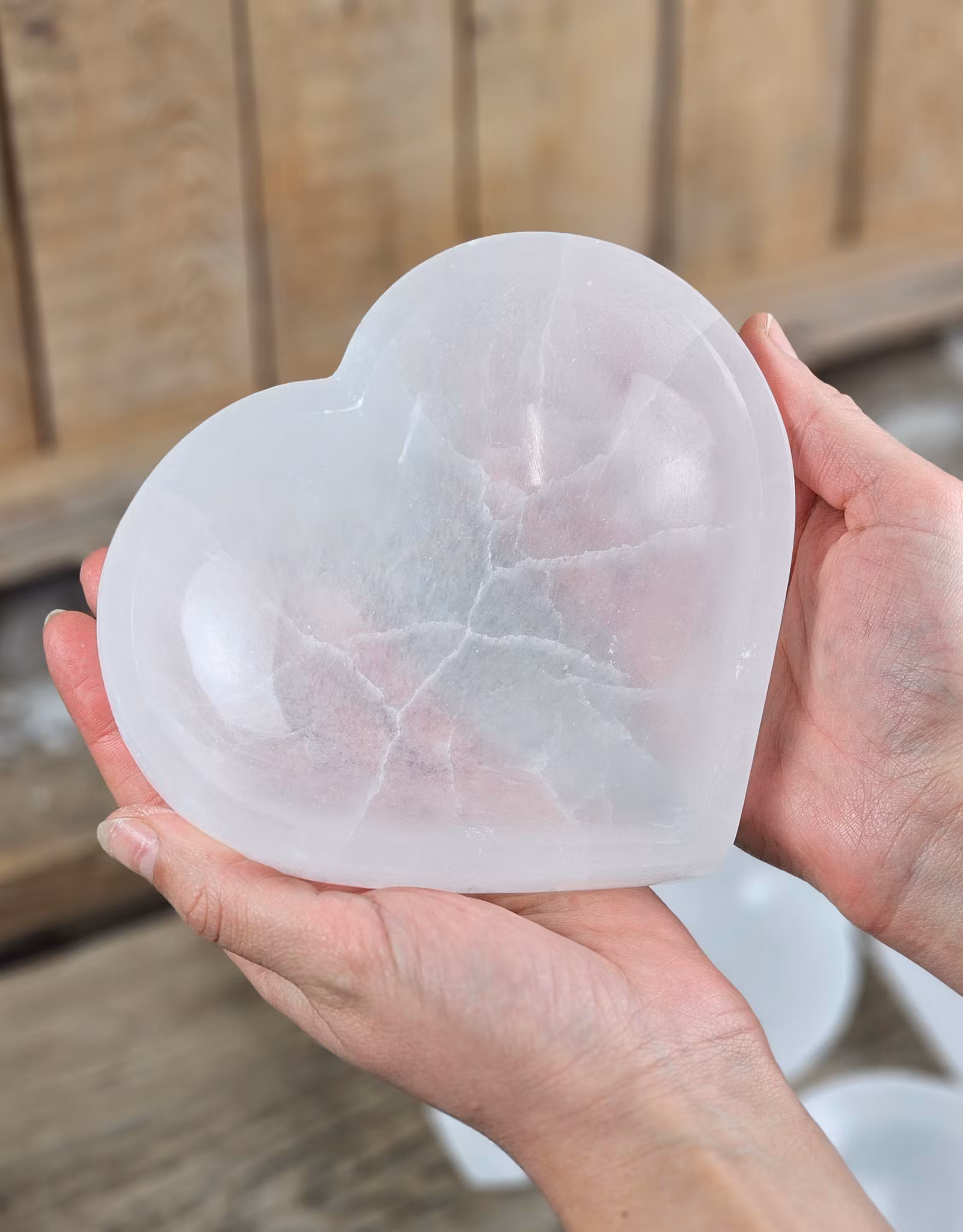 Vacker stor polerad skål i Vit Selenit med formen av ett hjärta. Jättefin förvaring till t.ex. dina trumlade stenar eller smycken! Observera att smycken/kristaller i skålen inte ingår, dessa köpes separat i vår butik. Skålarna säljes styckvis. De skiftar i utseende. Du köper en slumpvis liknande skål enligt text & bild ovan. Tänk på att kristaller kommer från naturen & naturliga sprickor & ojämnheter kan förekomma. Färger kan skilja sig beroende på hur ljuset faller ner på kristallen samt även mellan olika bildskärmar m.m.