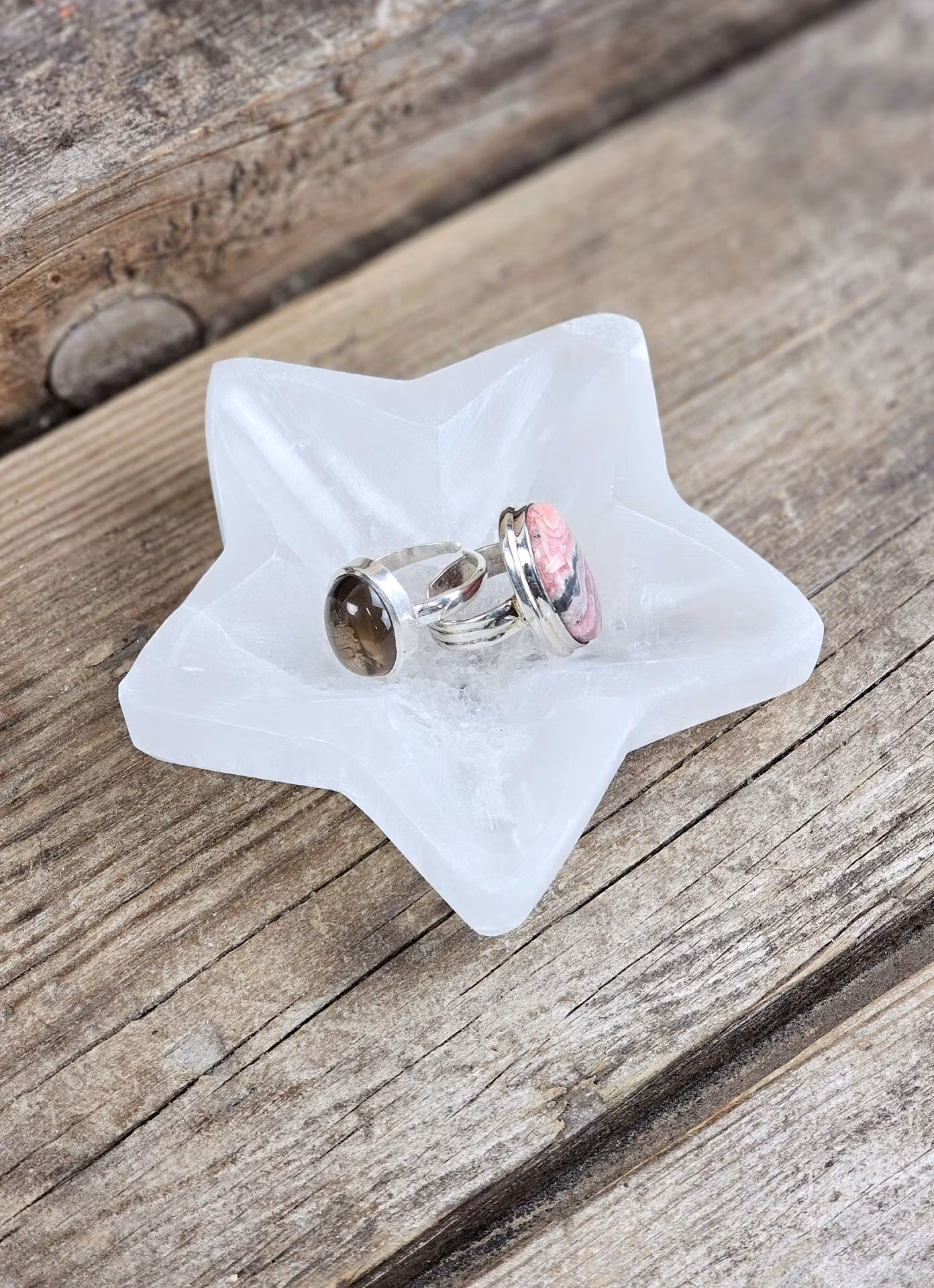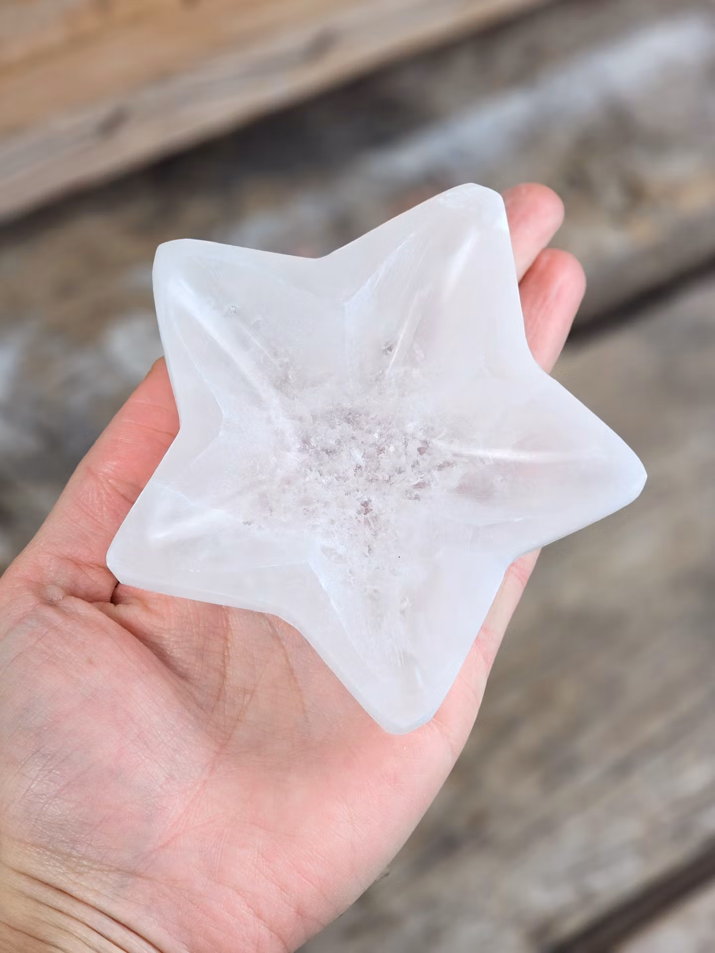 Vacker skål i Vit Selenit med formen av en stjärna. Jättefin liten förvaring till t.ex. dina trumlade stenar eller smycken! Observera att smycken i skålen inte ingår, dessa köpes separat i vår butik. Skålarna säljes styckvis. De skiftar i utseende. Du köper en slumpvis liknande skål enligt text & bild ovan. Tänk på att kristaller kommer från naturen & naturliga sprickor & ojämnheter kan förekomma. Färger kan skilja sig beroende på hur ljuset faller ner på kristallen samt även mellan olika bildskärmar m.m.