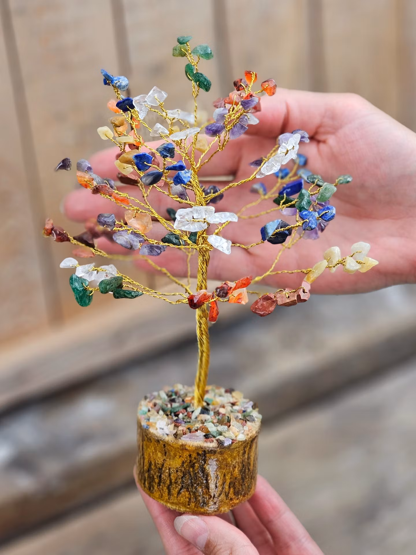 Chakran är energicentra i kroppen som var och en vibrerar i sin egen unika färg och frekvens. Föreställ dig ett vackert träd där varje gren representerar ett chakra, skapat av kraftfulla kristaller: Bergkristall för klarhet och renhet, Ametist för andlig insikt och lugn, Grön Aventurin för tur och för att öppna upp hjärtchakrat, Röd Jaspis för styrka och jordning, Karneol för kreativitet och motivation, Golden Healer för helande och energiflöde, och Lapis Lazuli för kommunikation och sanning. Tillsammans skapar de en harmonisk symfoni av färger och energier, som hjälper dig att balansera och stärka kropp och själ. Låt detta träd vara en påminnelse om din inre styrka och potential. Träden förmedlar en sublim Feng Shui-energi som berikar ditt utrymme. Deras skönhet är inte bara en fröjd för ögat, utan de sprider även ett lugn som omsluter sinnet.