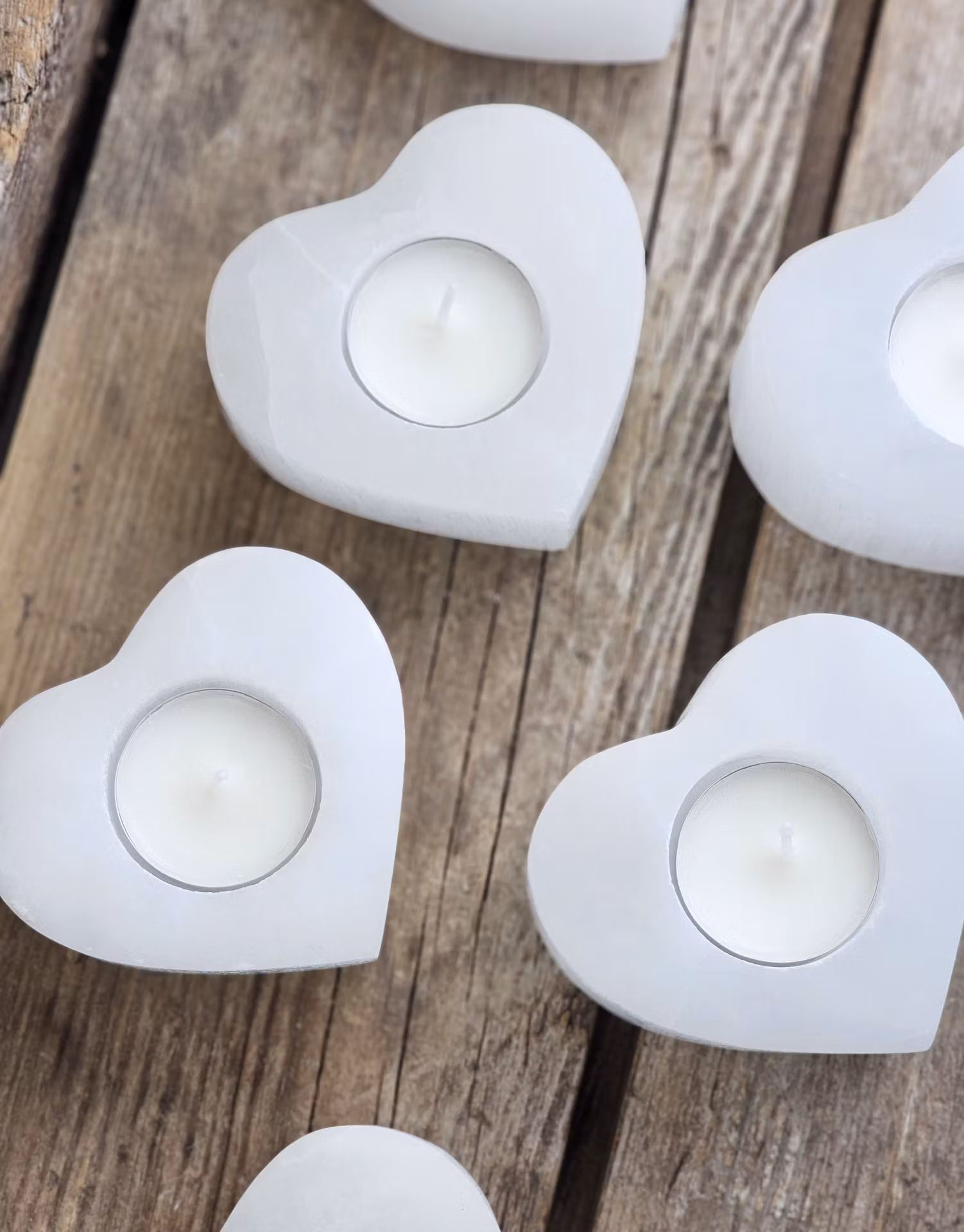 Vacker ljuslykta i Vit Selenit med formen av ett hjärta. Mycket fint när man tänder dessa! Säljes styckvis. De skiftar i utseende. Du köper slumpvis liknande ljuslykta enligt text & bild ovan. Tänk på att kristaller kommer från naturen & naturliga sprickor & ojämnheter kan förekomma. Färger kan skilja sig beroende på hur ljuset faller ner på kristallen samt även mellan olika bildskärmar m.m.