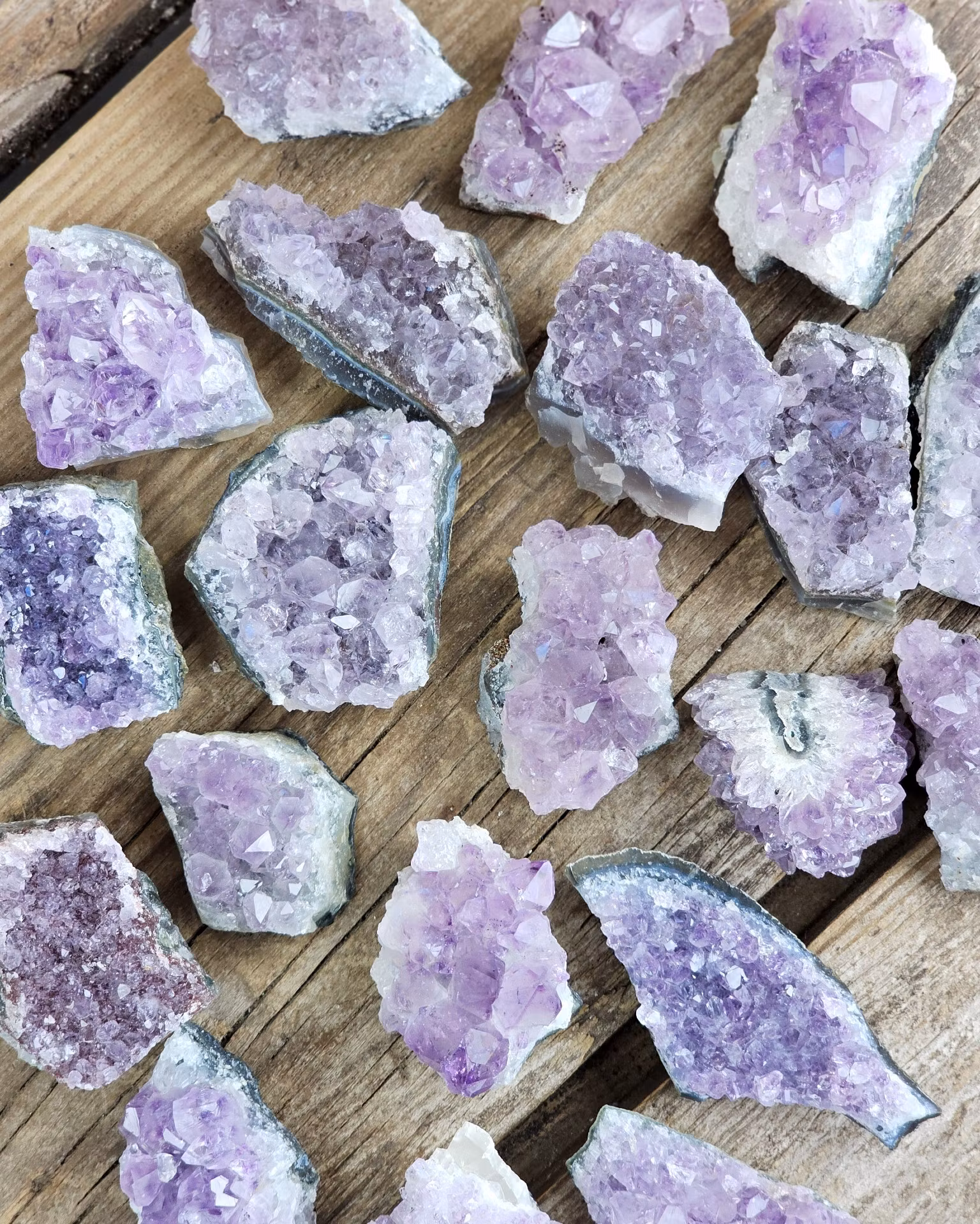 Vackert kit med ett litet Ametistkluster ihop med en rå Rosenkvarts. Värde vid köp av dessa produkter styckvis 39 kr + 29 kr (tot 68 kr). Säljes i par 1 styck Ametist och 1 st Rosenkvarts tillsammans. De skiftar i utseende. Du köper slumpvis liknande kristaller enligt text & bild ovan. Tänk på att kristaller kommer från naturen & naturliga sprickor & ojämnheter kan förekomma. Färger kan skilja sig beroende på hur ljuset faller ner på kristallen samt även mellan olika bildskärmar m.m.