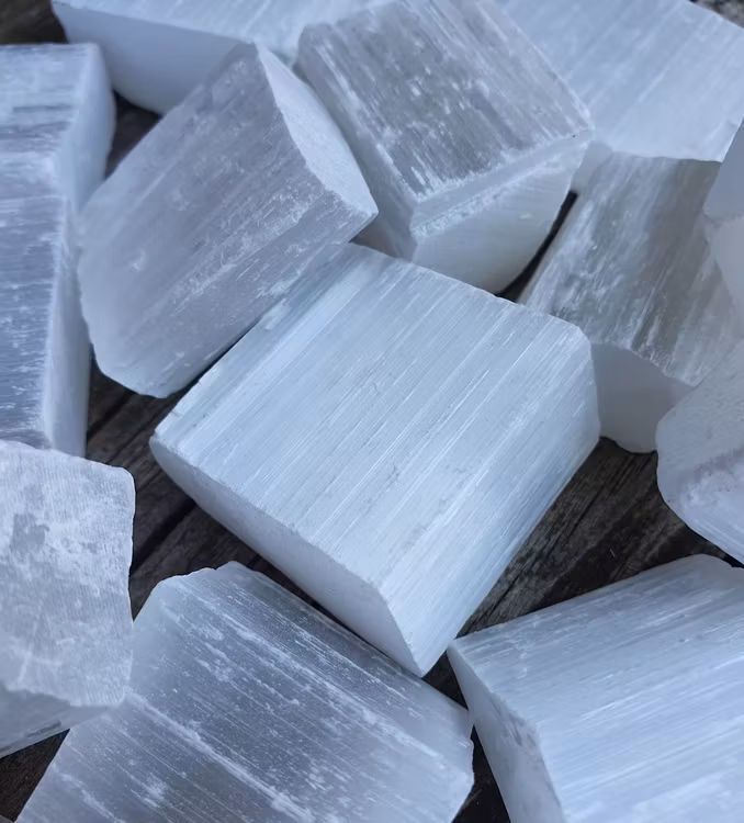 Mycket fina rå bitar av vit Selenit. De har ett jättefint skimmer. De skiftar i utseende. Vikt ca. 15-40 gram. Mått varierar, ca. 3-4 cm. Säljes styckvis. Du köper slumpvis liknande kristall enligt text & bild ovan. Tänk på att kristaller kommer från naturen & naturliga sprickor & ojämnheter kan förekomma. Färger kan skilja sig beroende på hur ljuset faller ner på kristallen samt även mellan olika bildskärmar m.m.
