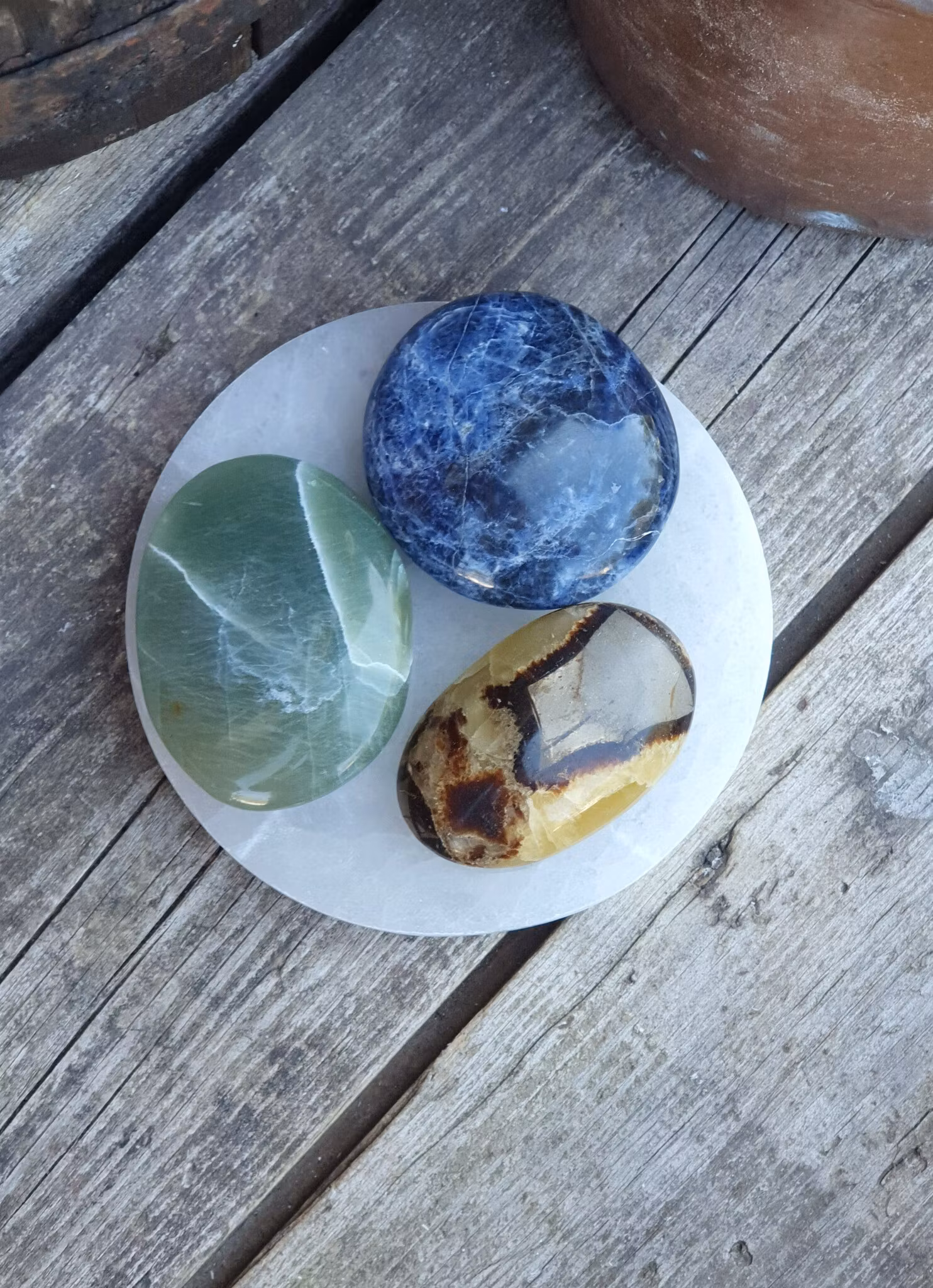 Riktigt stor rund polerad laddningsplatta i Vit Selenit. Helt underbara! Säljes styckvis. De skiftar i utseende. Du köper en slumpvis liknande kristall enligt text & bild ovan. Tänk på att kristaller kommer från naturen & naturliga sprickor & ojämnhet kan förekomma. Färger kan skilja sig beroende på hur ljuset faller ner på kristallen samt även mellan olika bildskärmar m.m.