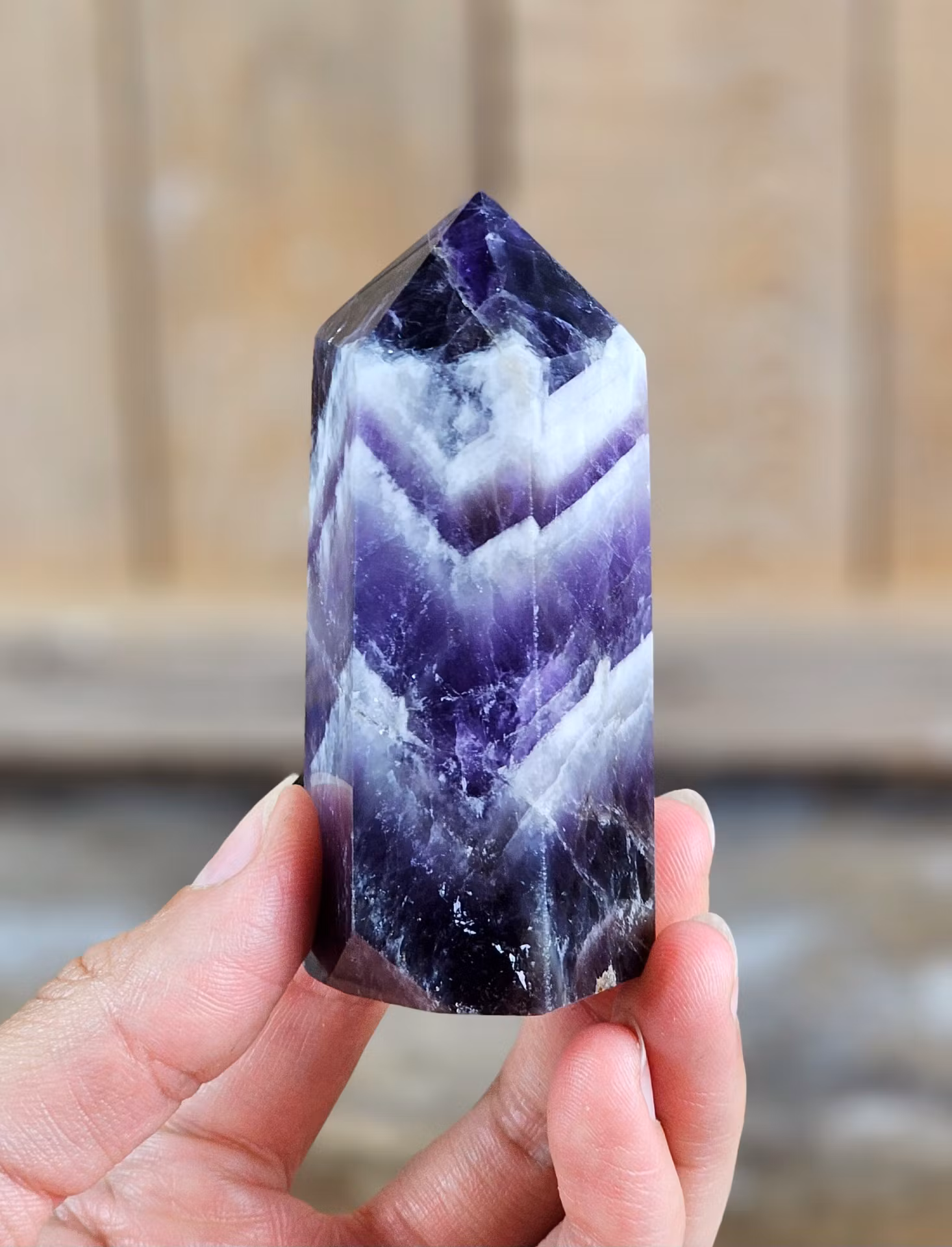 Mycket vacker polerad spets i Chevron Ametist i hög kvalité. Kristallen på bilderna är den du köper. Tänk på att kristaller kommer från naturen, små skillnader kan därför förekomma i produktens utseende på grund av dess naturmaterial. Färger kan skilja sig beroende på hur ljuset faller ner på kristallen samt även mellan olika bildskärmar m.m.