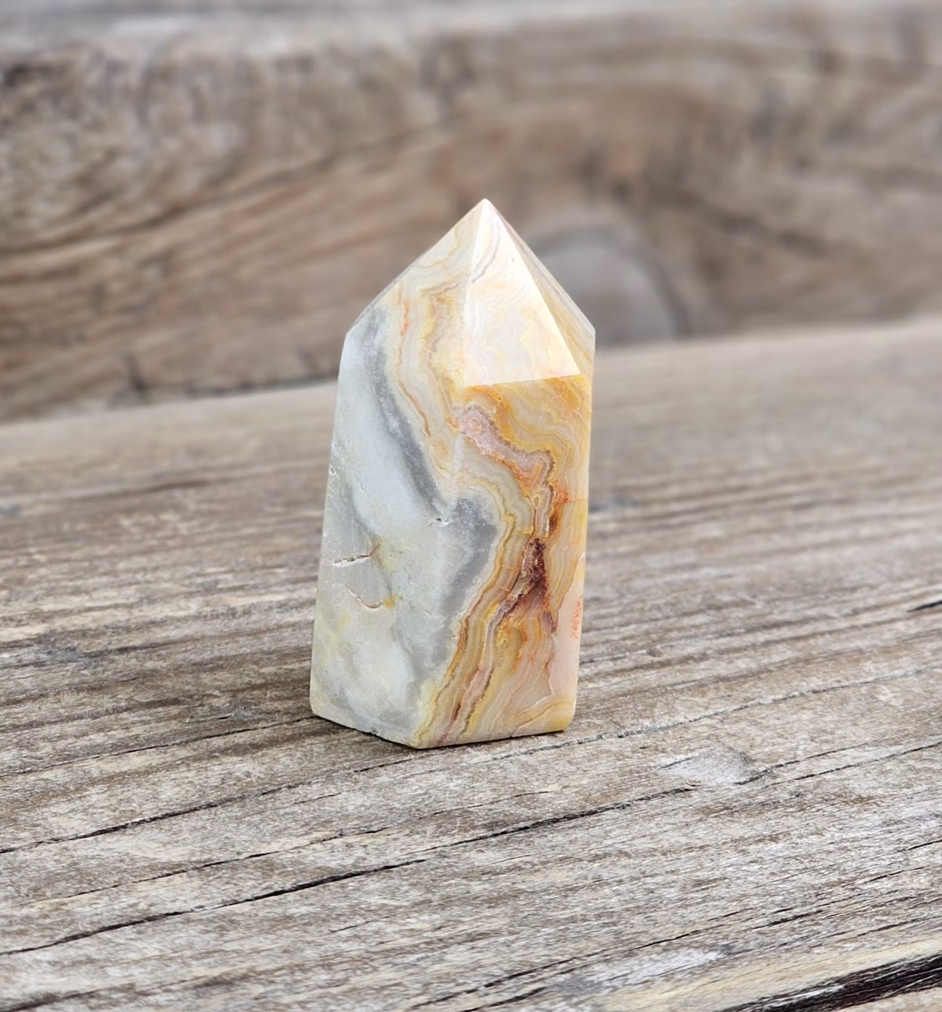 Otroligt fin polerad spets i Crazy Lace Agat. Tänk på att kristaller kommer från naturen & naturliga sprickor & ojämnhet kan förekomma. Färger kan skilja sig beroende på hur ljuset faller ner på kristallen samt även mellan olika bildskärmar m.m.