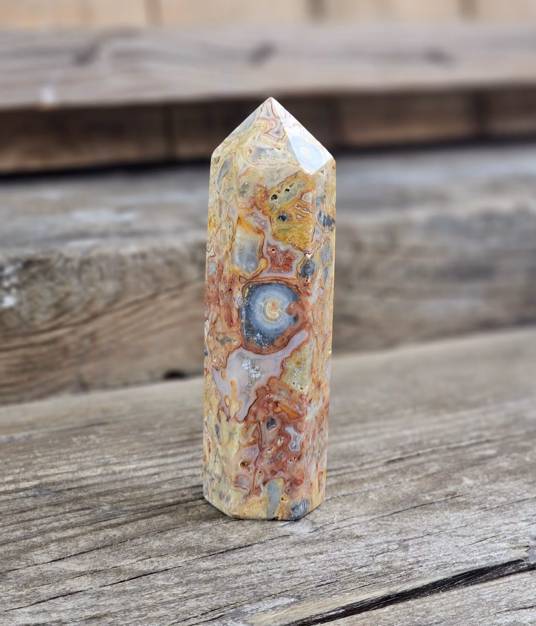 Otroligt fin polerad spets i Crazy Lace Agat. Tänk på att kristaller kommer från naturen & naturliga sprickor & ojämnhet kan förekomma. Färger kan skilja sig beroende på hur ljuset faller ner på kristallen samt även mellan olika bildskärmar m.m.