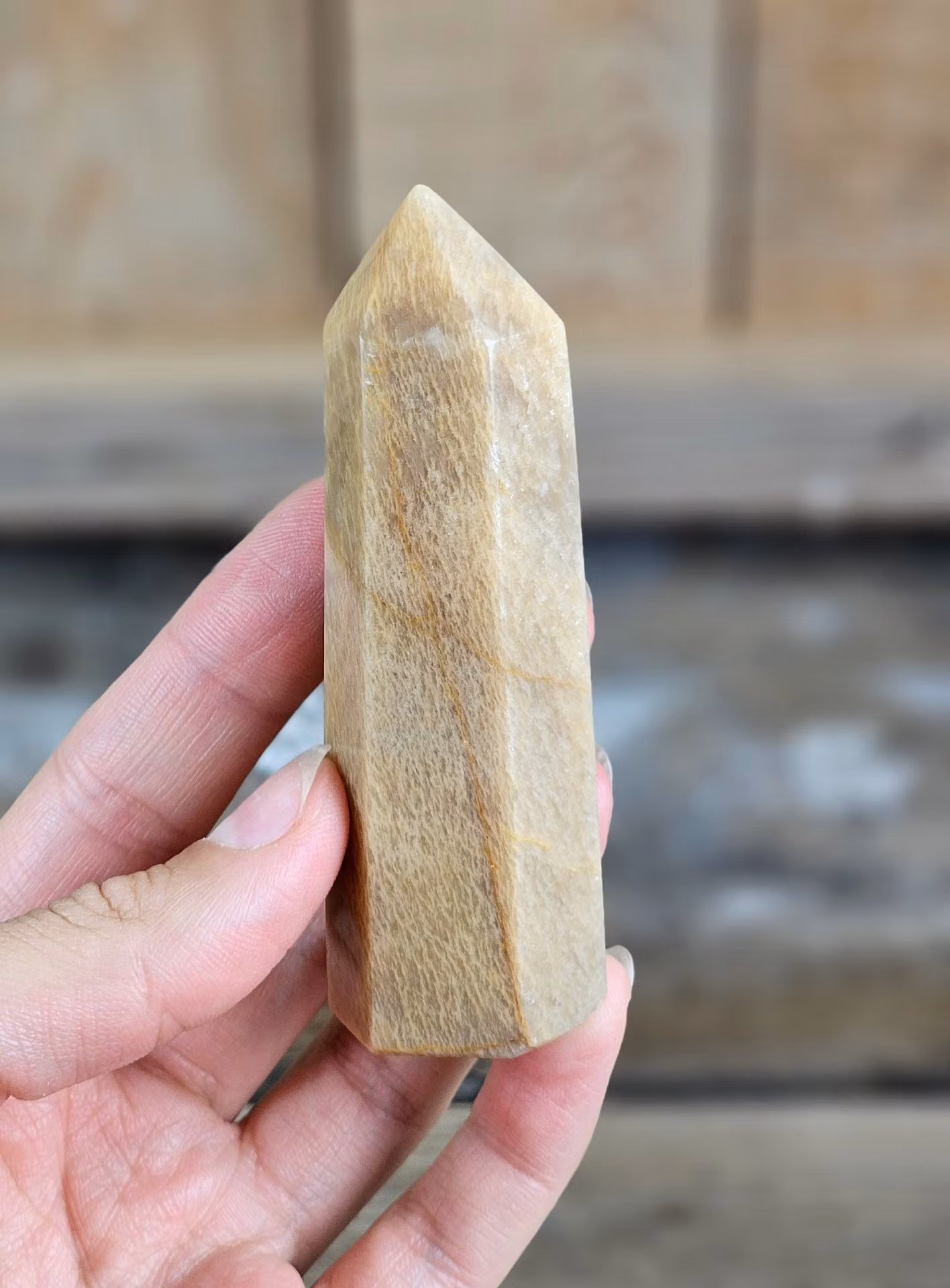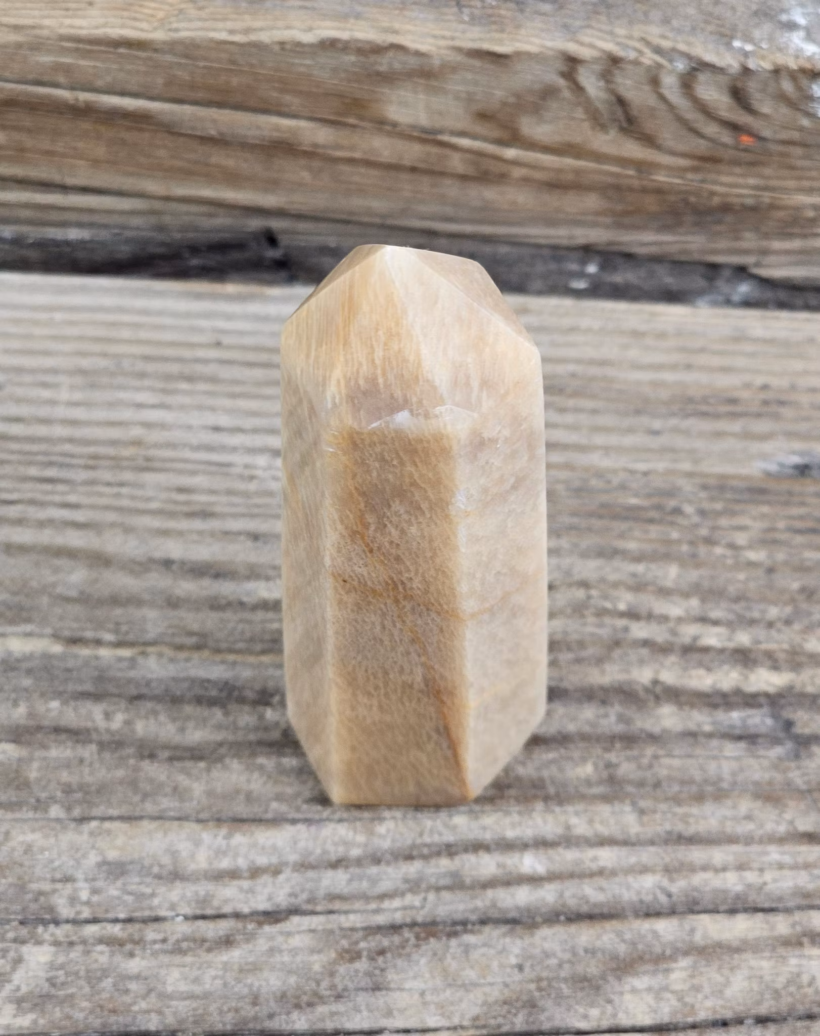 Fin polerad spets i Månsten. Tänk på att kristaller kommer från naturen & naturliga sprickor & ojämnhet kan förekomma. Färger kan skilja sig beroende på hur ljuset faller ner på kristallen samt även mellan olika bildskärmar m.m.