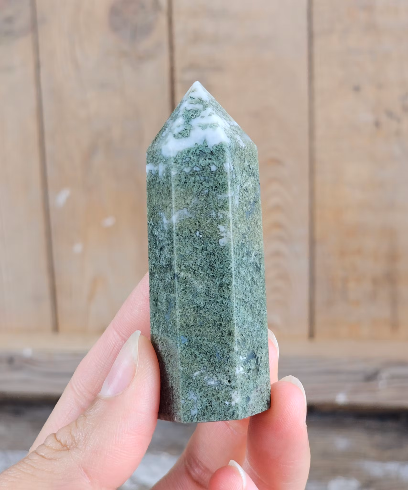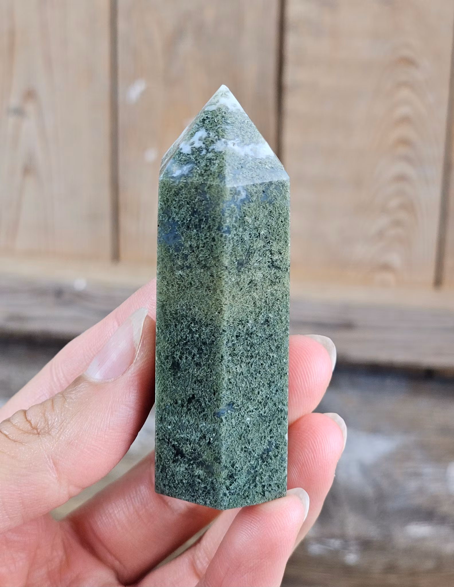 Otroligt fin polerad spets i Mossagat, riktigt hög kvalité. Tänk på att kristaller kommer från naturen & naturliga sprickor & ojämnhet kan förekomma. Färger kan skilja sig beroende på hur ljuset faller ner på kristallen samt även mellan olika bildskärmar m.m.