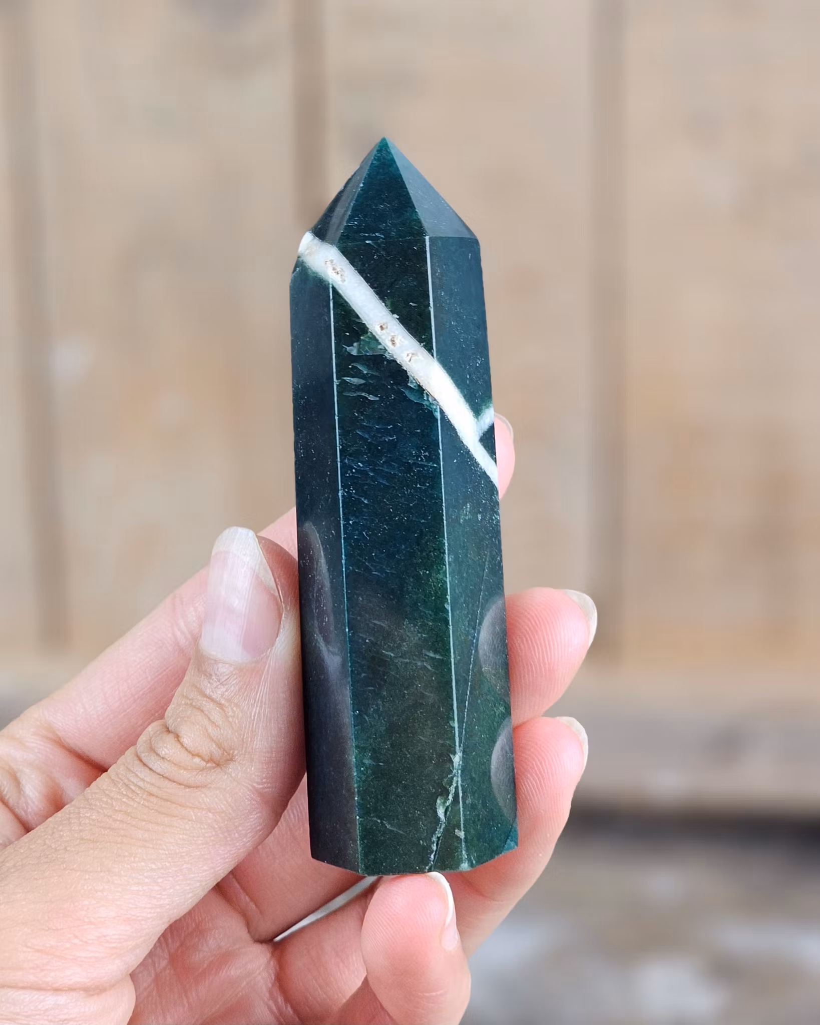 Otroligt fin polerad spets i Mossagat, riktigt hög kvalité. Tänk på att kristaller kommer från naturen & naturliga sprickor & ojämnhet kan förekomma. Färger kan skilja sig beroende på hur ljuset faller ner på kristallen samt även mellan olika bildskärmar m.m.