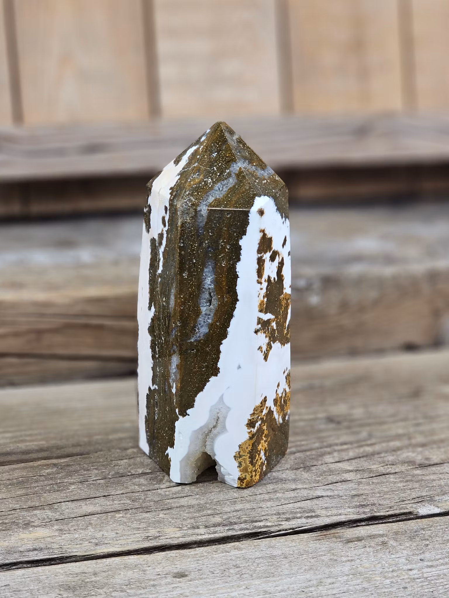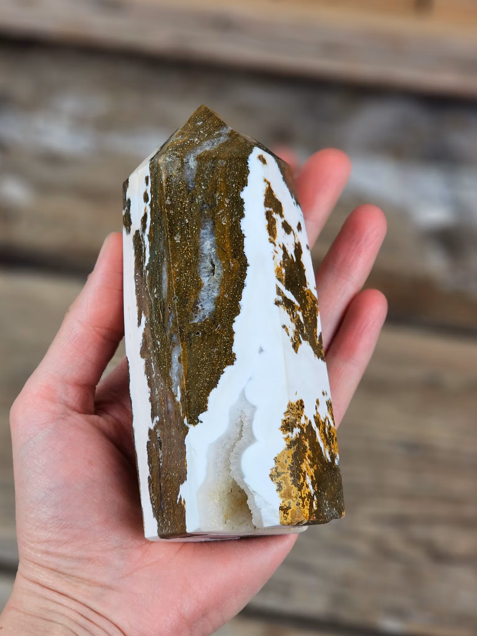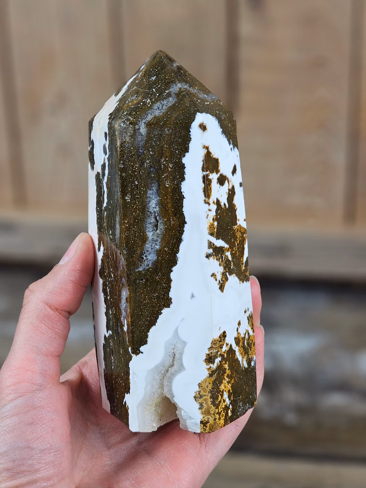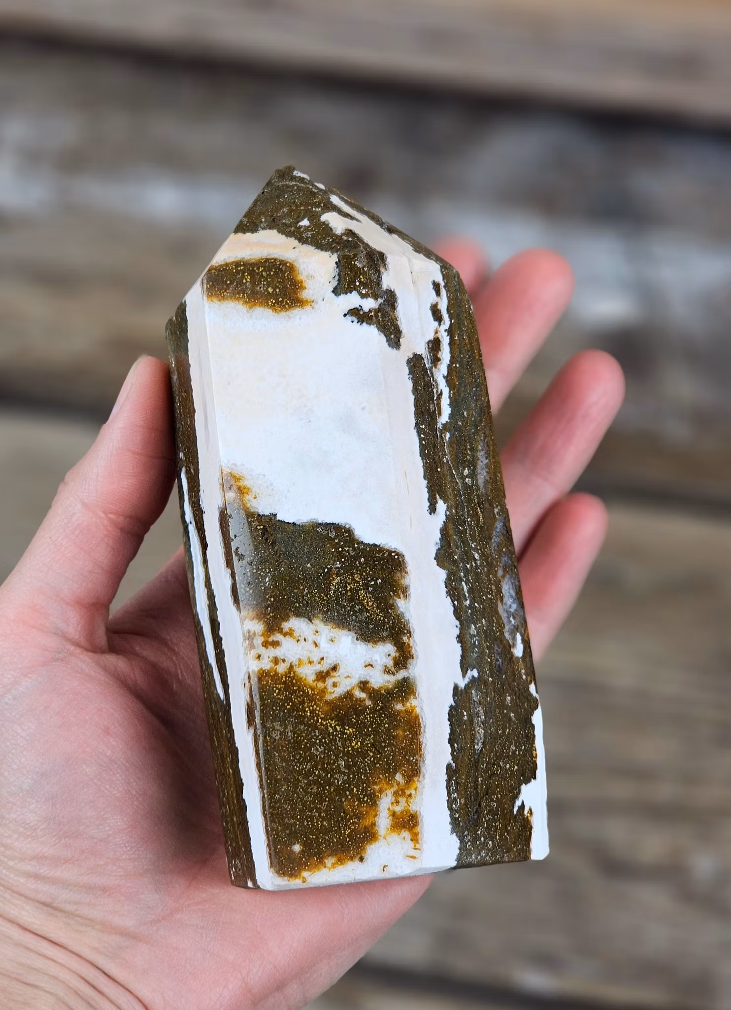 Helt underbar, riktigt stor polerad spets i Oceanjaspis. Tänk på att kristaller kommer från naturen & naturliga sprickor & ojämnhet kan förekomma. Färger kan skilja sig beroende på hur ljuset faller ner på kristallen samt även mellan olika bildskärmar m.m.