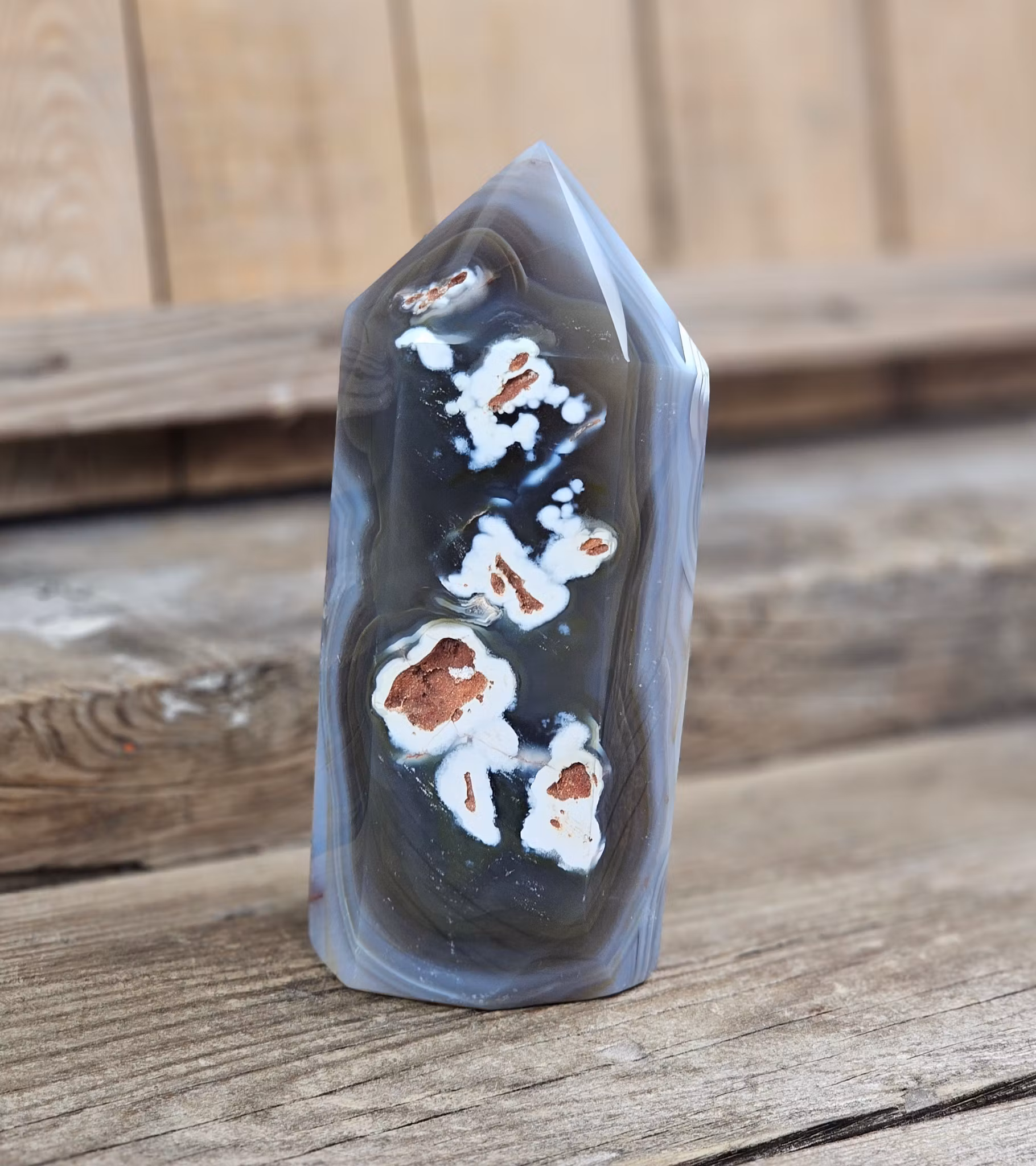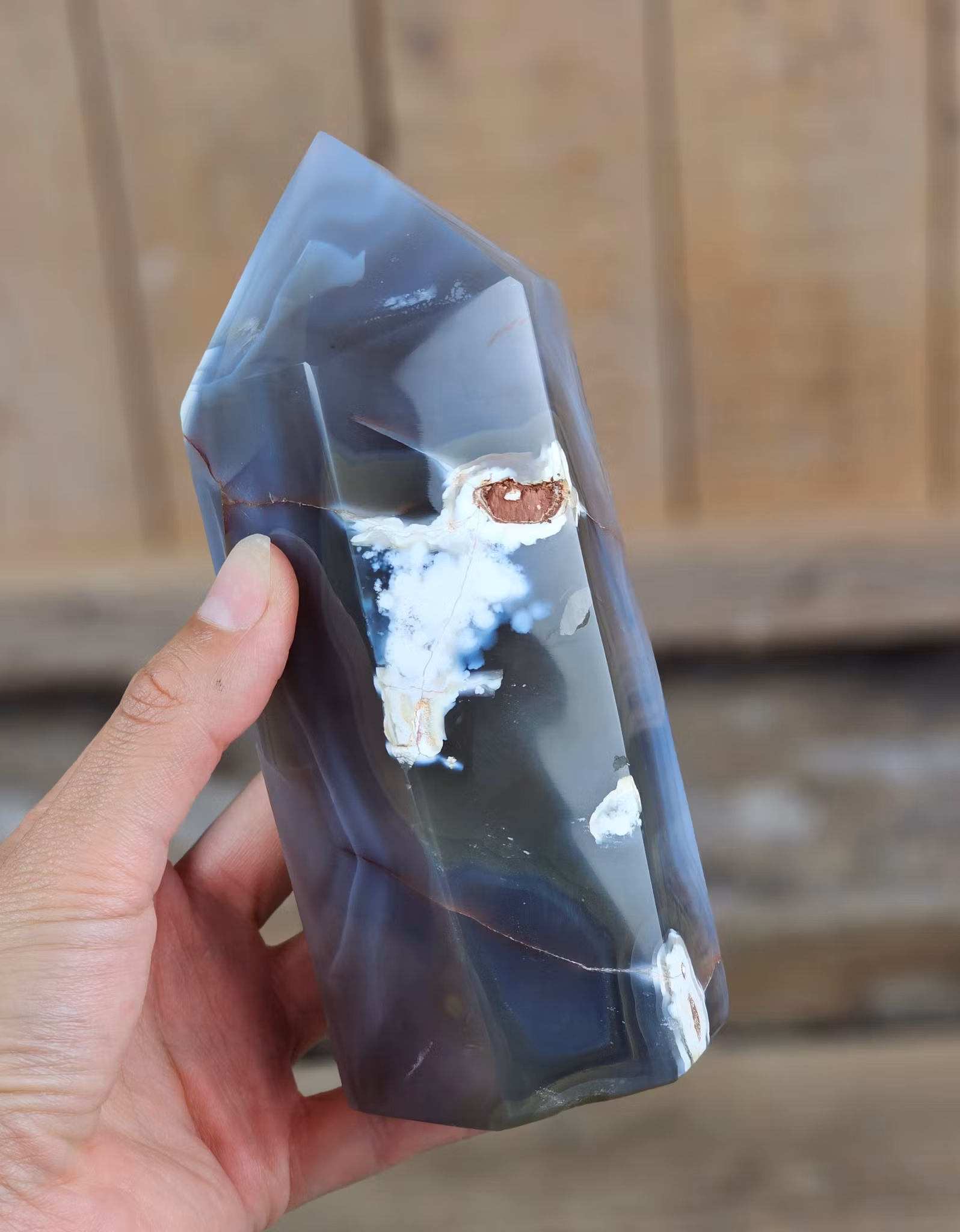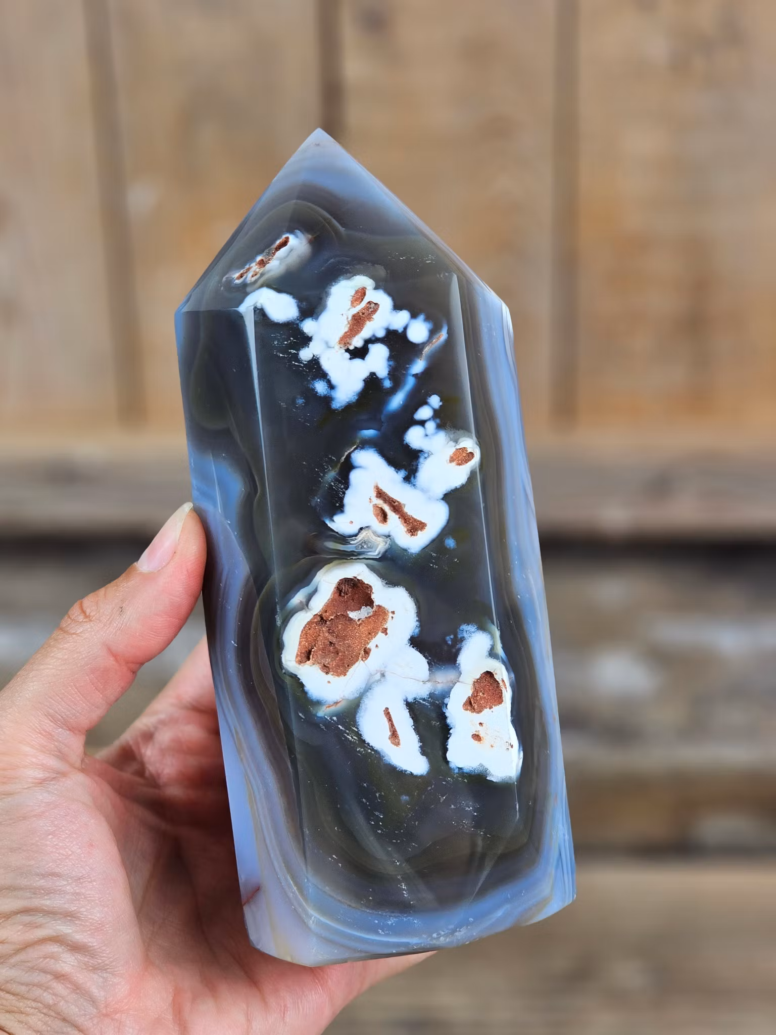 Helt underbar, riktigt stor polerad spets i Orca Agat. Tänk på att kristaller kommer från naturen & naturliga sprickor & ojämnhet kan förekomma. Färger kan skilja sig beroende på hur ljuset faller ner på kristallen samt även mellan olika bildskärmar m.m.