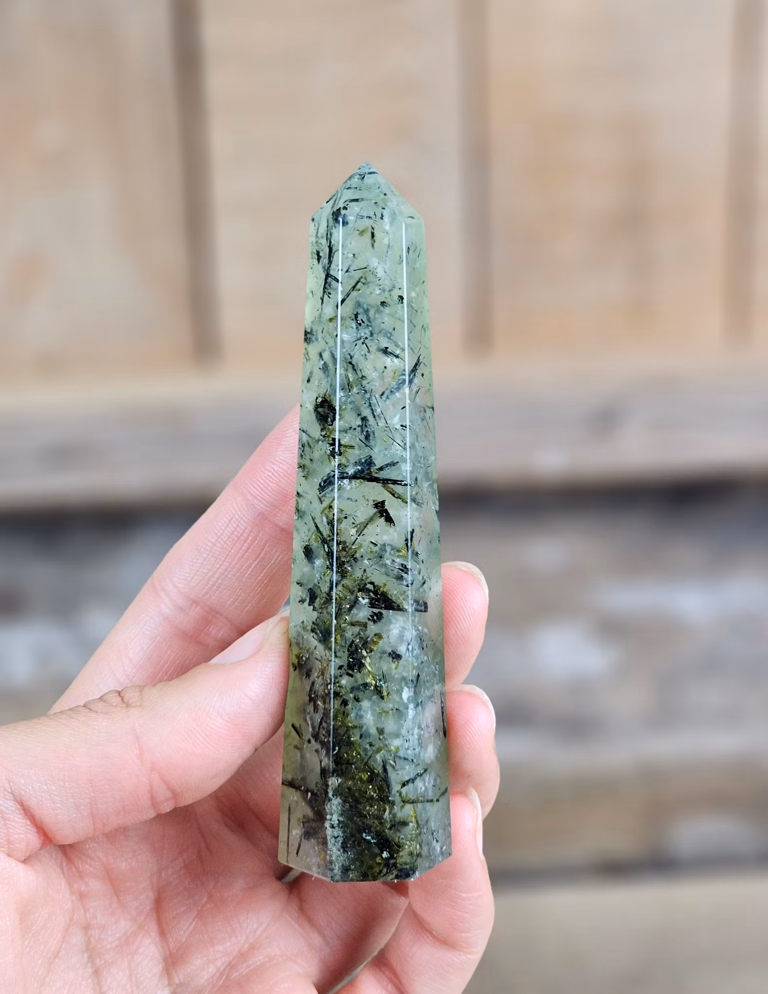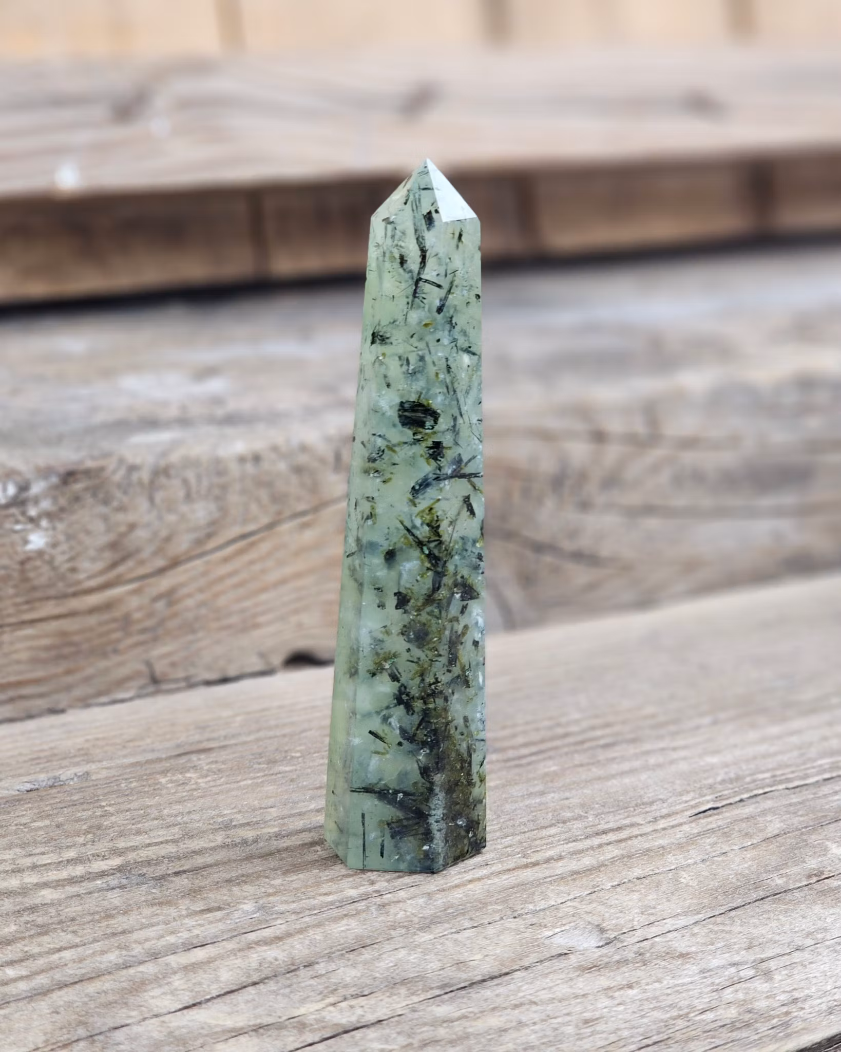 Otroligt fin polerad spets i Prehnit i riktigt hög kvalité. Tänk på att kristaller kommer från naturen & naturliga sprickor & ojämnhet kan förekomma. Färger kan skilja sig beroende på hur ljuset faller ner på kristallen samt även mellan olika bildskärmar m.m.