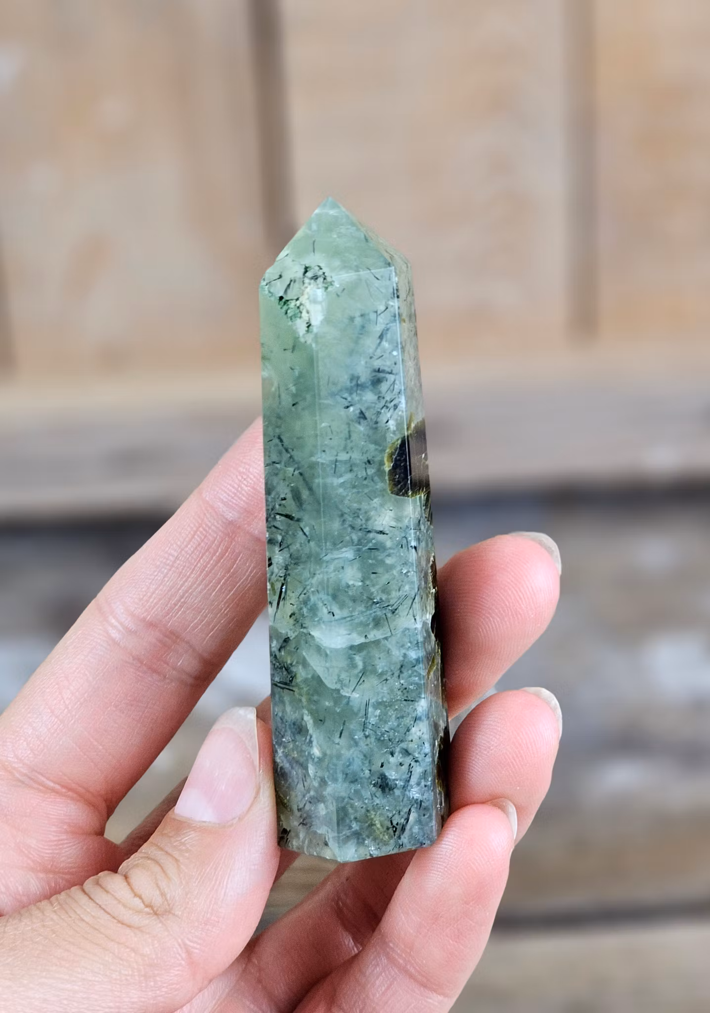 Otroligt fin polerad spets i Prehnit i riktigt hög kvalité. Tänk på att kristaller kommer från naturen & naturliga sprickor & ojämnhet kan förekomma. Färger kan skilja sig beroende på hur ljuset faller ner på kristallen samt även mellan olika bildskärmar m.m.