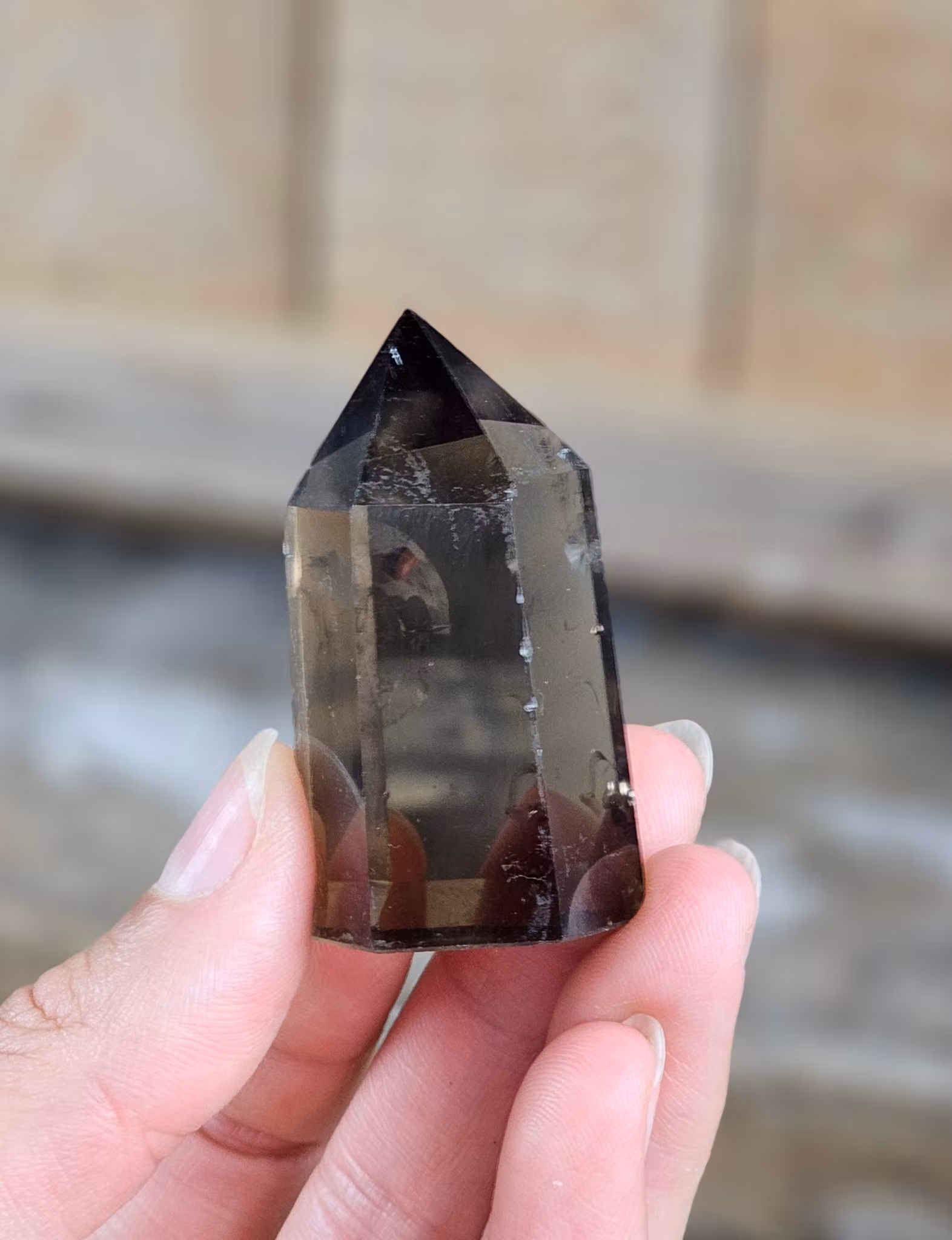 Jättefin polerad spets i Rökkvarts i superfin kvalité. Kristallen på bilderna är den du köper. Tänk på att kristaller kommer från naturen, små skillnader kan därför förekomma i produktens utseende på grund av dess naturmaterial. Färger kan skilja sig beroende på hur ljuset faller ner på kristallen samt även mellan olika bildskärmar m.m.