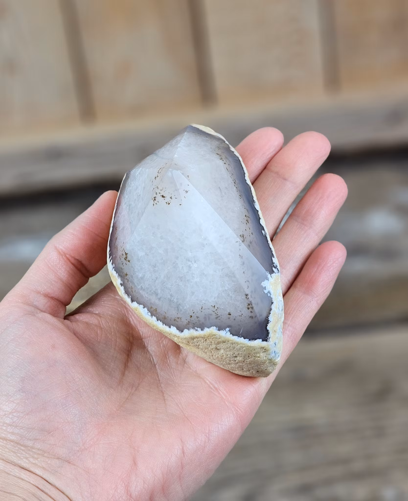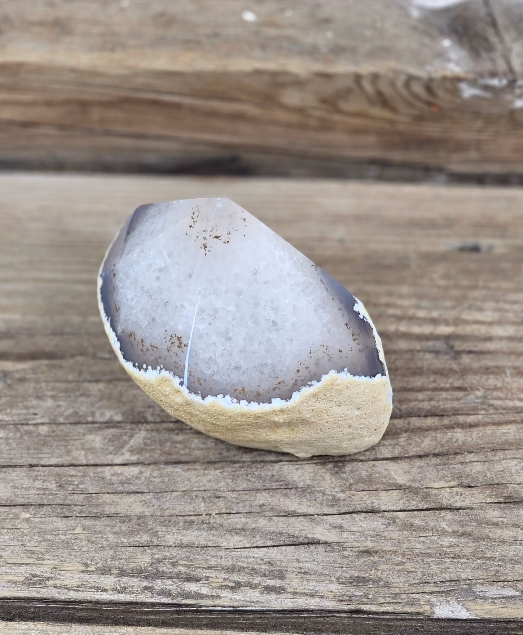 Mycket vacker stående polerad spets i Agat med råa sidor. Superhärligt exemplar med massor av vacker kvarts! Kristallen på bilderna är den du köper. Tänk på att kristaller kommer från naturen, små skillnader kan därför förekomma i produktens utseende på grund av dess naturmaterial. Färger kan skilja sig beroende på hur ljuset faller ner på kristallen samt även mellan olika bildskärmar m.m.