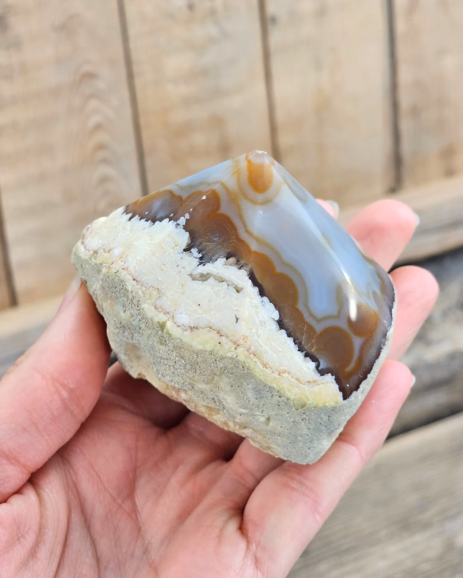 Observera att det finns ett nagg i spetsen. Därav prissänkt med -30% från ordinarie pris. Mycket vacker stående polerad spets i Agat med råa sidor. Superhärligt exemplar! Kristallen på bilderna är den du köper. Tänk på att kristaller kommer från naturen, små skillnader kan därför förekomma i produktens utseende på grund av dess naturmaterial. Färger kan skilja sig beroende på hur ljuset faller ner på kristallen samt även mellan olika bildskärmar m.m.