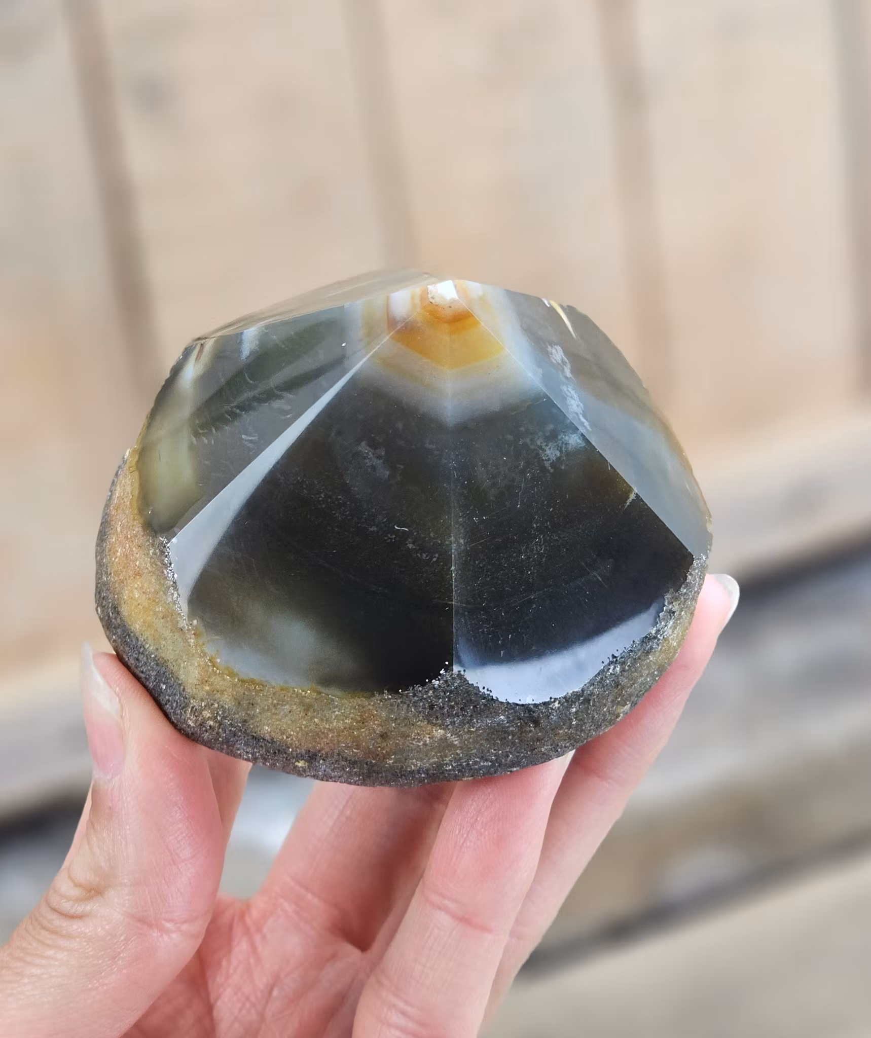 Mycket vacker stående polerad spets i Agat med råa sidor. Superhärligt exemplar! Kristallen på bilderna är den du köper. Tänk på att kristaller kommer från naturen, små skillnader kan därför förekomma i produktens utseende på grund av dess naturmaterial. Färger kan skilja sig beroende på hur ljuset faller ner på kristallen samt även mellan olika bildskärmar m.m.
