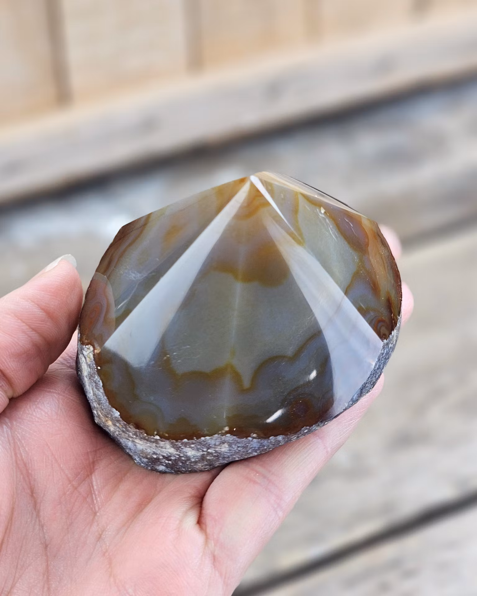 Mycket vacker stående polerad spets i Agat med råa sidor. Superhärligt exemplar! Kristallen på bilderna är den du köper. Tänk på att kristaller kommer från naturen, små skillnader kan därför förekomma i produktens utseende på grund av dess naturmaterial. Färger kan skilja sig beroende på hur ljuset faller ner på kristallen samt även mellan olika bildskärmar m.m.