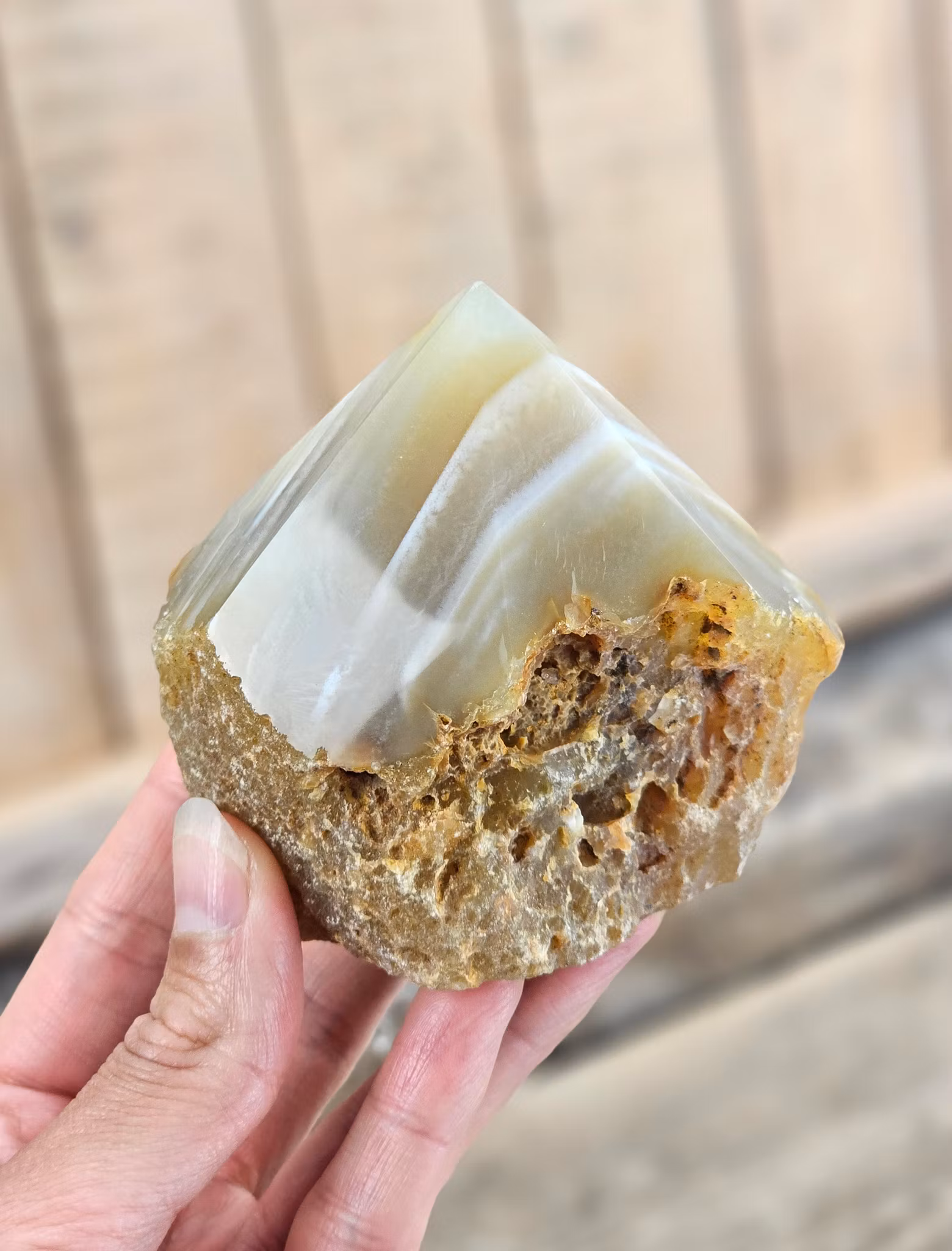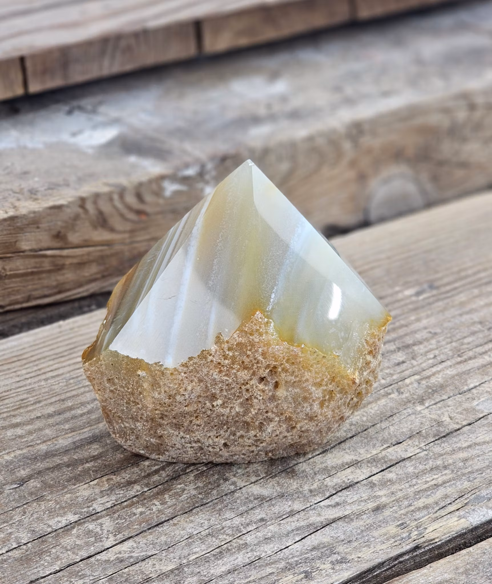 Mycket vacker stående polerad spets i Agat med råa sidor. Superhärligt exemplar! Kristallen på bilderna är den du köper. Tänk på att kristaller kommer från naturen, små skillnader kan därför förekomma i produktens utseende på grund av dess naturmaterial. Färger kan skilja sig beroende på hur ljuset faller ner på kristallen samt även mellan olika bildskärmar m.m.