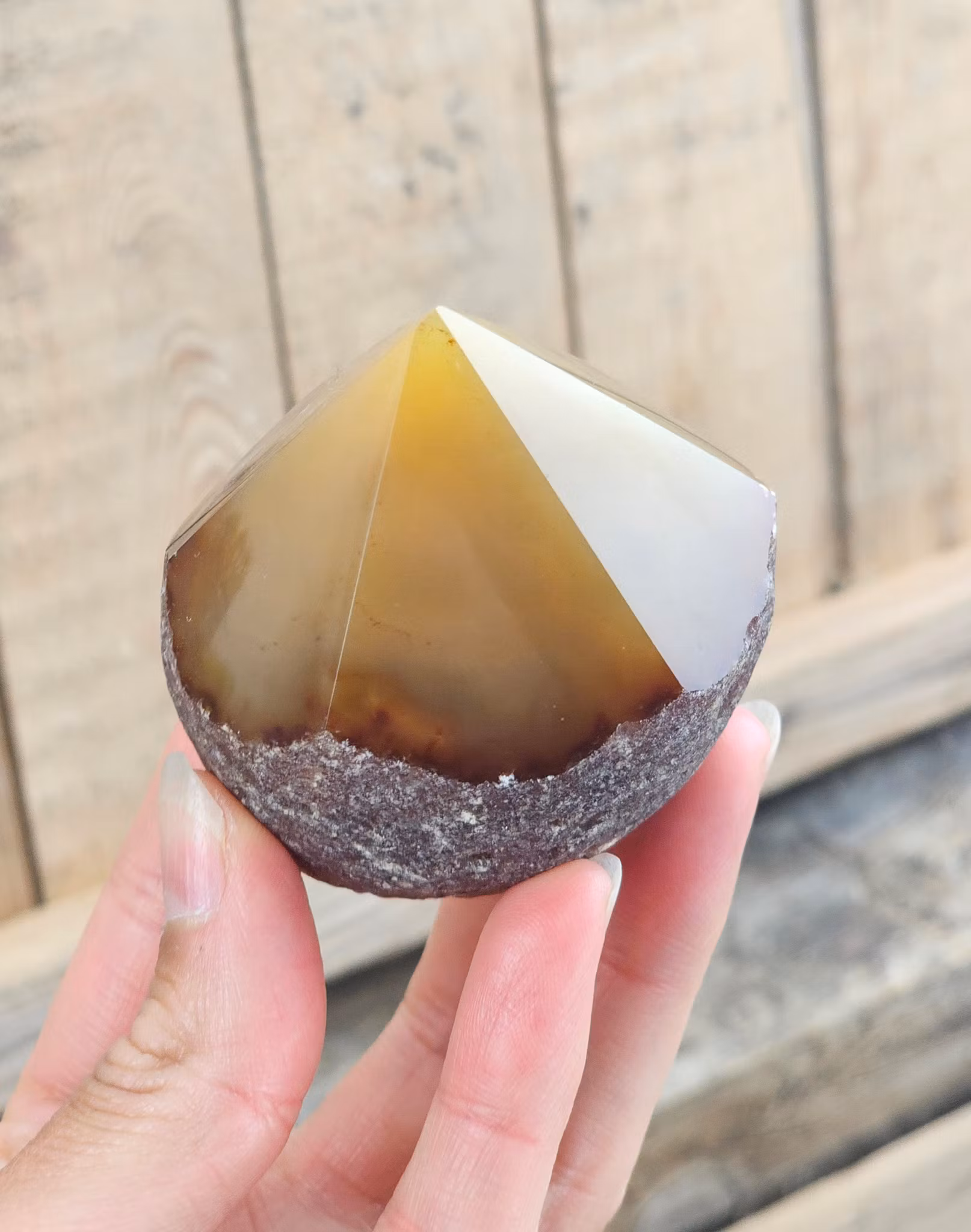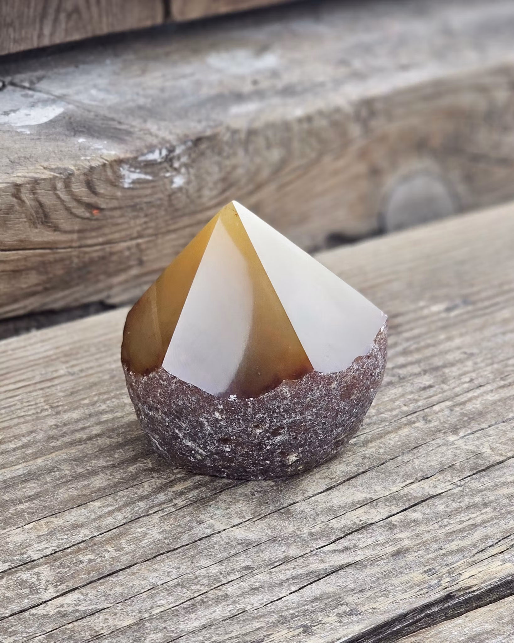 Mycket vacker stående polerad spets i Agat med råa sidor. Superhärligt exemplar! Kristallen på bilderna är den du köper. Tänk på att kristaller kommer från naturen, små skillnader kan därför förekomma i produktens utseende på grund av dess naturmaterial. Färger kan skilja sig beroende på hur ljuset faller ner på kristallen samt även mellan olika bildskärmar m.m.