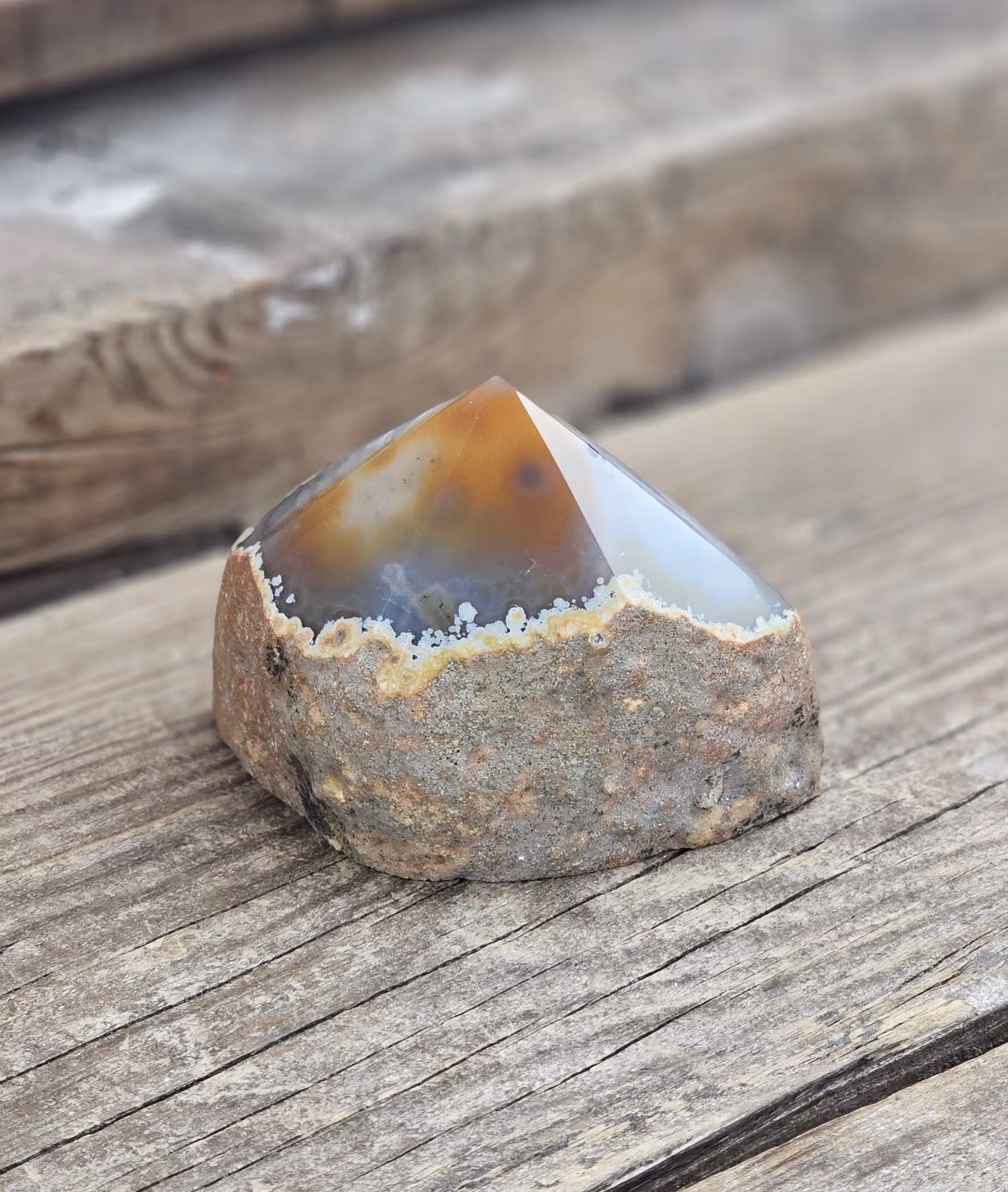 Mycket vacker stående polerad spets i Agat med råa sidor. Superhärligt exemplar! Kristallen på bilderna är den du köper. Tänk på att kristaller kommer från naturen, små skillnader kan därför förekomma i produktens utseende på grund av dess naturmaterial. Färger kan skilja sig beroende på hur ljuset faller ner på kristallen samt även mellan olika bildskärmar m.m.