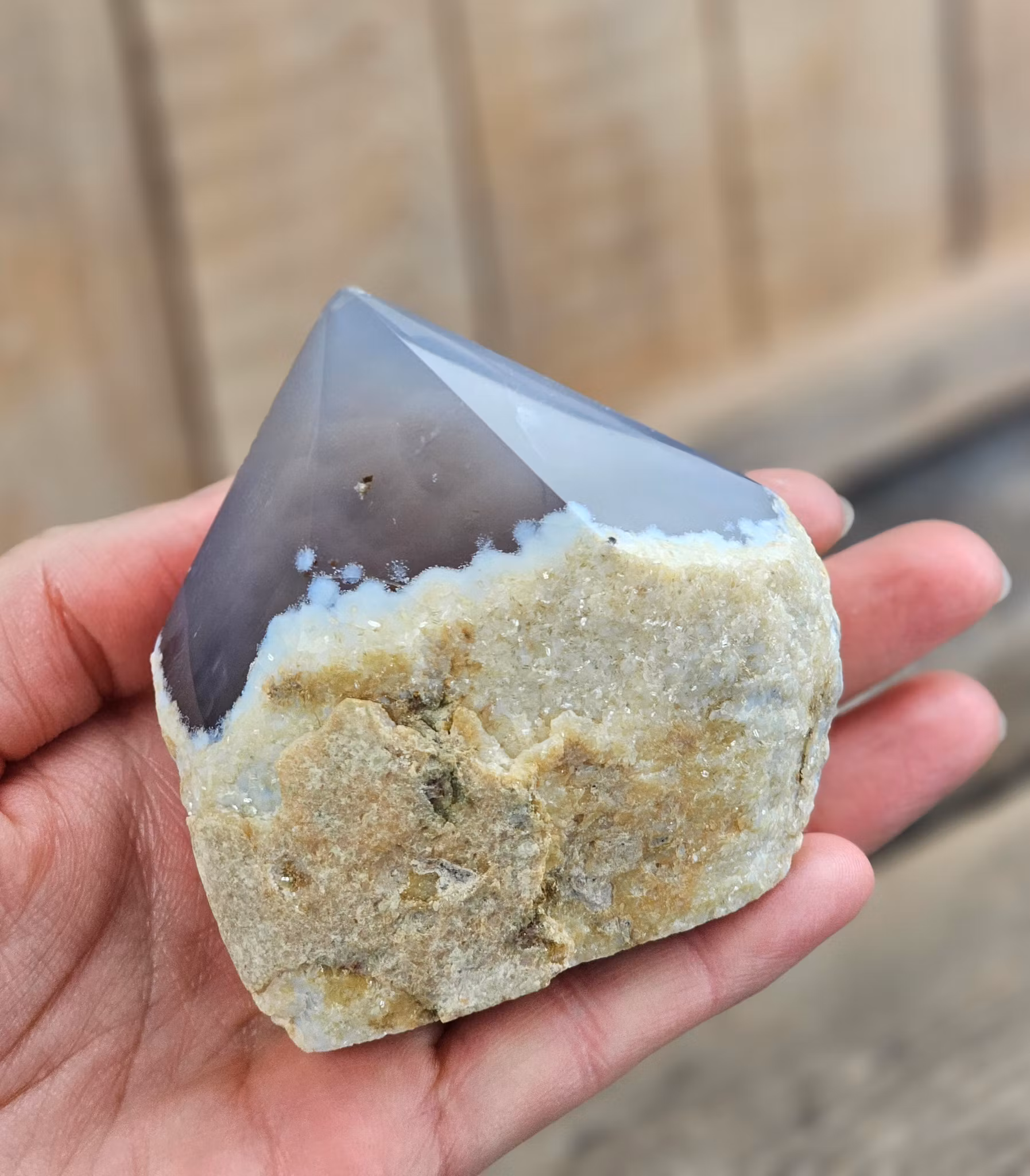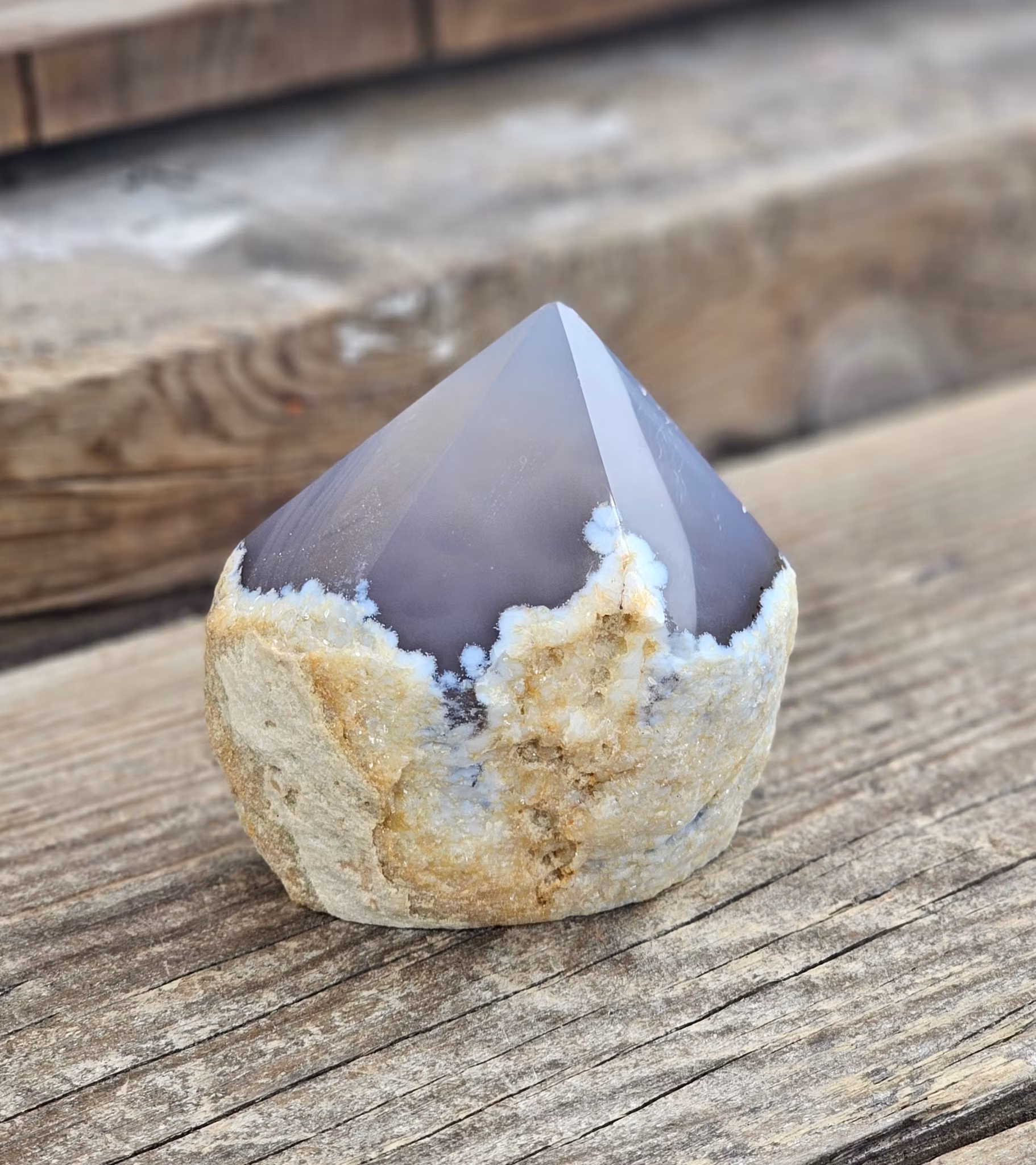 Mycket vacker stående polerad spets i Agat med råa sidor. Superhärligt exemplar! Kristallen på bilderna är den du köper. Tänk på att kristaller kommer från naturen, små skillnader kan därför förekomma i produktens utseende på grund av dess naturmaterial. Färger kan skilja sig beroende på hur ljuset faller ner på kristallen samt även mellan olika bildskärmar m.m.
