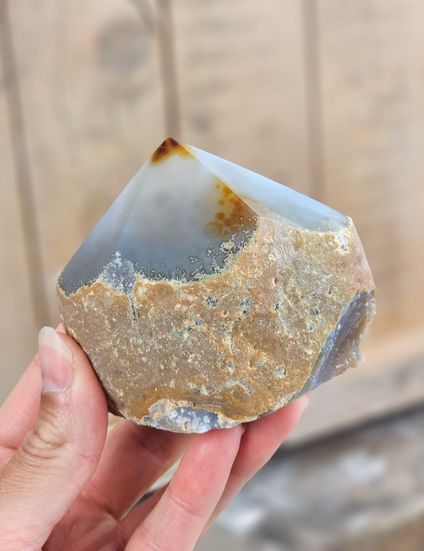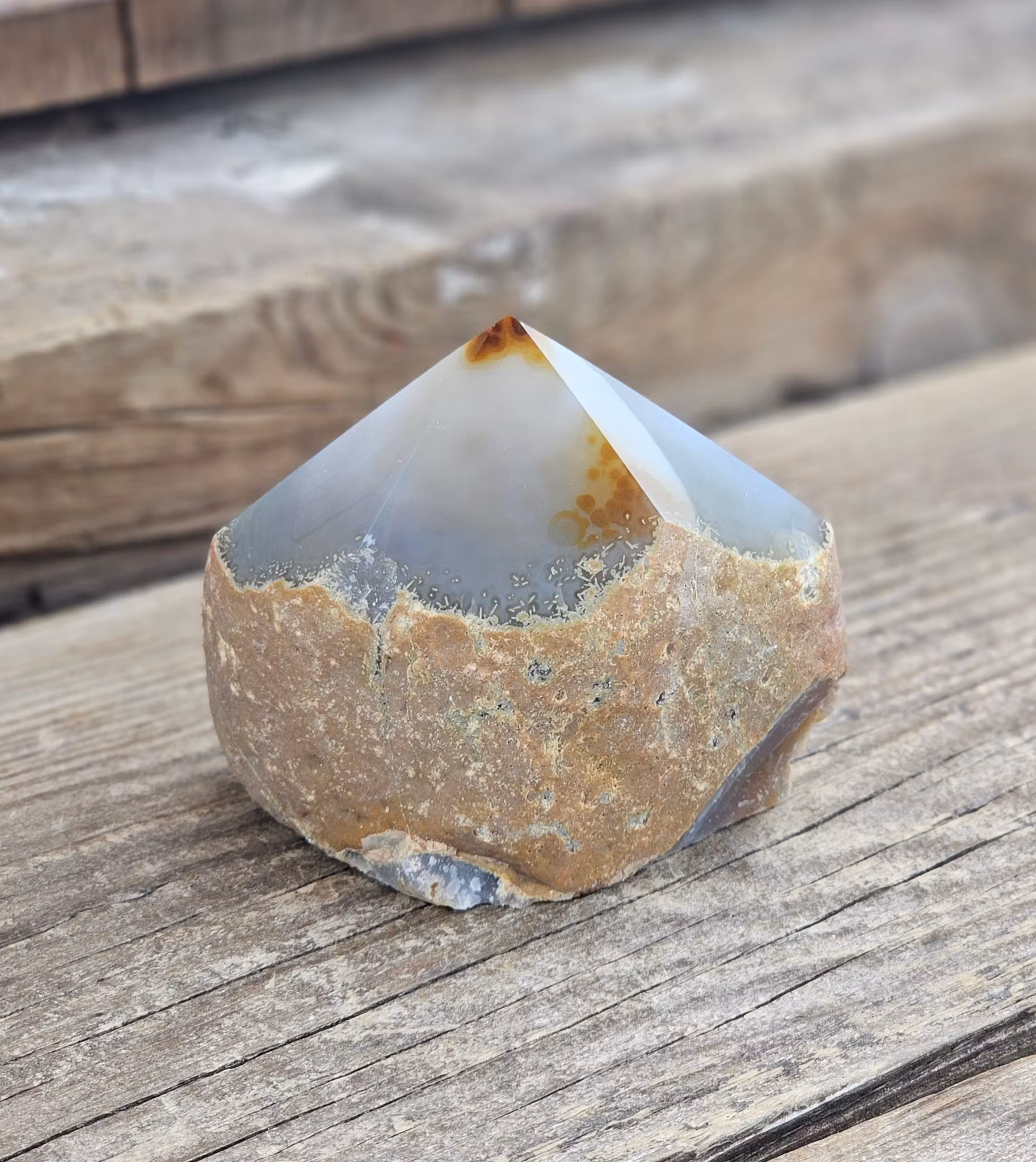 Mycket vacker stående polerad spets i Agat med råa sidor. Superhärligt exemplar! Kristallen på bilderna är den du köper. Tänk på att kristaller kommer från naturen, små skillnader kan därför förekomma i produktens utseende på grund av dess naturmaterial. Färger kan skilja sig beroende på hur ljuset faller ner på kristallen samt även mellan olika bildskärmar m.m.