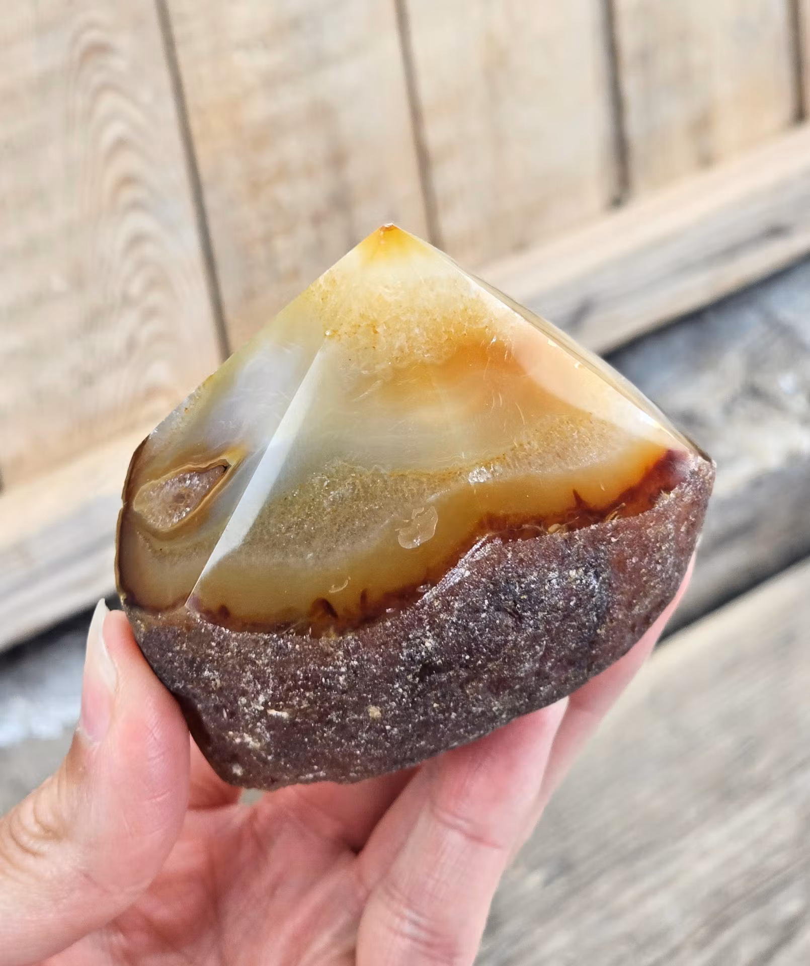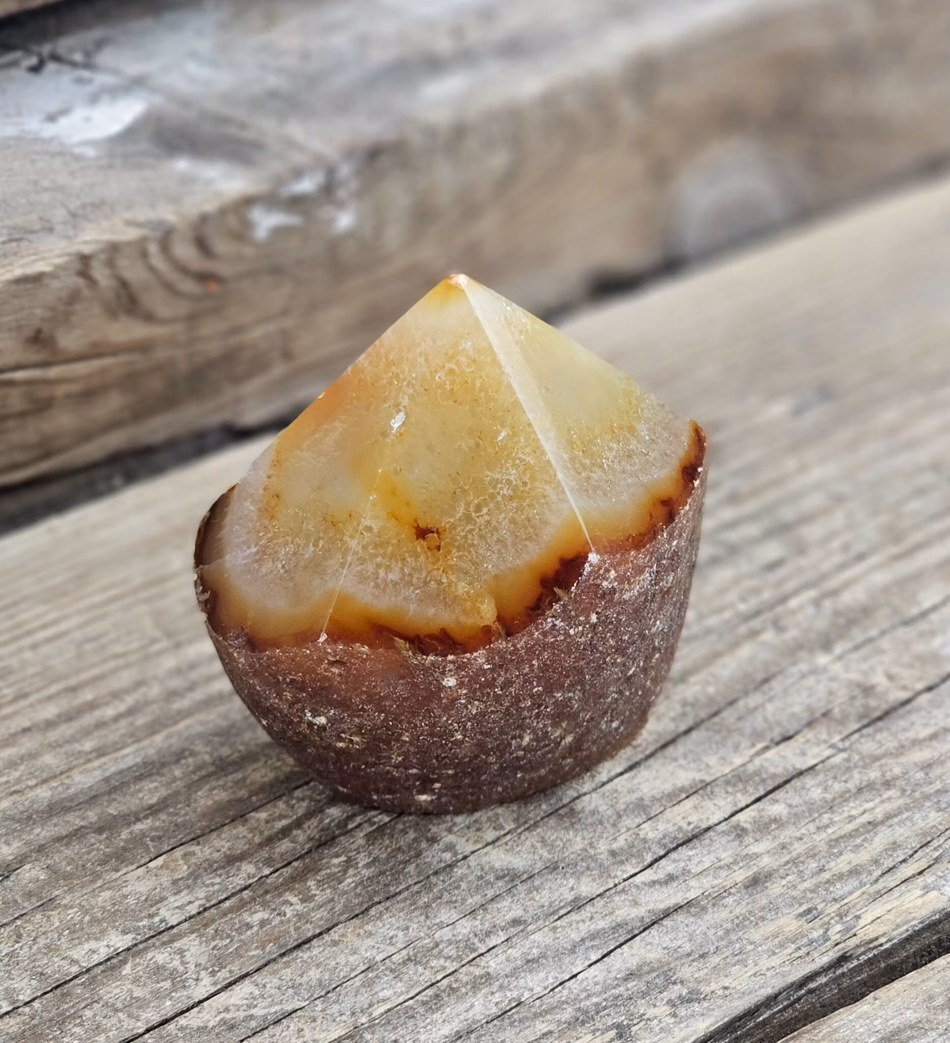 Mycket vacker stående polerad spets i Agat med råa sidor. Superhärligt exemplar! Kristallen på bilderna är den du köper. Tänk på att kristaller kommer från naturen, små skillnader kan därför förekomma i produktens utseende på grund av dess naturmaterial. Färger kan skilja sig beroende på hur ljuset faller ner på kristallen samt även mellan olika bildskärmar m.m.