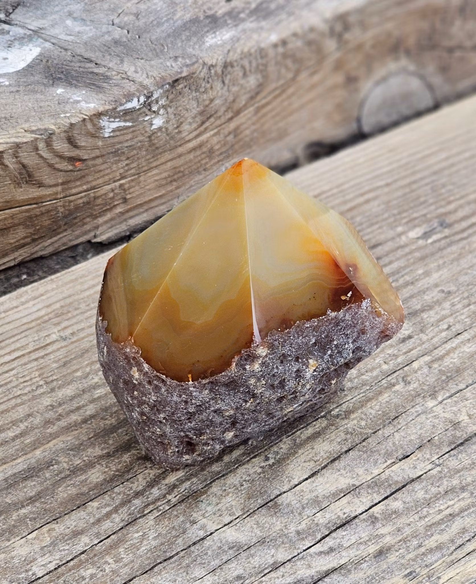 Mycket vacker stående polerad spets i Agat med råa sidor. Superhärligt exemplar! Kristallen på bilderna är den du köper. Tänk på att kristaller kommer från naturen, små skillnader kan därför förekomma i produktens utseende på grund av dess naturmaterial. Färger kan skilja sig beroende på hur ljuset faller ner på kristallen samt även mellan olika bildskärmar m.m.