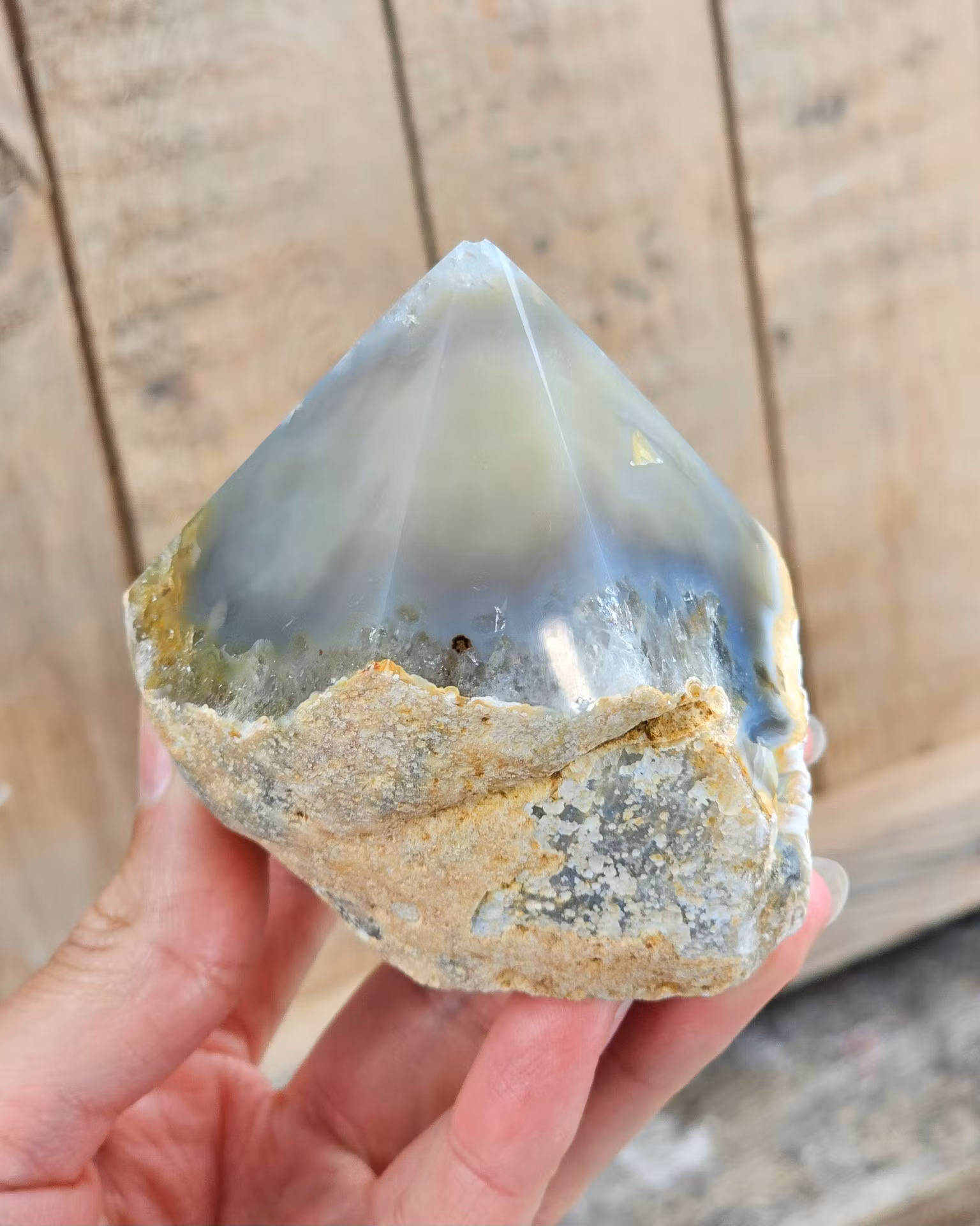 Observera att det finns ett nagg i spetsen. Därav prissänkt med -30% från ordinarie pris. Mycket vacker stående polerad spets i Agat med råa sidor. Superhärligt exemplar! Kristallen på bilderna är den du köper. Tänk på att kristaller kommer från naturen, små skillnader kan därför förekomma i produktens utseende på grund av dess naturmaterial. Färger kan skilja sig beroende på hur ljuset faller ner på kristallen samt även mellan olika bildskärmar m.m.